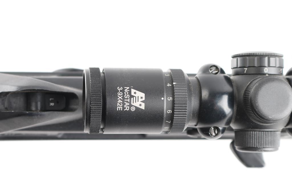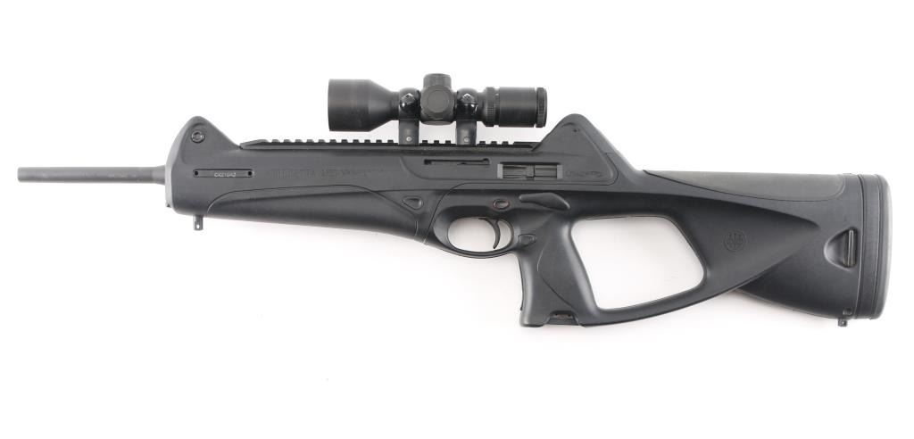 Italian made semi-automatic tactical carbine chambered in 9mmx19. Features a matte black finished 16.6" barrel, shrouded adjustable post front sight, shrouded flip-up dual aperture rear sight, single stage smooth polymer trigger, aluminum picatinney scope rail, swivel studs, 17 round factory magazine, black polymer stock with rubber cheek rest & recoil pad and reversible charging handle, safety lever and magazine release. Includes the original factory hard case with unmarked spare magazine and one spare factory magazine, (3) total. Mounted with a NcSTAR 3-9X42E scope with Mil-Dot reticle, clear optics. Rifle exhibits little wear, like new condition. Action is smooth, bore is excellent and polymer is fineCondition is NRA Excellent in box. Modern Firearm.