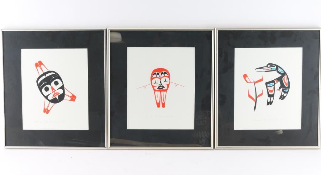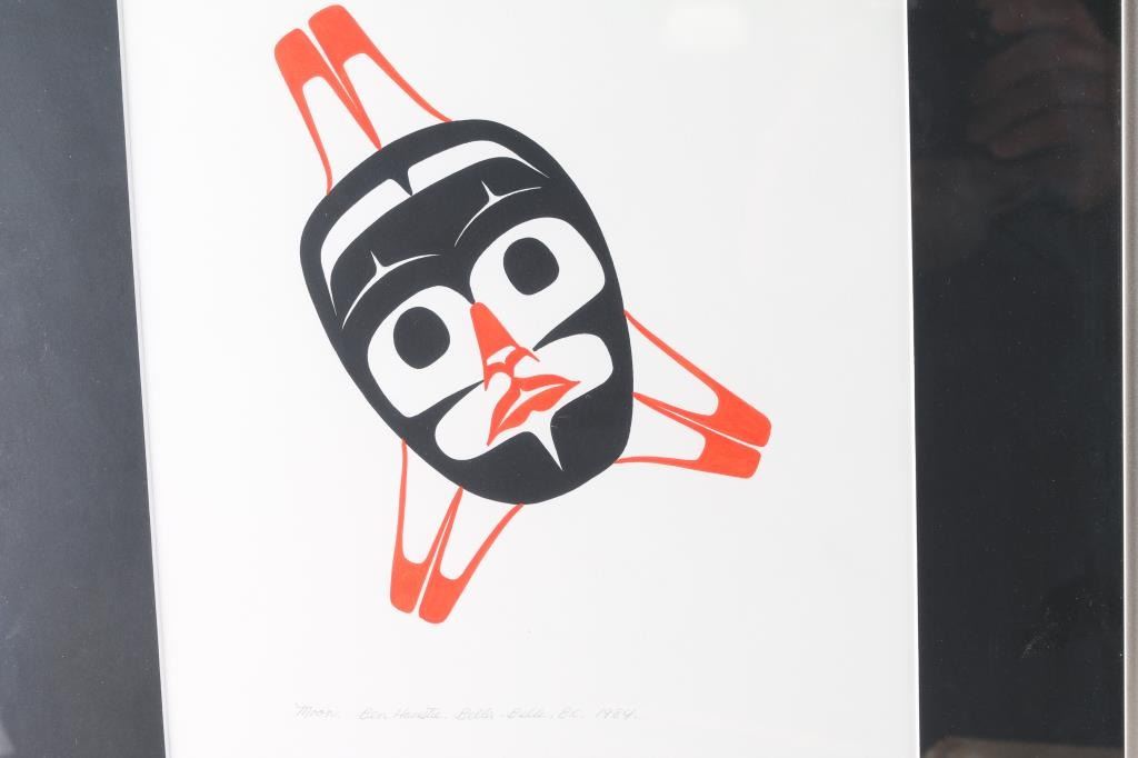 (1) Wood Wall Hanging "The Whale" by Harold Gregory 13"x10; (1)Tlingit Whale by Harold Gregory 16"x7"; (1) Kwakiutl Raven Wood wall hanging 18"x5"; (1) Dog Fish Wood Wall Hanging by Harol Gregory 17"x7"; (3) Fine Art Prints by Ben Houstie 11"x9".