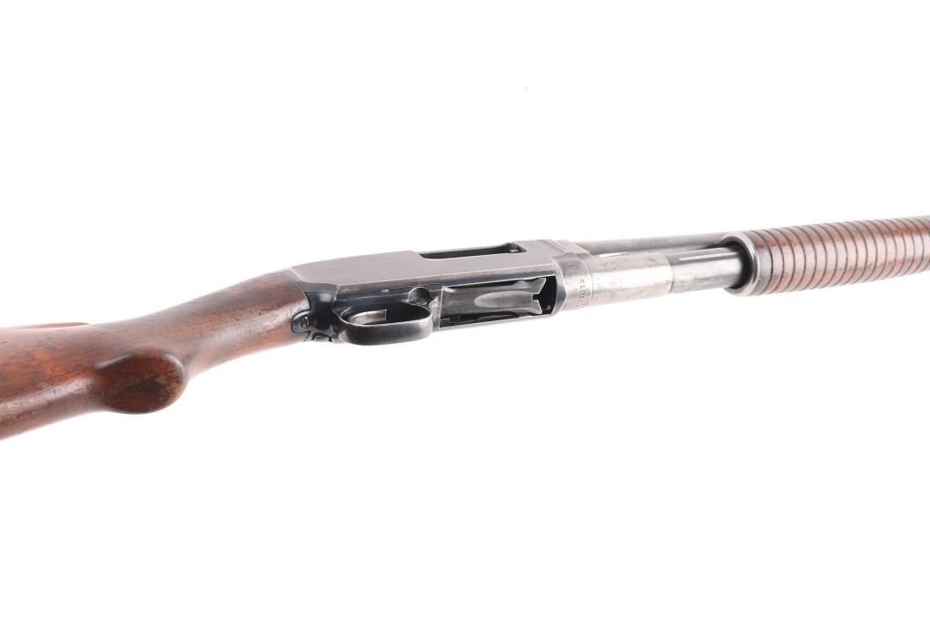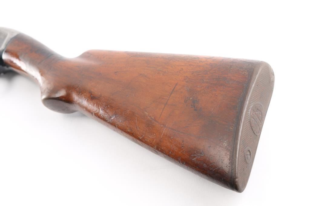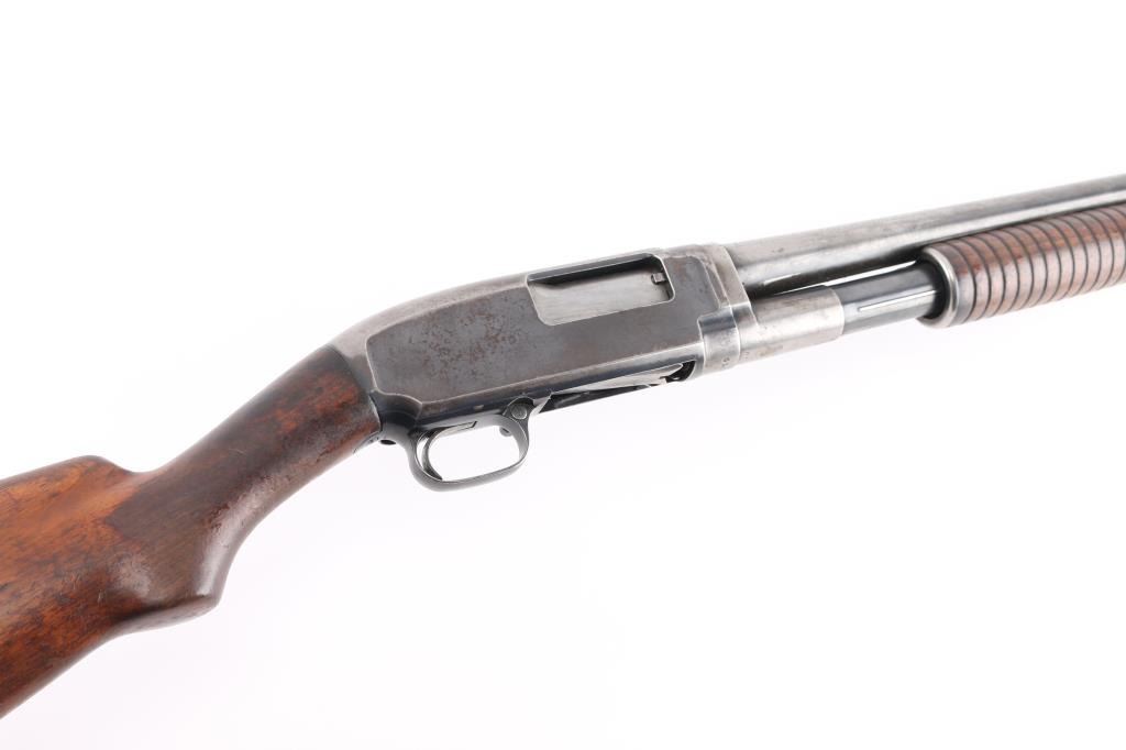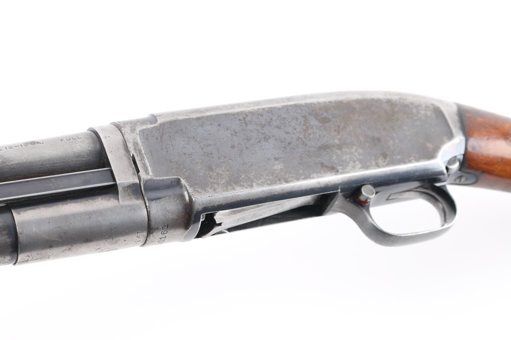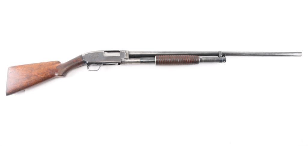Vintage American made pump action shotgun for 12 gauge shotshells in 2 3/4" chamber, circa 1929. Features a 30" blued barrel with an aluminum front bead sight, smooth trigger, checkered push button safety. Two piece wood stocks with grooved slide handle and walnut butt stock with factory hard rubber buttplate. Numbers match on barrel and receiver. Retains approximately 30% of its finish with handling loss on receiver, mag tube and barrel. Scattered light pin-prick pitting on the receiver. Good/sound wood stocks with many minor dings and scratches. Bore is very good and bright. Action is tight. LOP is 13 3/4". Fixed choke is marked Full on the barrel.Condition is NRA Good. C&R Firearm.