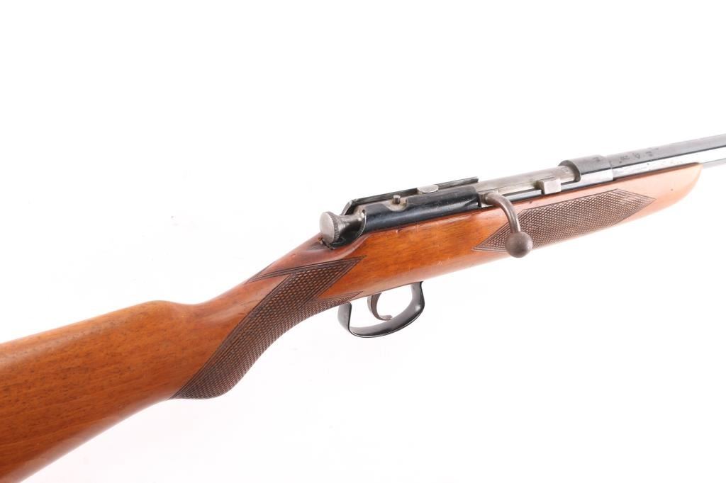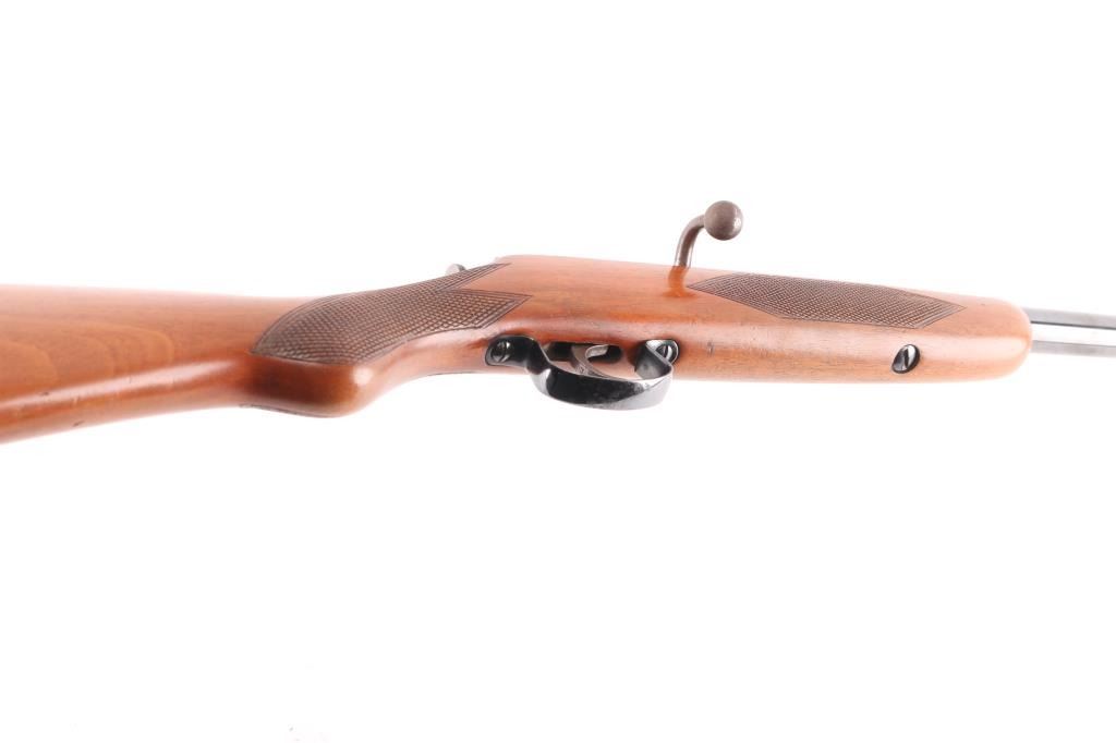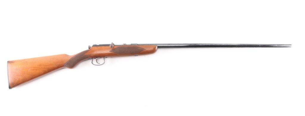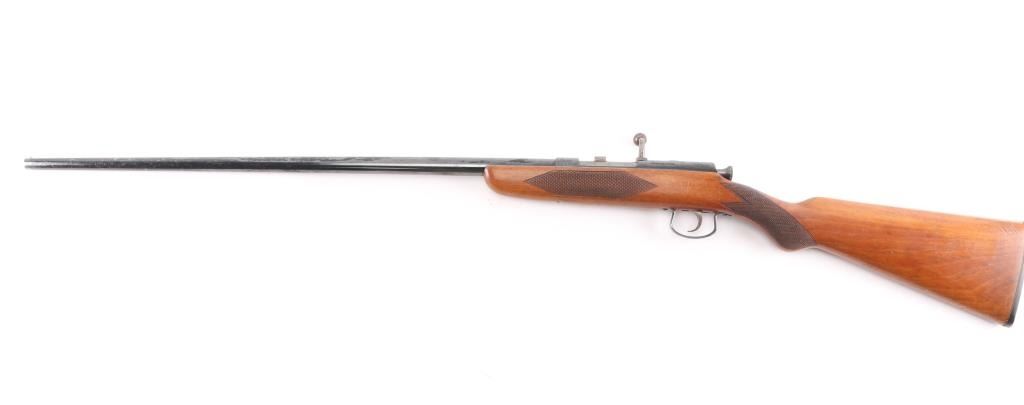 English made bolt-action, single-shot .410 Ga. shotgun chambered for 2 1/2" shells. 25 1/2" barrel, one piece wood stock with checkering on the wrist and forearm, factory black plastic buttplate. Birmingham proofed. Black baked enamel finish is mostly all there with scattered handling loss on the barrel, action is smooth, wood is overall very/good, sound with some minor dents and the bore is overall good/bright with some patches of pitting towards the muzzle.