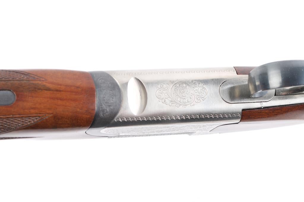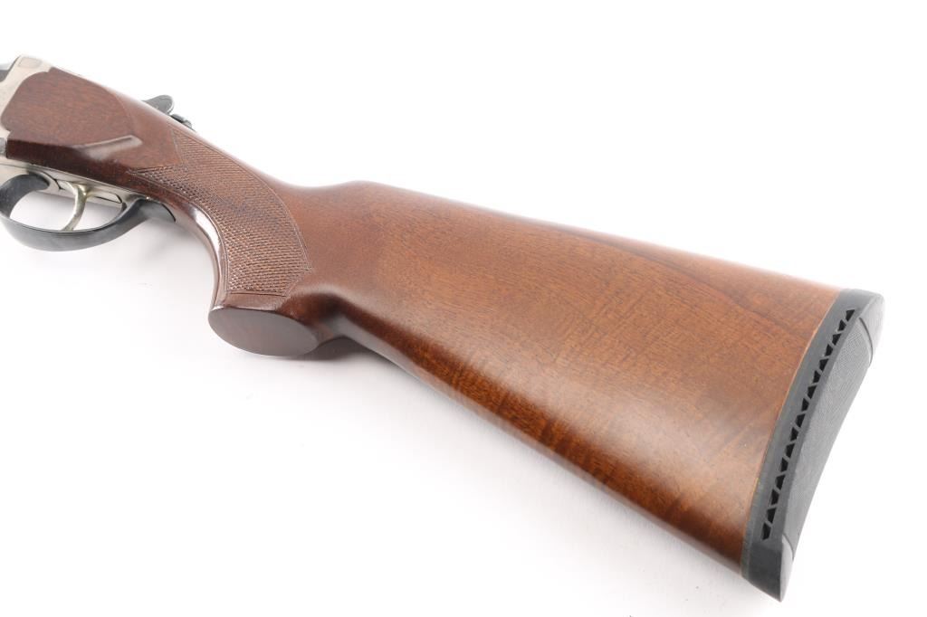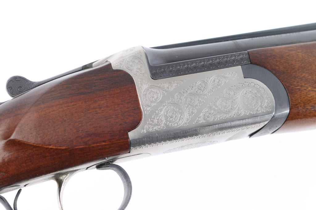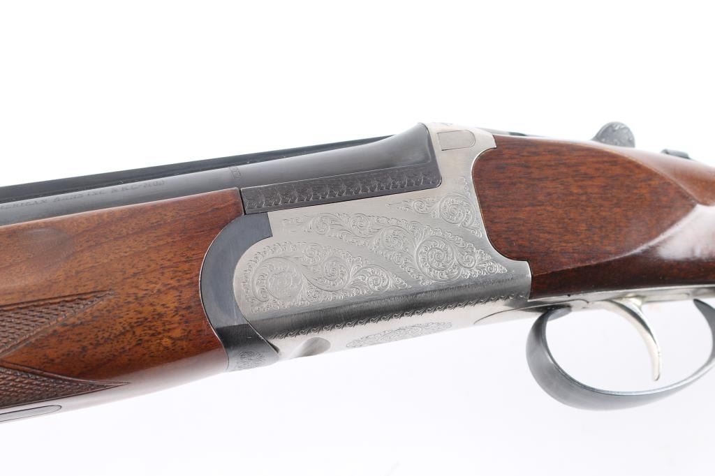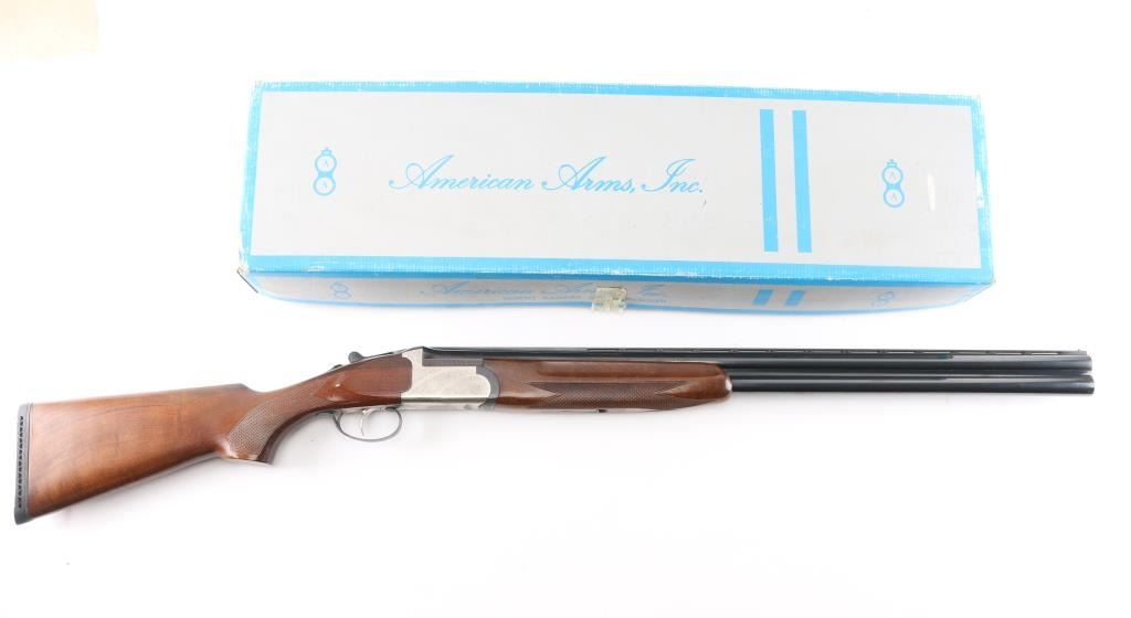 Spanish made over/under shotgun imported by American Arms, North Kansas City MO. Features blued 28" vent rib barrels, brass front bead, interchangeable chokes,engraved coin finish receiver, tang safety, silver accent single selective trigger, auto ejection, checkered wood forend and butt, rubber recoil pad. 3" chambers. Bores are excellent. Retains about 98% blue with very minor edge wear. Receiver is excellent, engraved with majority coverage of floral scrolls. Wood is excellent. Installed chokes are M over IM. LOP is 14 1/4". Includes the original factory box with manual, choke wrench and Full choke tube.Condition is NRA Excellent. Modern Firearm.