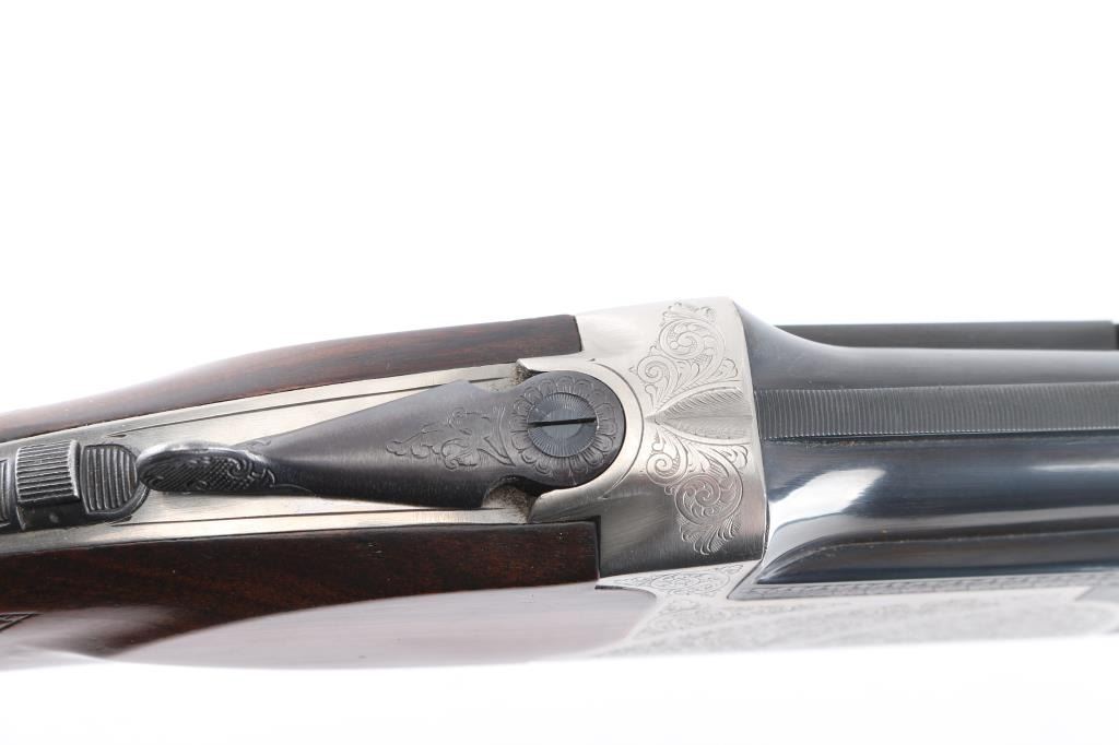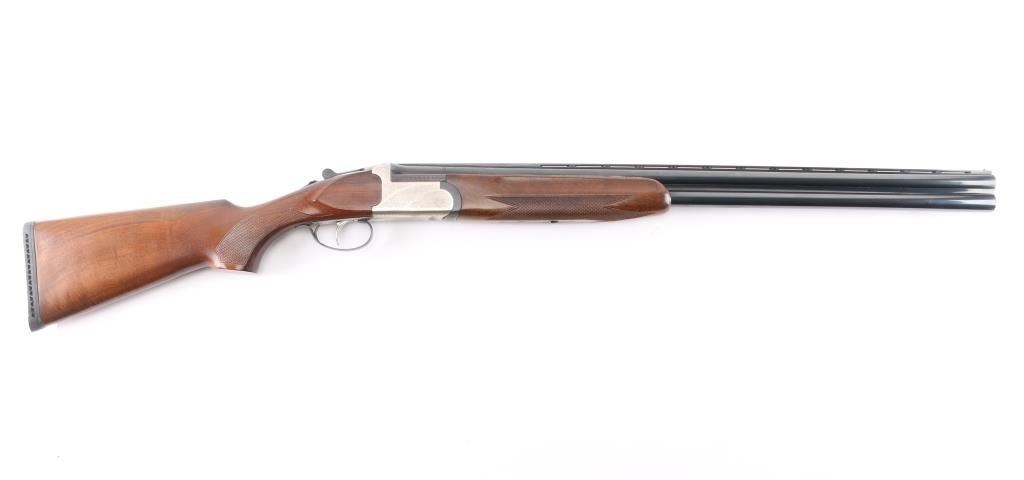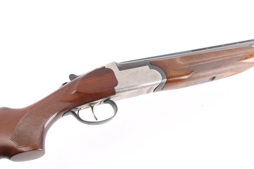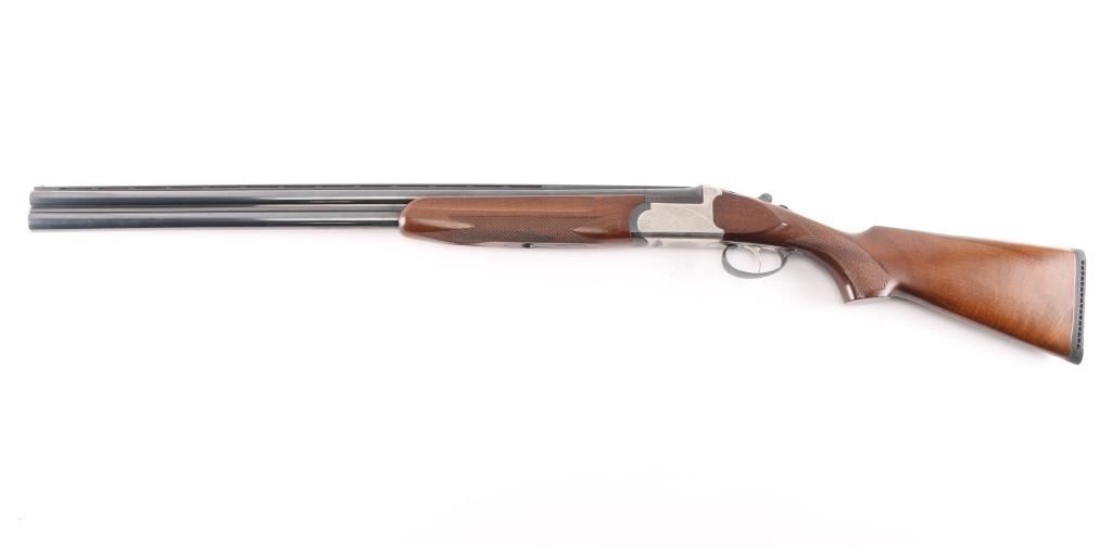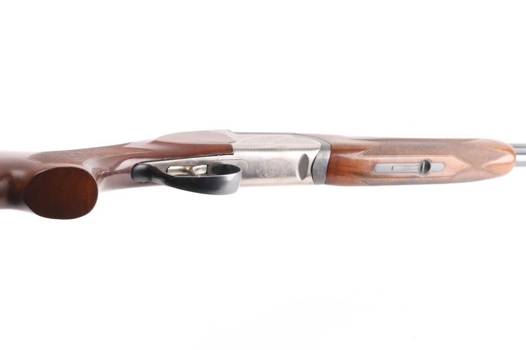 Spanish made over/under shotgun imported by American Arms, North Kansas City MO. Features blued 28" vent rib barrels, brass front bead, interchangeable chokes,engraved coin finish receiver, tang safety, silver accent single selective trigger, auto ejection, checkered wood forend and butt, rubber recoil pad. 3" chambers. Bores are excellent. Retains about 98% blue with very minor edge wear. Receiver is excellent, engraved with majority coverage of floral scrolls. Wood is excellent. Installed chokes are M over IM. LOP is 14 1/4". Includes the original factory box with manual, choke wrench and Full choke tube.Condition is NRA Excellent. Modern Firearm.