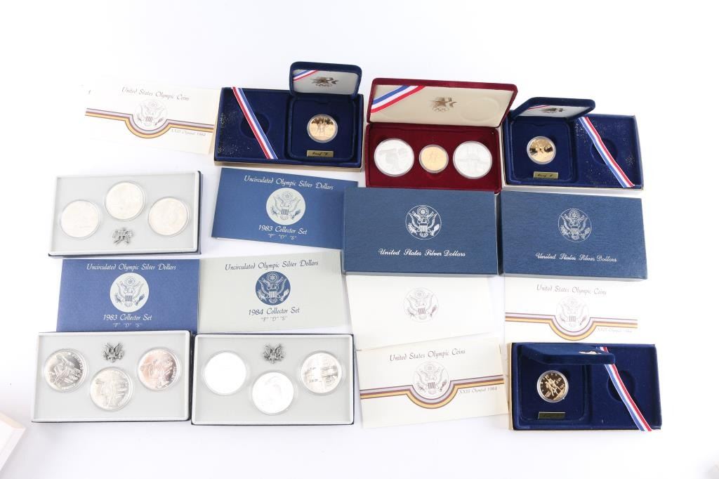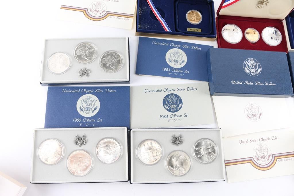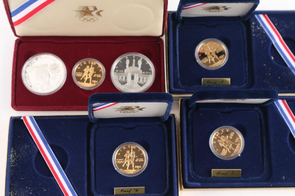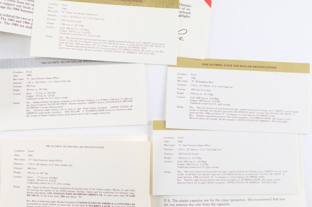 (1)1983/1984 Los Angeles Olympiad 3 - coin set in maroon OGP w/COA (3)1984 Olympic Gold Ten Dollar Coins in OGP w/COA (2)1983 Uncirculated Olympic Silver Dollars in OGP w/COA (1)1984 Uncirculated Olympic Silver Dollar in OGP w/COA.