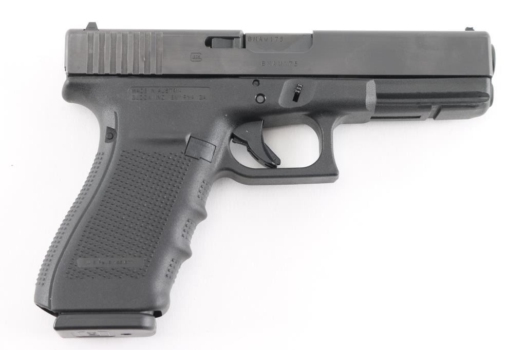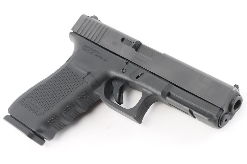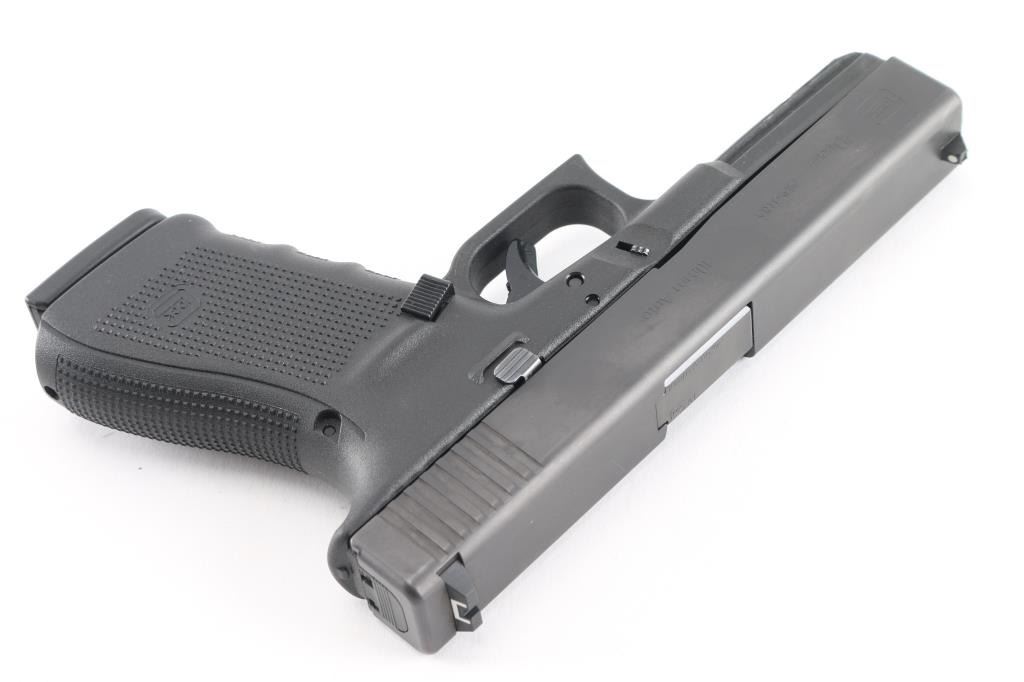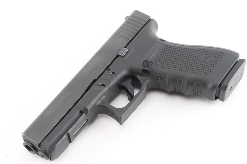 Austrian made full size safe-action semi-automatic pistol imported by Glock Inc, Smyrna GA. Features a black finished slide, 4.61" barrel, white dot front sight, dovetailed rear sight with white outlined square notch, trigger safety, push button magazine release, factory 15 round magazine, and durable black polymer frame with integral accessory rail & finger groove grip. Removable backstrap. Overall condition is like new with few signs of handling or use. Bore is pristine. Comes with its factory case and manual with two 15 rd magazines, (3) total, magazine speed loader, lock, four additional backstraps, cleaning rod and brush.Condition is NRA Excellent - like new***Modern Firearm***