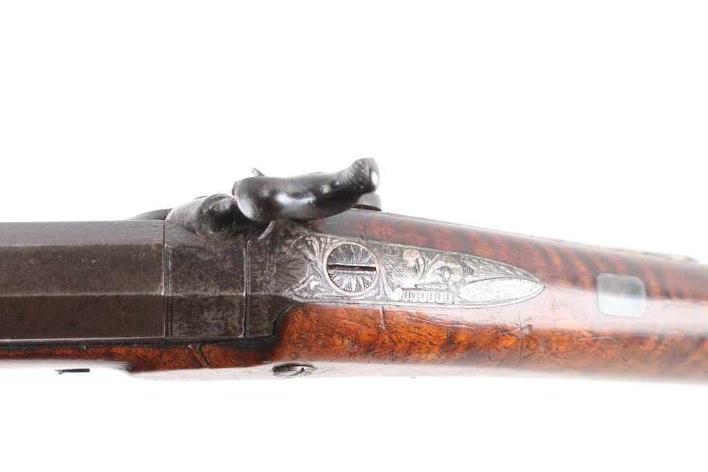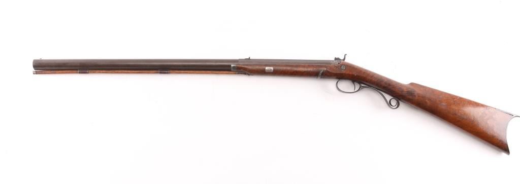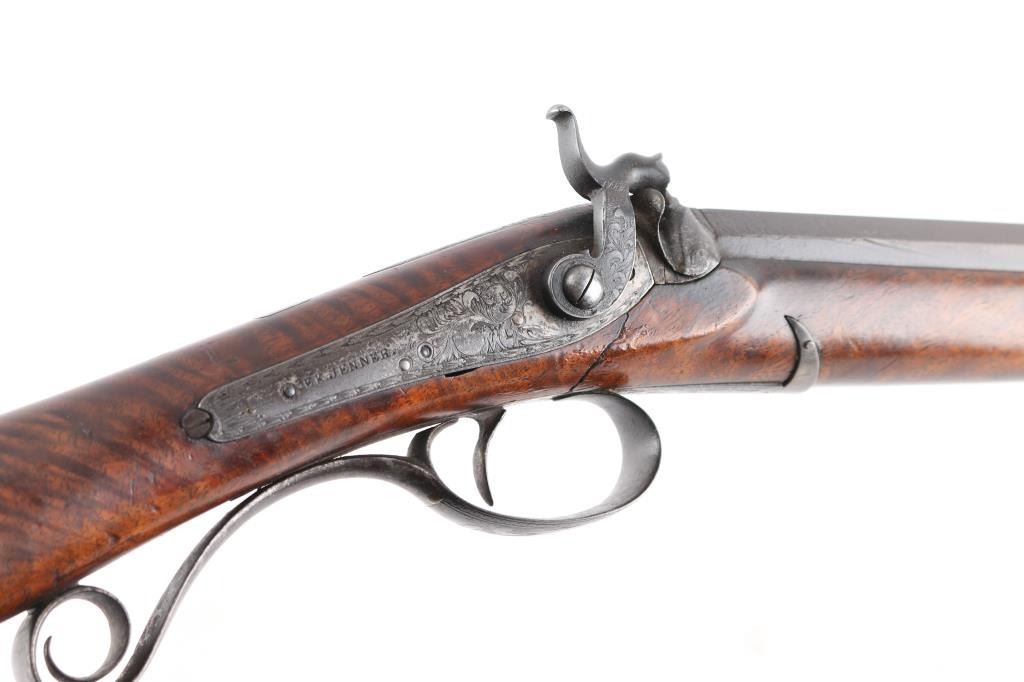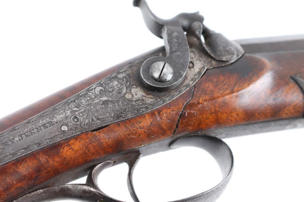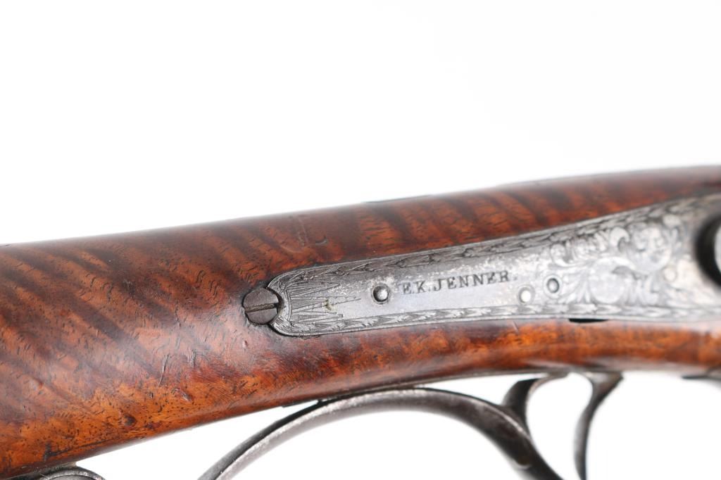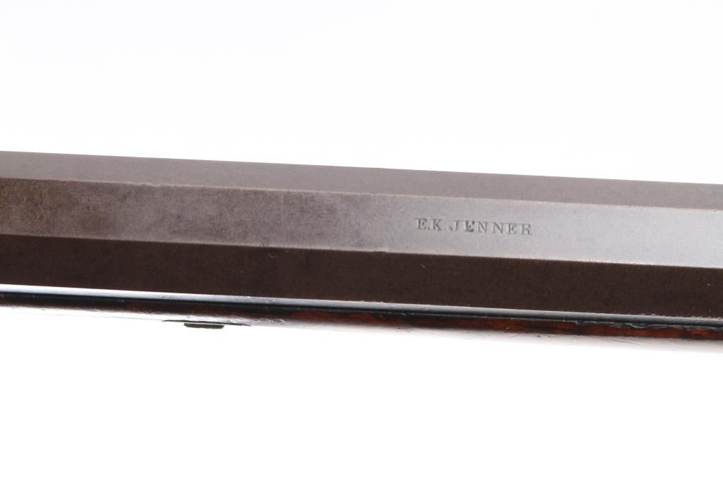 Delicate and good quality "Ladies Rifle" marked E.K. Jenner on BBL and back action lock. 40-1/2" overall w/ 24 1/2" half-octagon BBL in approx. 32-36 cal. rifle w/ single trigger and engraved iron trigger guard. Silver inlay and escutcheon around single BBL key. Stock shows select grain and retains considerable original varnish. Most original brown on metal going to patina. The stock has a repaired crack near the front of the lock on both sides. The action not quite holding on full cock (That happens after 100 years or so). Larry Shelton, California rifle author and experts collection. Consigned by his estate.Condition is NRA Good**Antique Firearm**