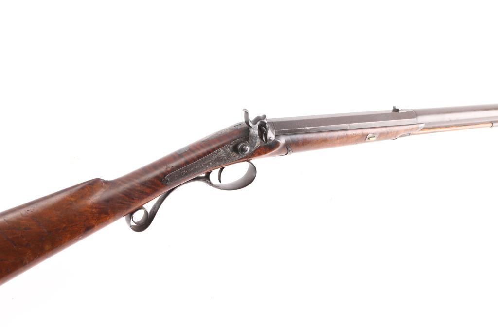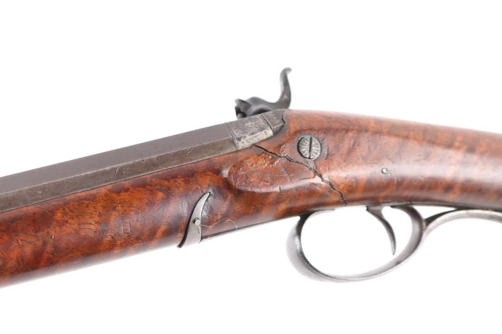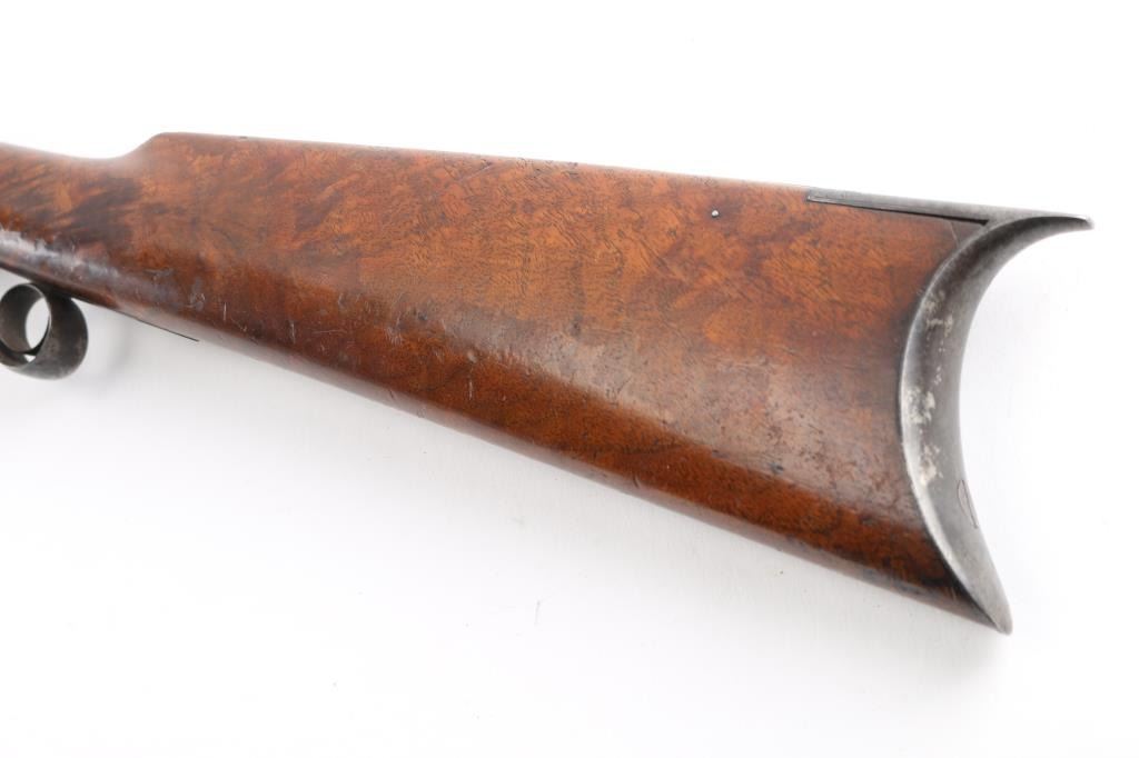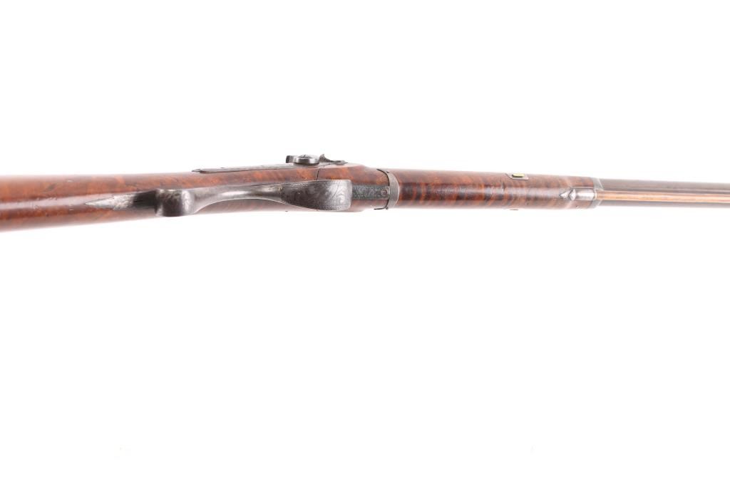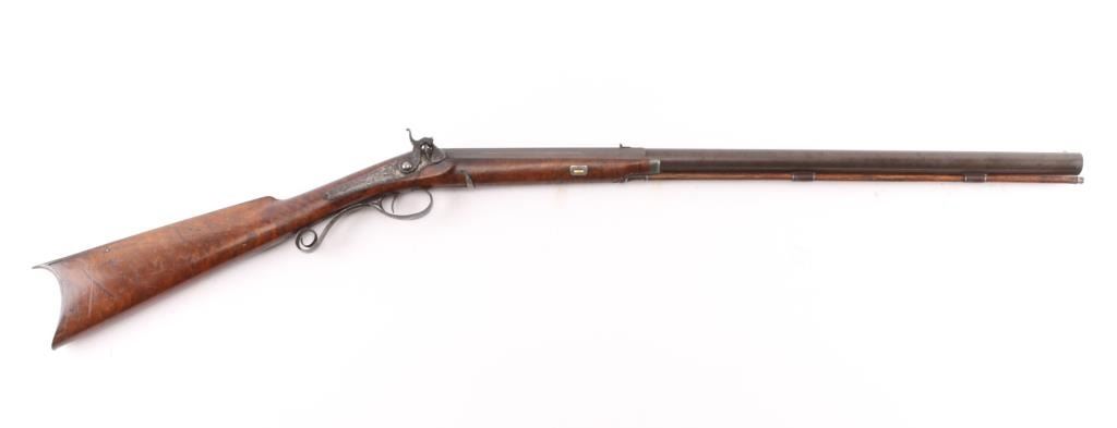 Delicate and good quality "Ladies Rifle" marked E.K. Jenner on BBL and back action lock. 40-1/2" overall w/ 24 1/2" half-octagon BBL in approx. 32-36 cal. rifle w/ single trigger and engraved iron trigger guard. Silver inlay and escutcheon around single BBL key. Stock shows select grain and retains considerable original varnish. Most original brown on metal going to patina. The stock has a repaired crack near the front of the lock on both sides. The action not quite holding on full cock (That happens after 100 years or so). Larry Shelton, California rifle author and experts collection. Consigned by his estate.Condition is NRA Good**Antique Firearm**