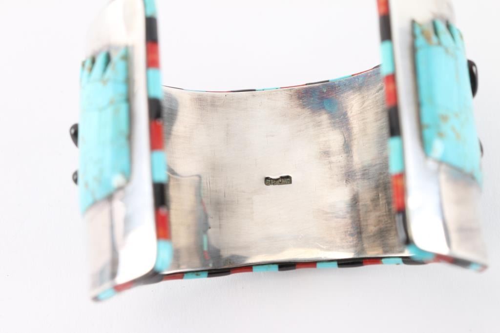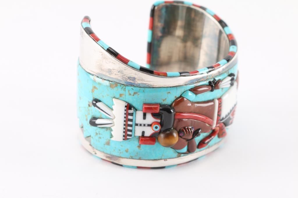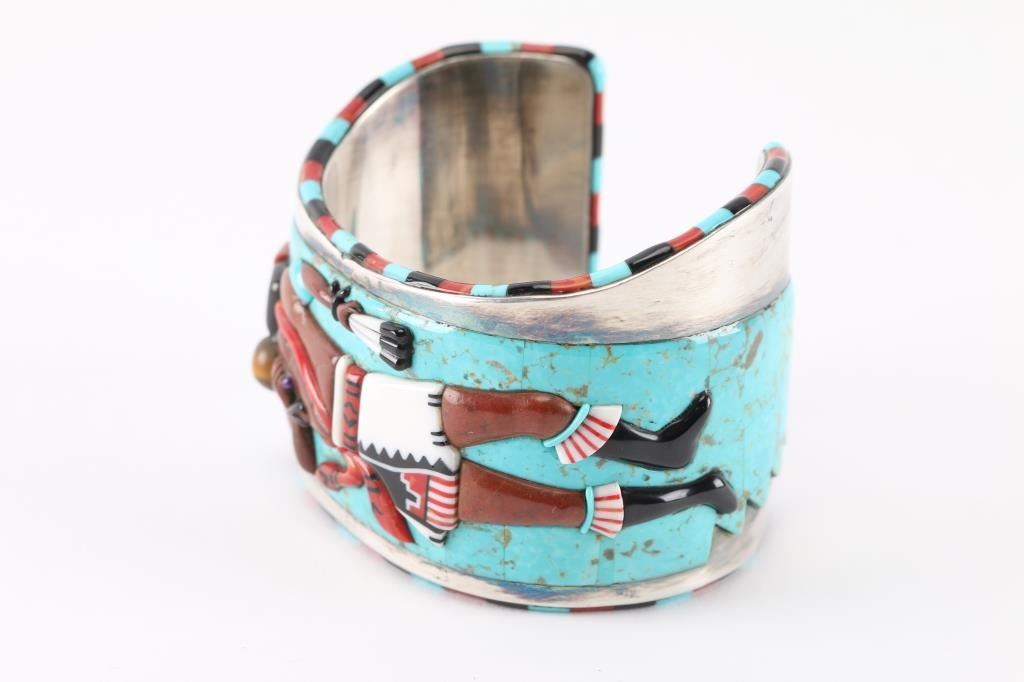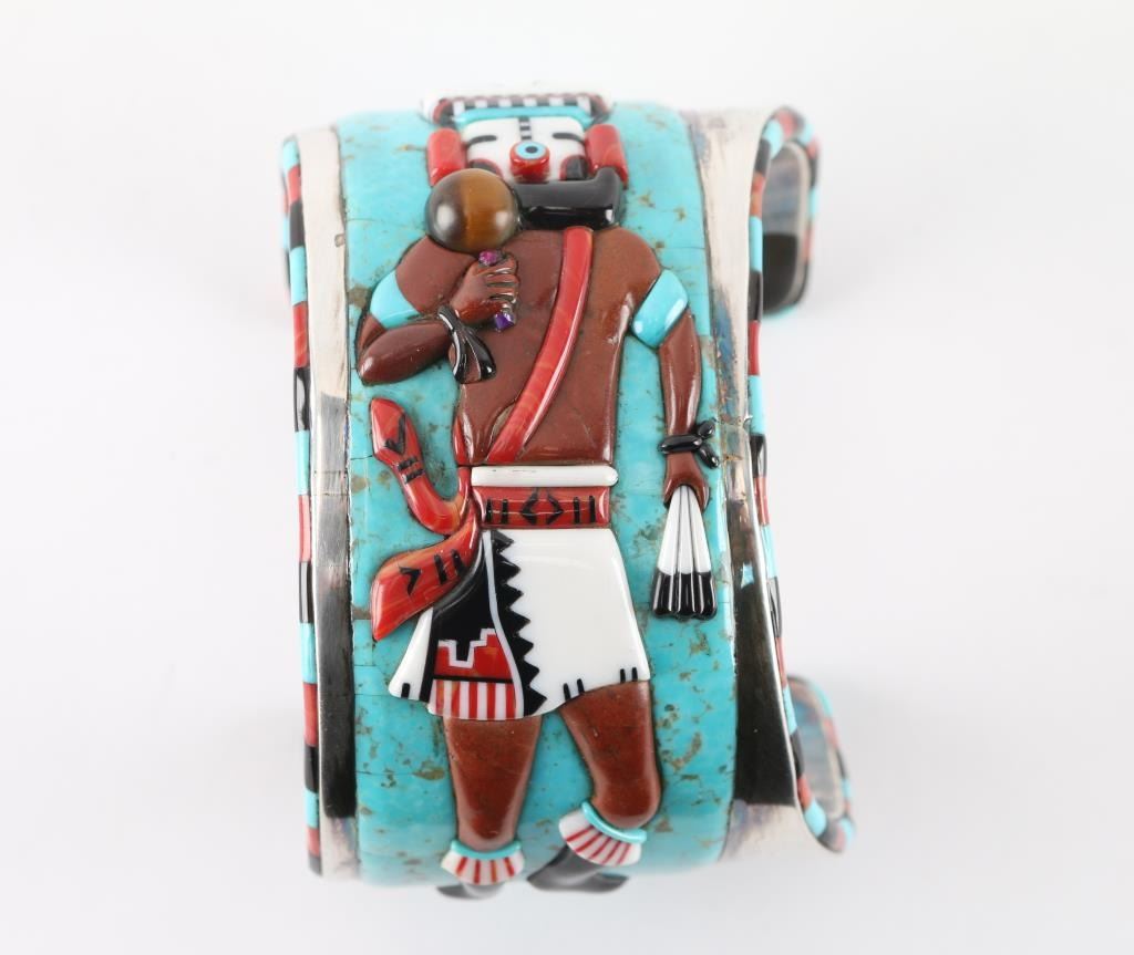 Sterling silver with inlay kachina design set in turquoise. Measuring 9" with gap.