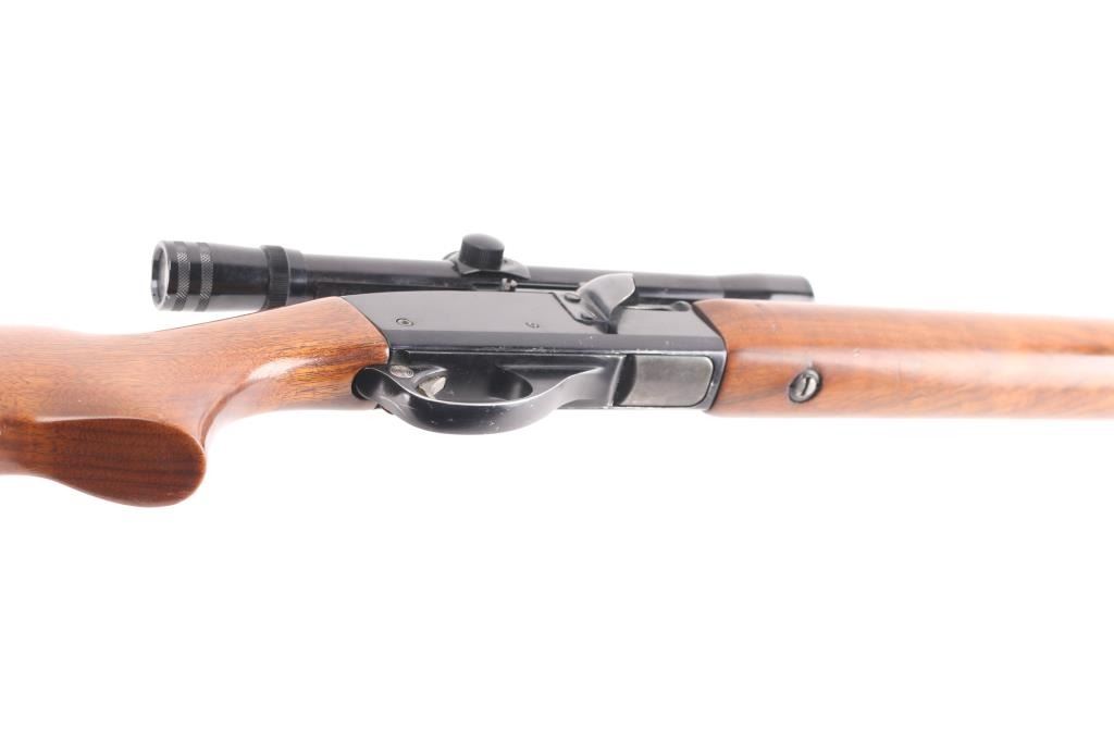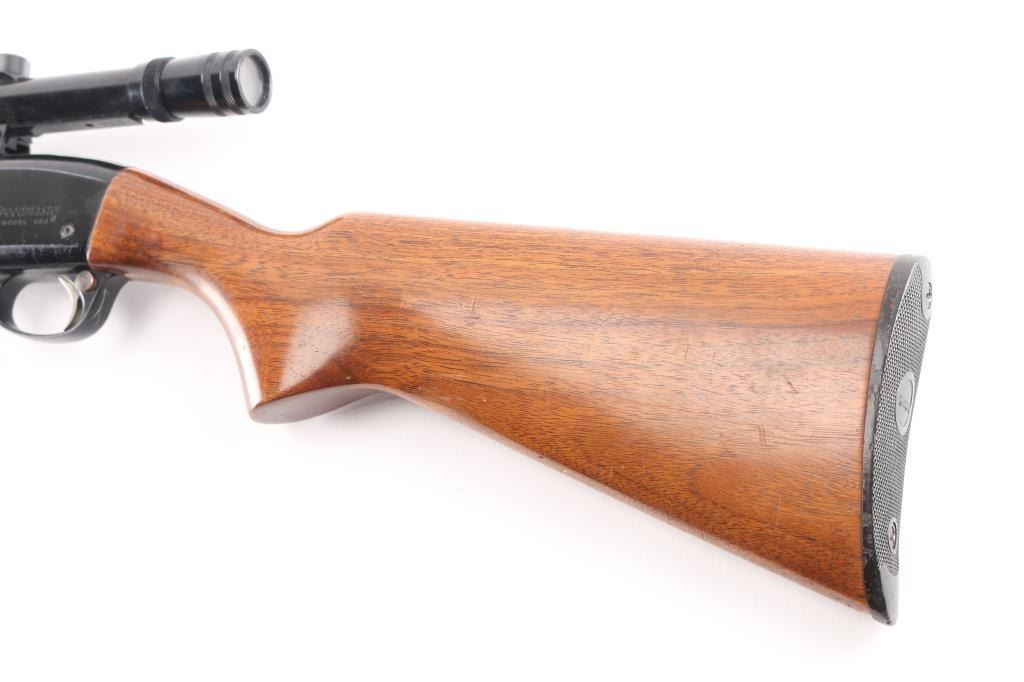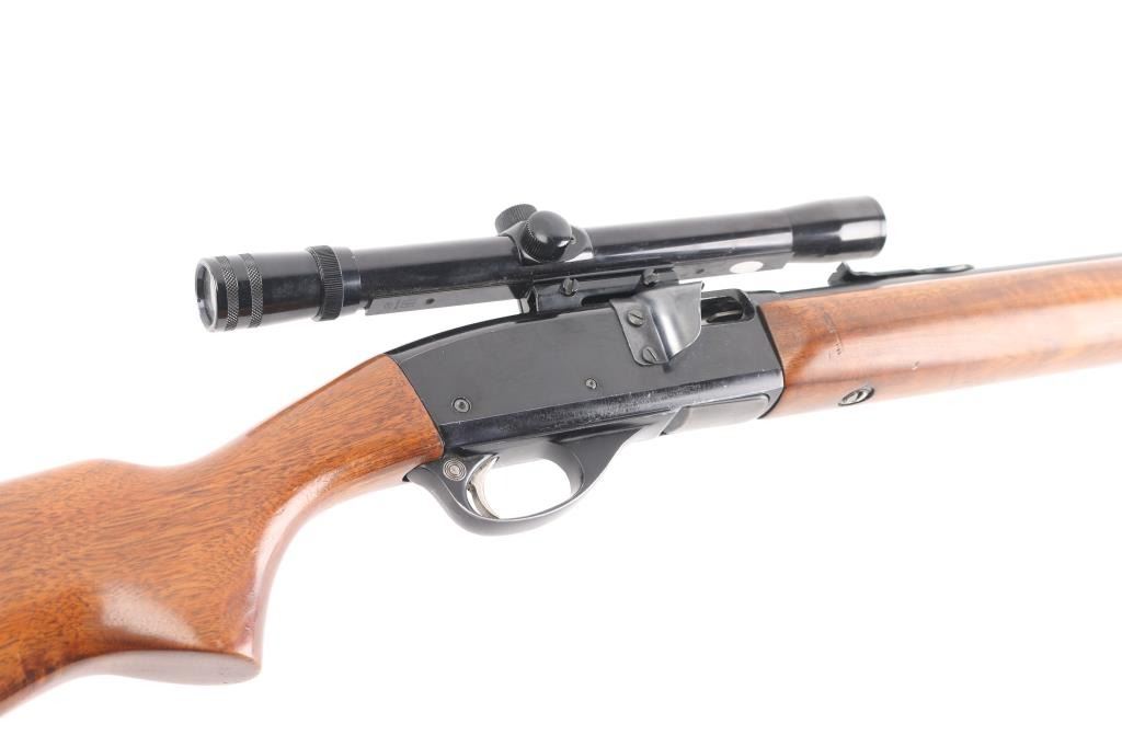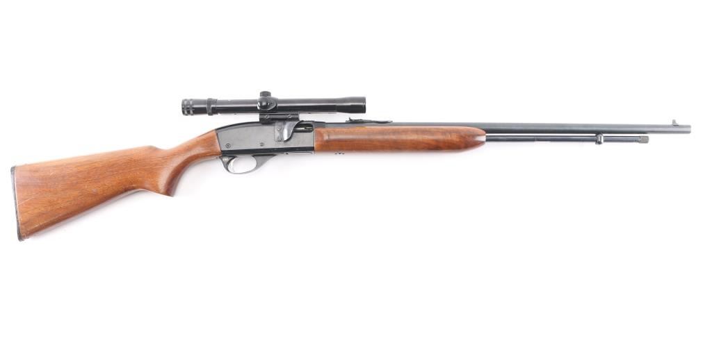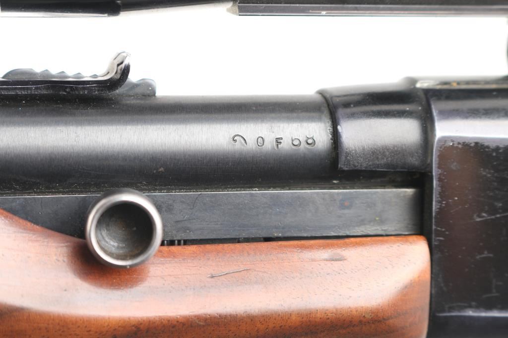 Nvsn. Semiautomatic rimfire rifle features blued finish on steel parts, matching black color finish on alloy receiver, urethane finish on wood, 23" barrel, blade/bead front, buckhorn type rear sights, tube magazine under barrel, manual safety, smooth forend, smooth pistol grip stock , factory plastic buttplate. Installed shell deflector, push button safety on triggerguard. Bore is excellent/bright. Retains about 90% finish with scratches/edge wear. Wood is very good with some minor scratches. Includes good condition Kassnar 4x20 scope with fine crosshairs and clear view. Manufactured 1959.Condition is NRA Very Good. C&R Firearm.