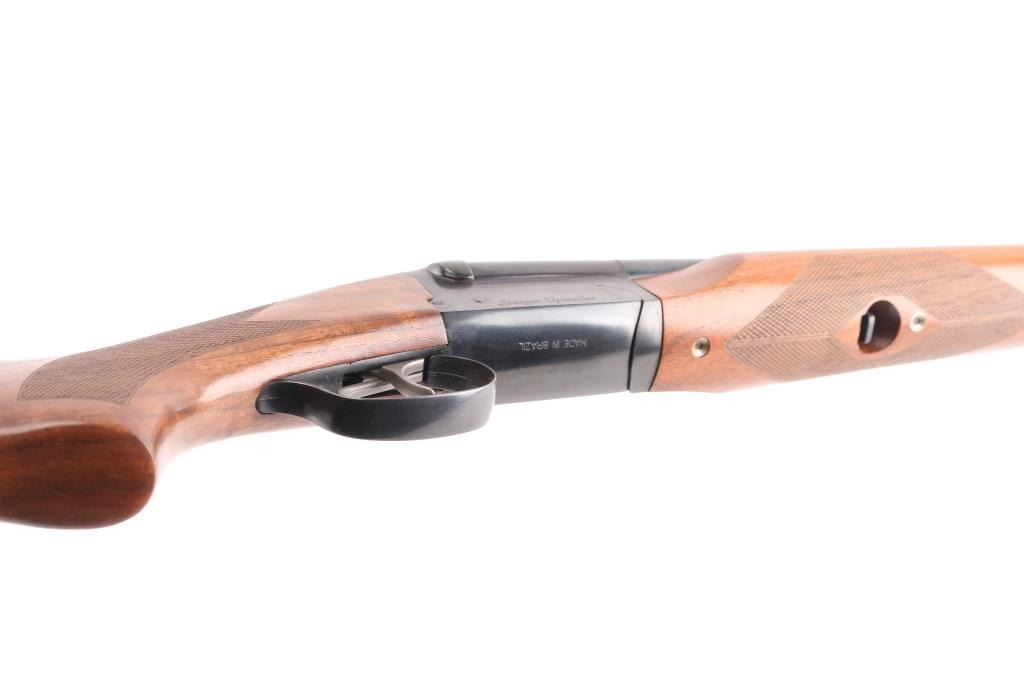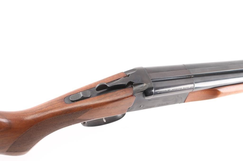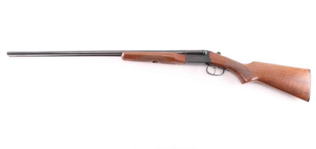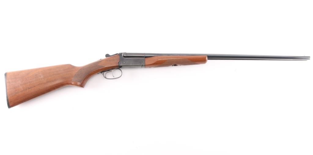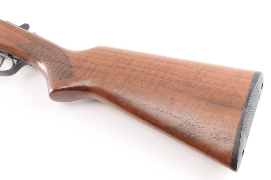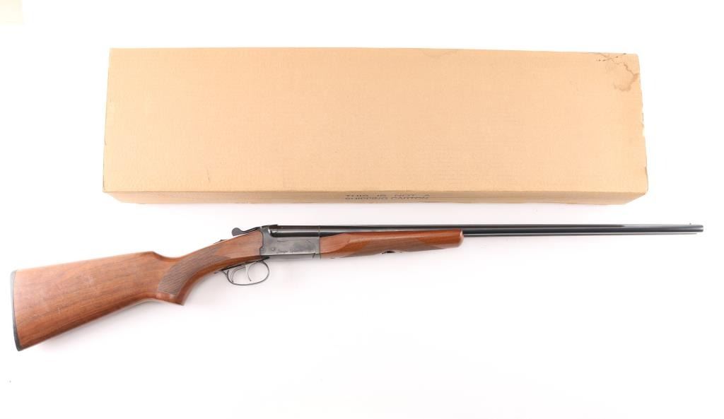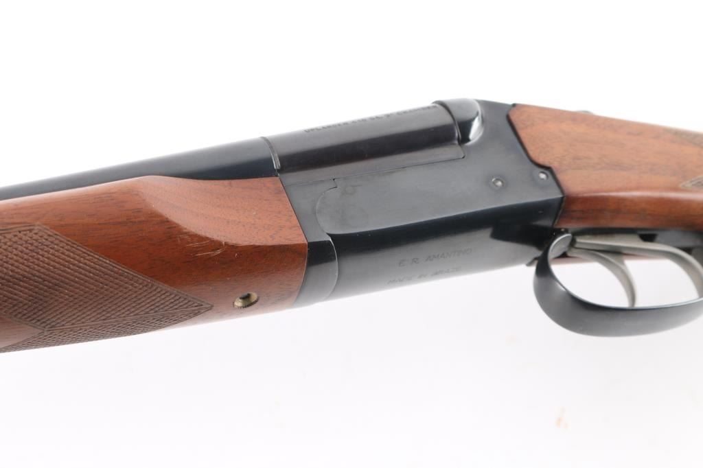 Sn: 599558-08. Double barreled side-by-side shotgun made in Brazil by E.R. Amantino (also known as Boito), imported by Stoeger. Features box lock, blued finish, 26" barrels with fixed IM chokes, low serrated rib, brass bead front sight, double triggers, knurled top lever, sliding tang safety, single extractor, checkered walnut beavertail forend, checkered walnut semi-pistol grip shoulder stock, serrated black plastic buttplate & grip cap. Accepts 3" shells. LOP is 14.1/4". Barrels numbered to receiver. Bores appear excellent, need cleaning. Retains 98% finish with minor handling marks. Wood is excellent with few blemishes. Comes in original factory box with matching label, manual.Condition is NRA Excellent. Modern Firearm.