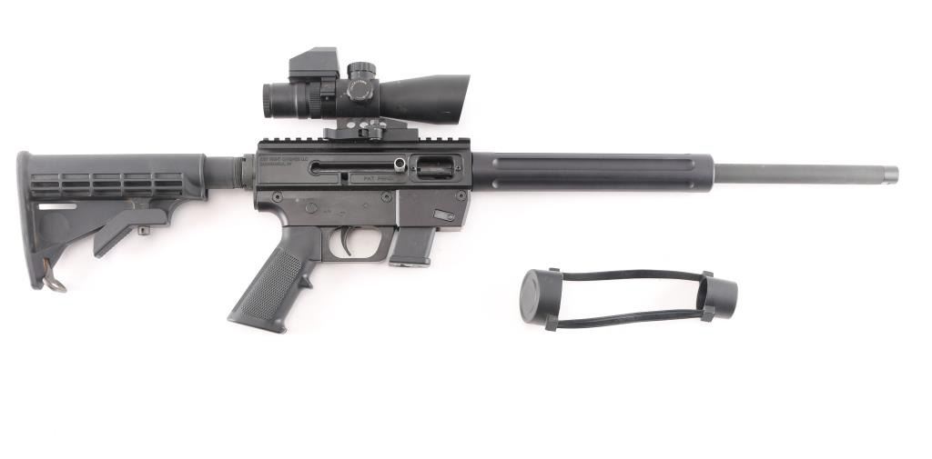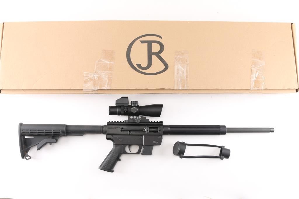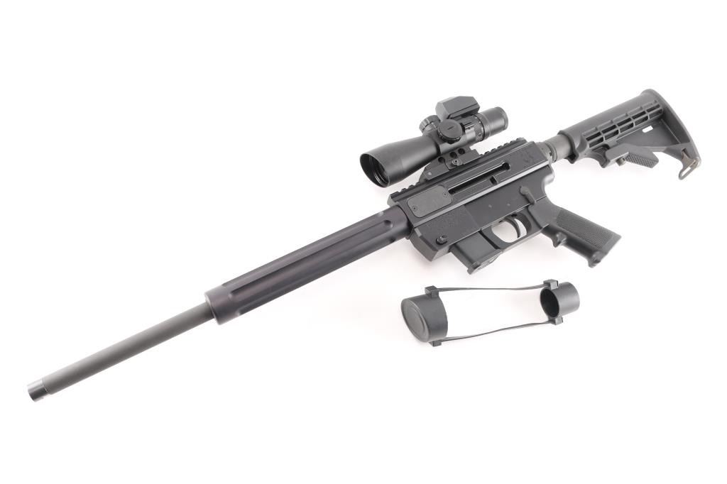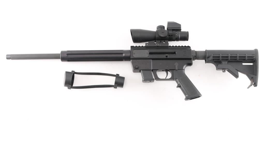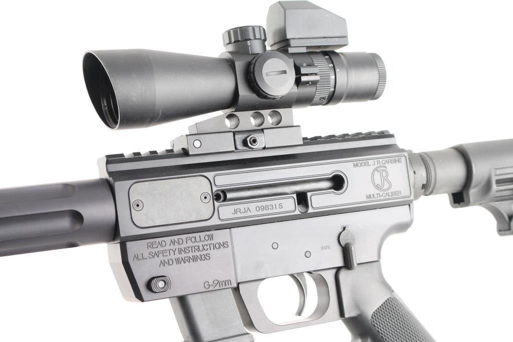 Sn: JRJA096315. American made semi-automatic carbine chambered in 9mm. 17" blued, threaded barrel, 9" fluted steel handguard, A2 style grip. Gen. Straight blowback operation. One piece receiver machined from 6061-T6 aluminum and hard coat anodized finished. Picatinny rail machined to top of receiver. Ambidextrous bolt. Accepts Glock magazines. Mounted with a NcStar 3-9x42 P4 Sniper scope with Mil-Dot reticle, clear optics and quick release base. Comes in factory box,. with documents and one Glock 10- rd magazine. Bore is pristine, like new condition.NRA Condition-Perfect in Box. Modern firearm.