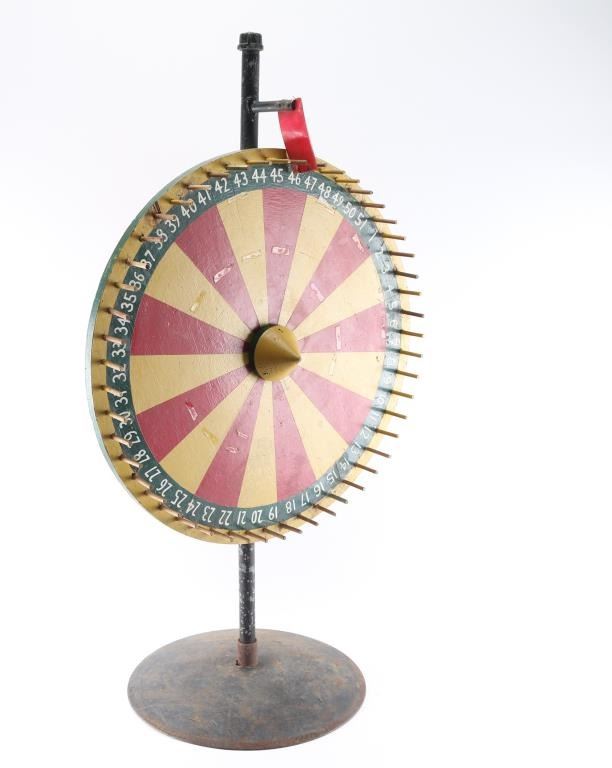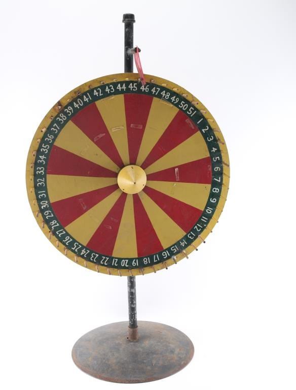 Wood painted spinning wheel in yellow and red with metal freestanding mount, numbered 1 to 51.