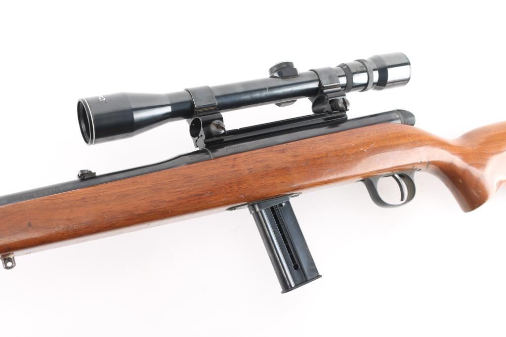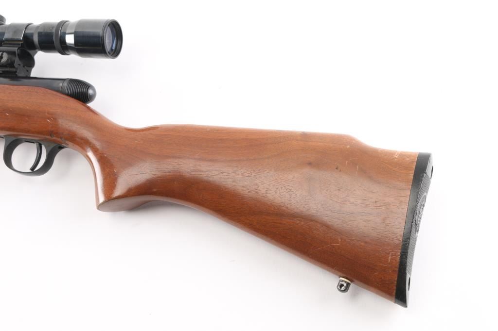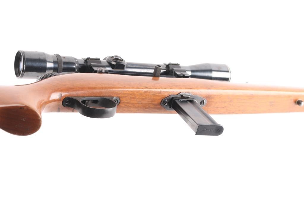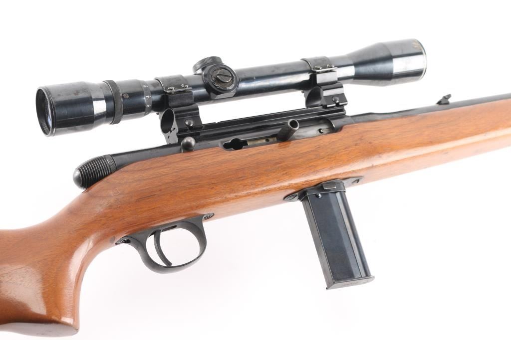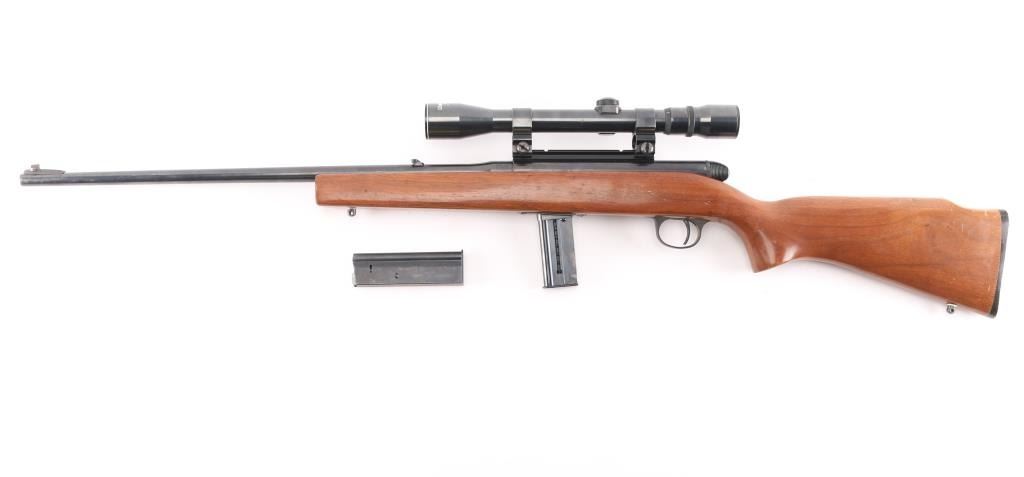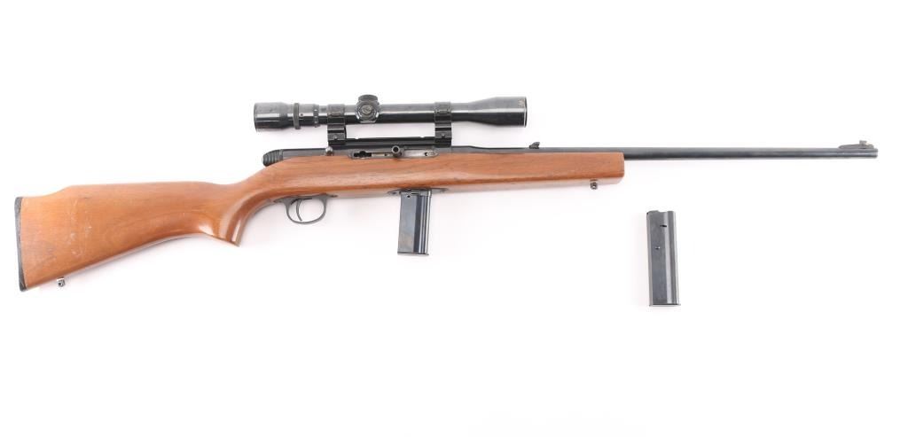H&R semi-automatic rifle chambered in .22 WMR. Blow back action,blue finish, 22" barrel with dovetailed raised front blade, adjustable flip notch rear sights, thumb safety on right receiver, one piece smooth walnut pistol grip stock, sling studs and black plastic factory buttplate. Comes with two 15-rd magazines. Mounted with a Weaver Challenger 3x9 scope, Weaver see through rings, duplex reticle, clear optics. Bore is excellent/bright, finish and wood are excellent with a few minor scratches. Manufactured 1976-86.NRA Condition-Excellent. Modern Firearm