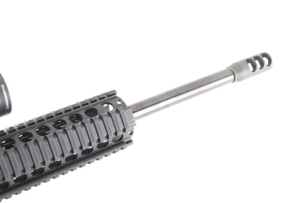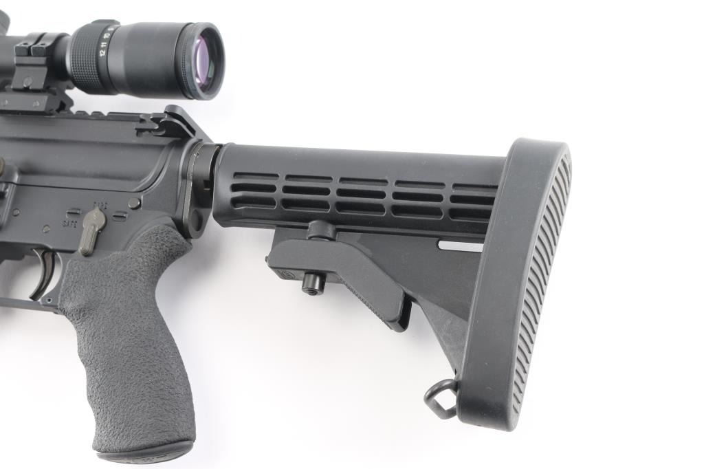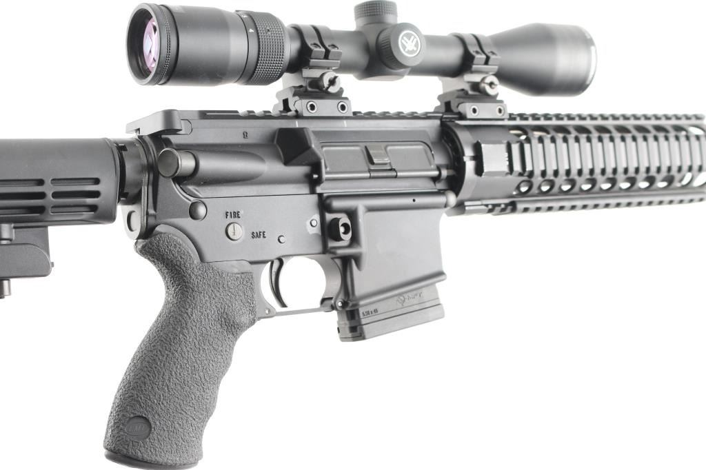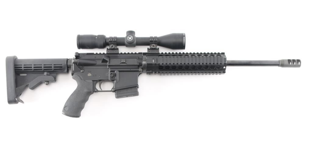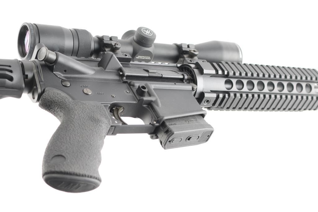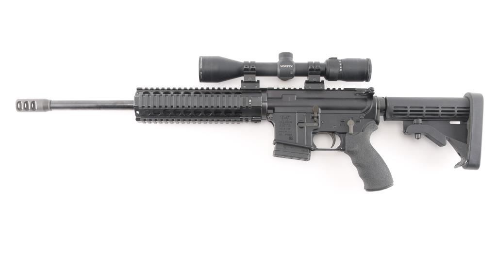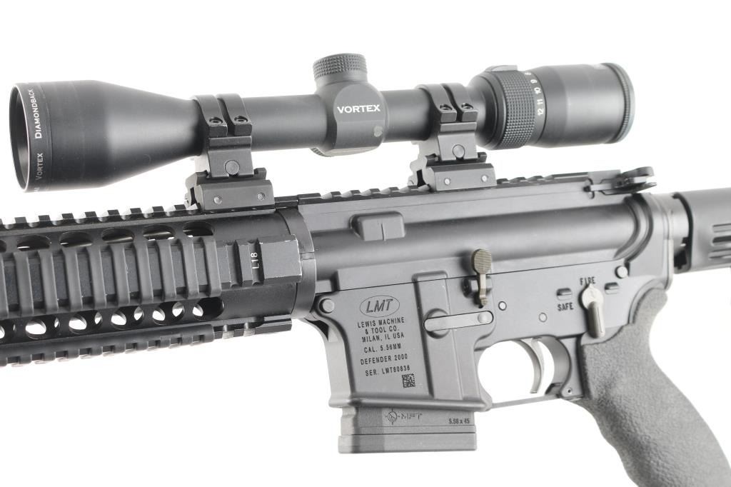 Modern Sporting Rifle from Lewis Machine & Tool featuring LMTs Monolithic Rail Platform and chambered for 5.56 NATO made in Milan, IL. USA. It sports a 16" chrome lined barrel, flash hider, LMT textured pistol grip and LMT adjustable stock, quad rail free floating handguard, forward assist, shell deflector. Mounted with a Vortex Diamondback 4-12X40 scope, Mil-Dot reticle, clear optics. Matte black finish, blue barrel. Bore is excellent/bright. Overall excellent condition with little sign of wear.NRA Condition-Excellent. Modern Firearm.