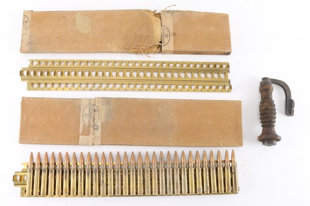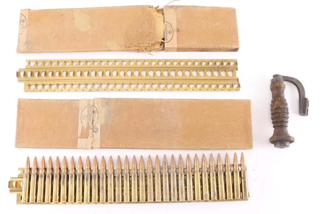 3 Items total. Includes 1) Original WW2 production clip of 7.7mm Japanese type 92 heavy machine gun ammunition. No headstamps on the ammo which is correct. The stamped brass ammo tray holds 30 rounds, and comes storage sleeve. Some of the original labels are intact. The rounds are all in excellent condition. 2) Same as above but without the ammo. The stamped brass tray with storage sleeve. There is some damage to one end of the sleeve. 3) Carrying handle for the type 96/99 Light machine gun. Shows hard use with some chips out of the ribs, still a hard to find piece.