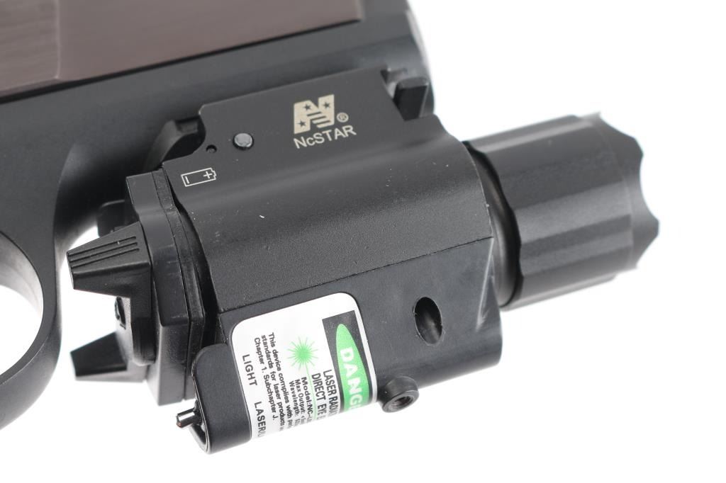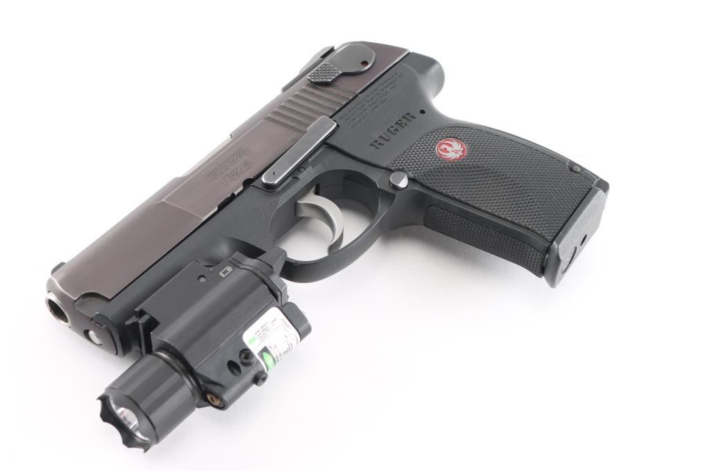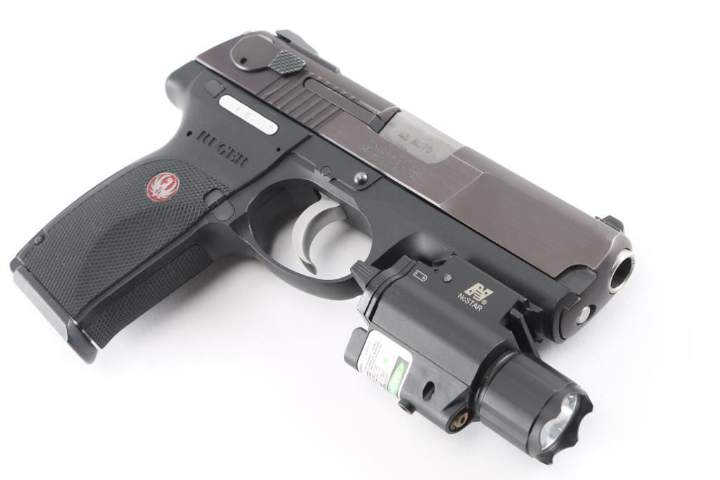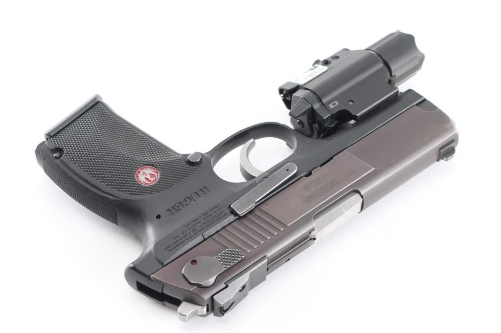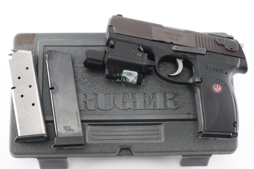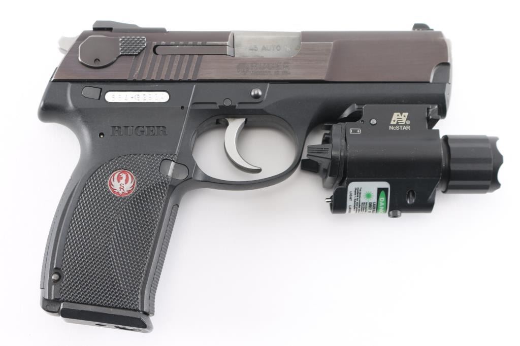 Full size double action semi-automatic pistol chambered in .45 Auto, circa 2007. This model was the last of the P series and along with its many upgrades was designed to be legal for sale in states that require elaborate safety measures. Features a plum colored slide, 4.2" barrel, dovetailed three-dot sights with drift adjustable rear sight, smooth trigger, serrated hammer spur, ambidextrous safety/decocker, loaded chamber indicator, internal locking safety, magazine disconnect safety, push button magazine release, factory 8 round magazine and black polymer frame with integral accessory rail & checkered grip. NcStar combination flashlight/Green dot laser sight installed on rail, in good working order. Includes the original factory hard case with manual, safety keys, speed loader, spent case and two spare magazines. Pistol exhibits only minor handling marks & light slide wear on the barrel. Action is smooth, bore is pristine and polymer is fine.Condition is near NRA Perfect in box. Modern Firearm.