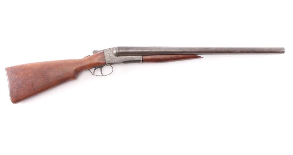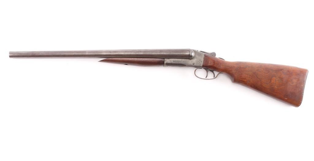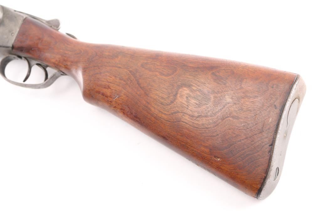Model 315. Riverside Arms Co are names the Stevens Arms Company used on their less expensive shotguns made from 1914 to 1947. The shotgun has been modified by shortening the barrel to 20" to give it a "Coach Gun" appearance. 2 3/4" chambers. The butt stock is a modified m1917stock with steel buttplate with trapdoor, indent for sling swivel has been filled in with wood. Top lever, double triggers, tang safety, matching serial number on water table, barrels forearm metal and forearm, single extractor. Finish has turned a dark gray patina, wood is sound. the buttstock is loose so you have to push it down to be flush with the tang to open the breech, action is stiff, bores are very good bright. LOP is 13 1/2" to front trigger. Bores measure "IC". We would not recommend attempting to fire this gun without checking it with a competent gunsmith. More of a decorator for a western display.NRA Condition-Fair. C&R Firearm.