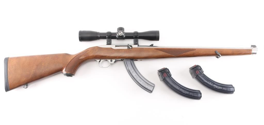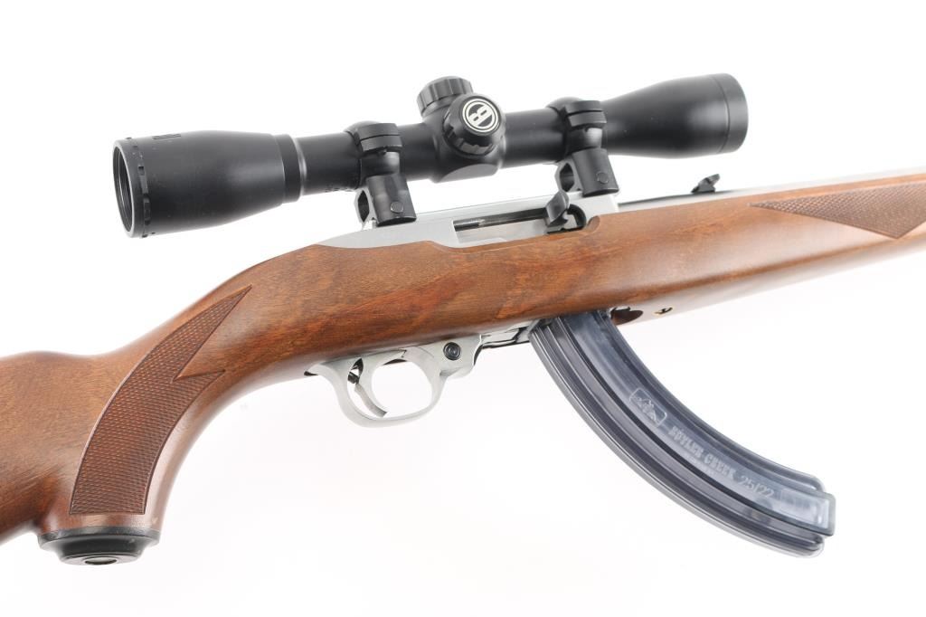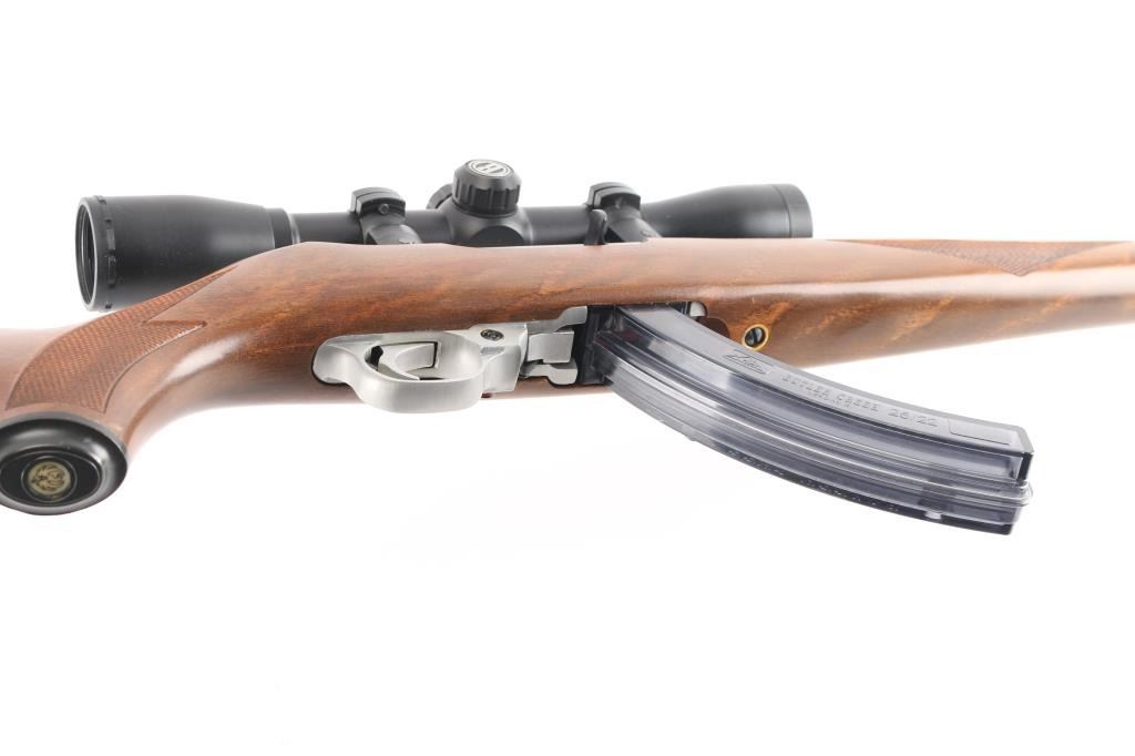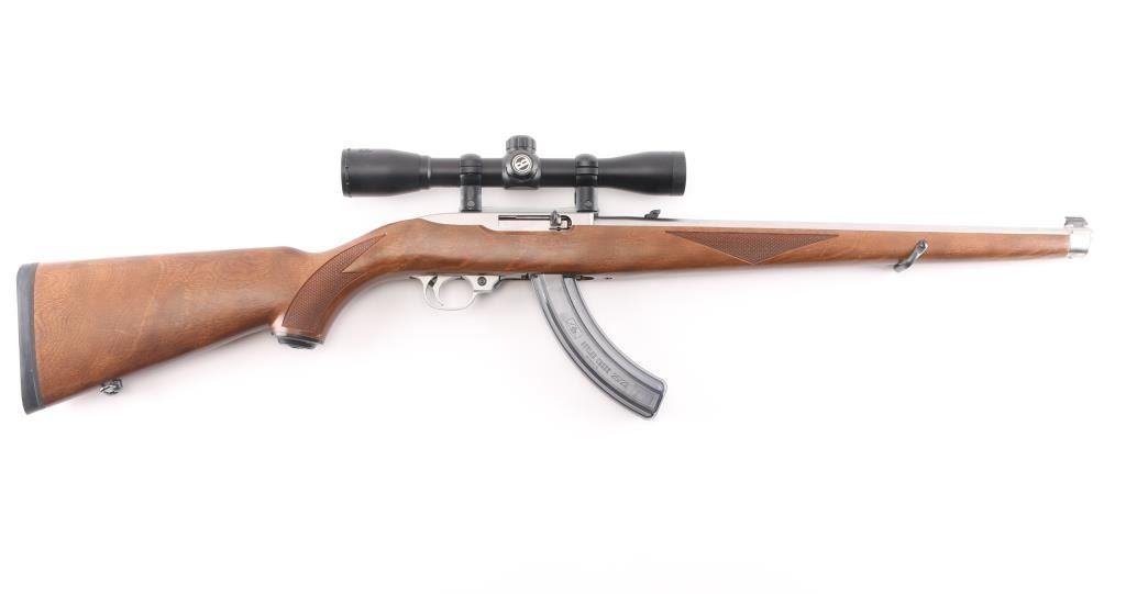Magazine fed semi-automatic sporting rifle chambered in .22 Long Rifle, manufactured circa 1996. Features a stainless steel 18.5" tapered barrel, dovetailed blade front sight with brass bead, flip-up adjustable rear sight, Bushnell Sportsman 4x32 Rifle Scope, fine cross reticle, clear optics. Three Butler creek clear plastic 25 rd magazines, push button safety, alloy receiver, European style sling swivels, and a checkered full-length Mannlicher-style wood stock with metal forend cap, grip cap & factory recoil pad. Rifle exhibits only minor handling marks with no major wear observed. Action is smooth, the bore is pristine and wood stock is fine with minimal blemishes.Condition is near NRA Perfect. Modern Firearm