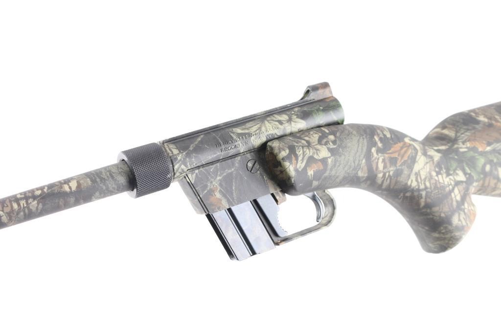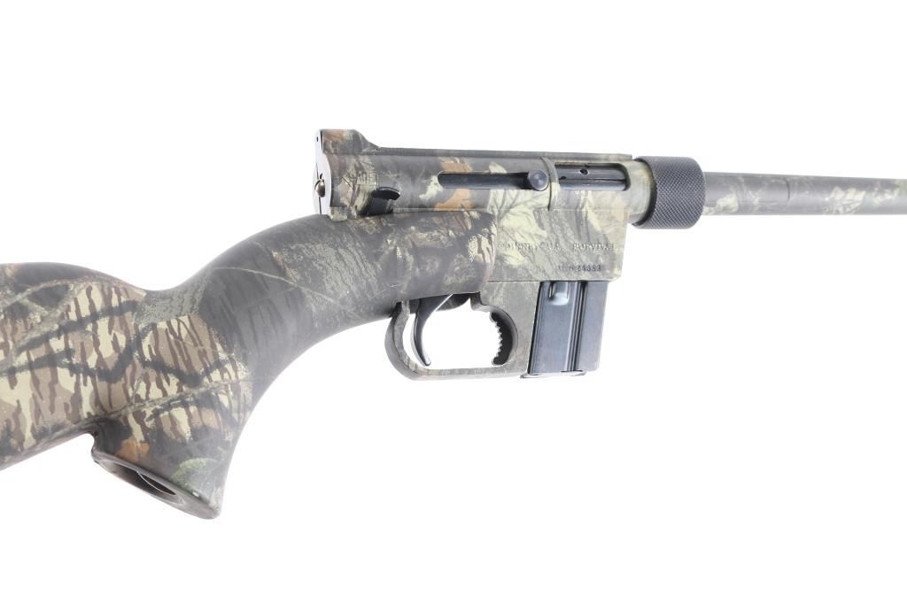 Semiautomatic rimfire rifle chambered for 22LR. Rifle is a close copy of the AR-7 survival rifle designed by Eugene Stoner, and disassembles into smaller components that can be stored inside the hollow buttstock. Features 16" barrel with dovetailed blade front sight, rear peep sight, manual safety, detachable 10 rd magazine, rifle is finished in Mossy Oak break up camo. Overall condition is excellent, bore needs cleaning. Includes factory box with matching label, manual.Condition is NRA Excellent. Modern Firearm.