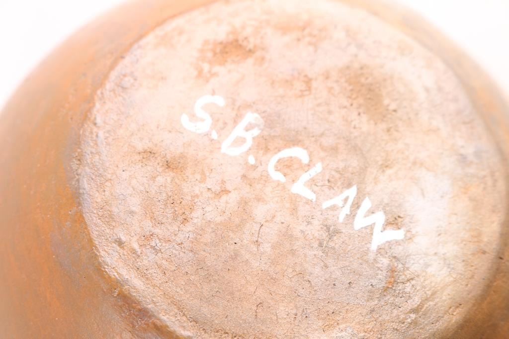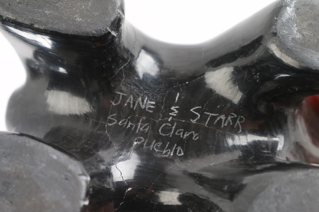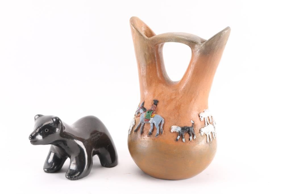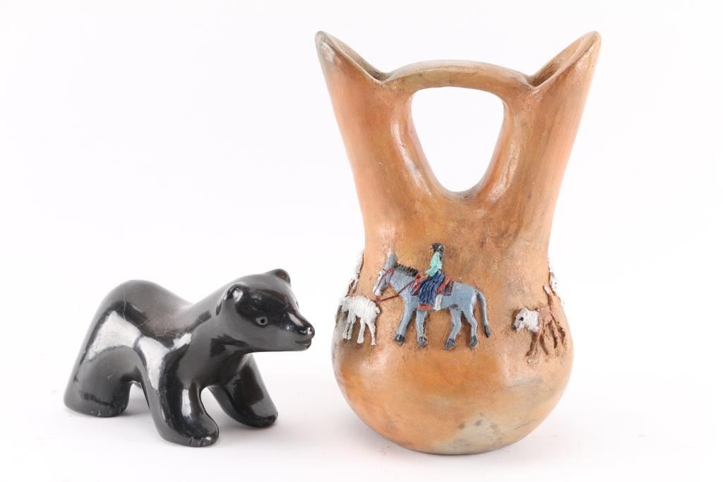 (1) Navajo applique wedding vase by Silas and Bertha Claw, signed on bottom. Whimsical design of donkeys with riders, sheep and a couple of dogs. In good condition. (1) Santa Clara Pueblo pottery of black bear. Has some surface cracking and a very thin chip toward rear. Otherwise very nice condition. Signed on bottom by Jane & Starr, Santa Clara Pueblo. Measures 6" long by 3" wide by 3 1/2" tall.