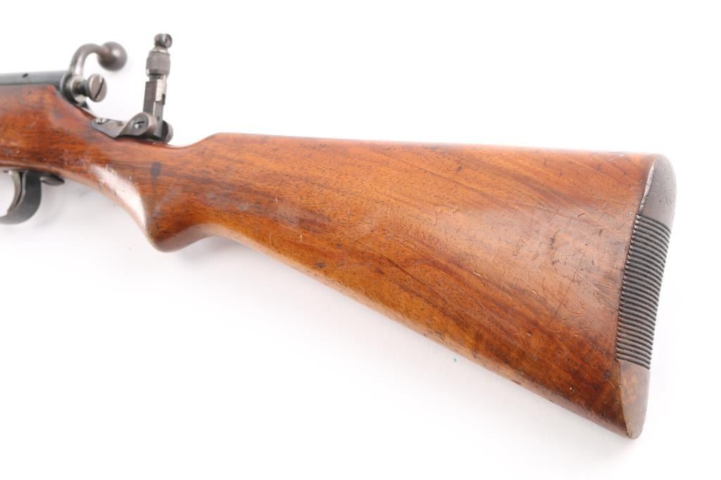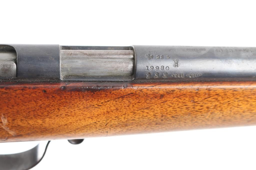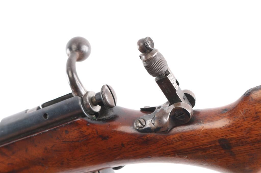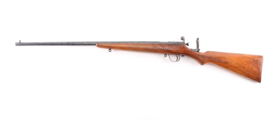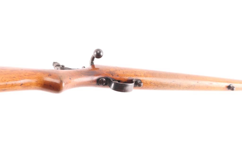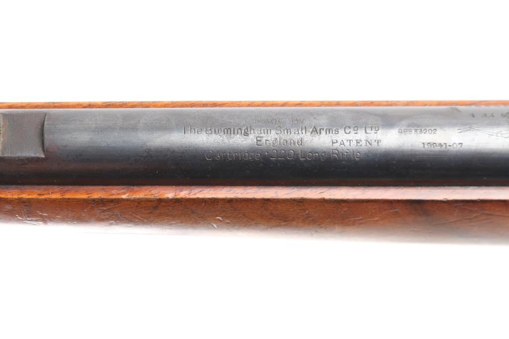 English manufactured Birmingham Small Arms single-shot No. 2 target rifle chambered in .22 LR. Imported by Gunshop Inc. Lancaster, CA.(underside of stock) 23" barrel, integral receiver, blade/bead front sight, rear sight removed, empty dovetail, vintage micro adjustable aperture sight installed marked A.G.P. (Alfred G. Parker), one-piece smooth semi-pistol stock with integral wooden buttplate, round sling swivels. Action is smooth, blue is about 85% with handling wear on the triggerguard, some fading and minor scratches, wood is very good/sound with minor scratches/dings and the bore is