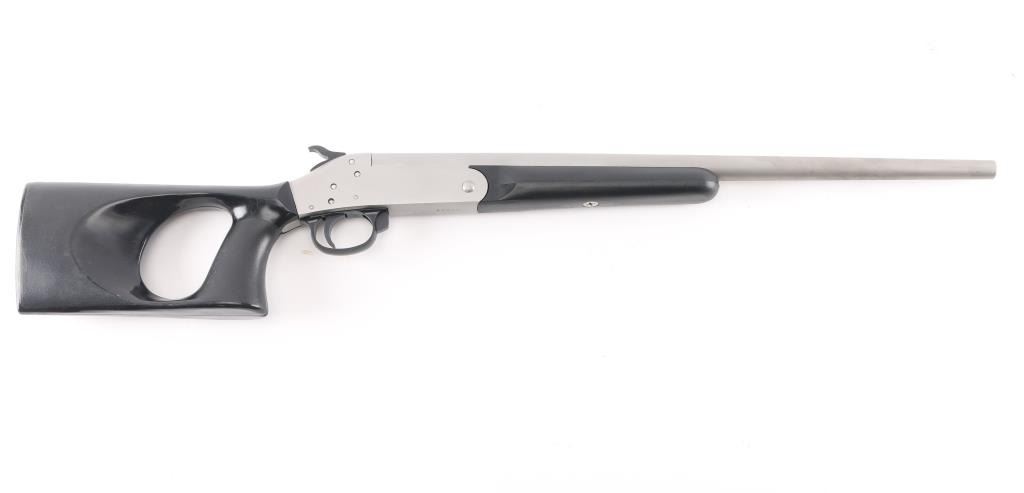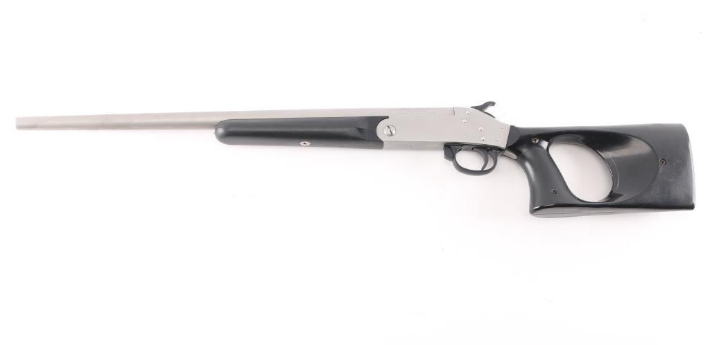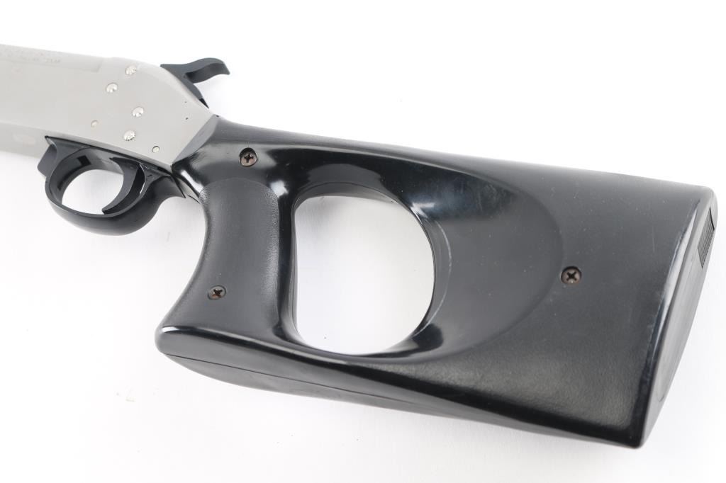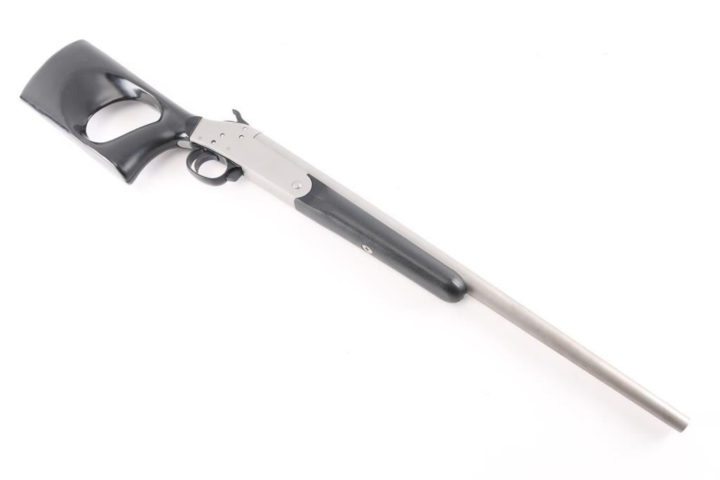 Single shot break action shotgun with 18-1/4" barrel, matte stainless steel with thumb hole pistol grip black plastic stock and forearm. Bore is very good/bright, needs cleaning, barrel locks up tight.NRA Condition-Very Good. Modern Firearm.