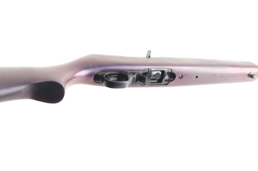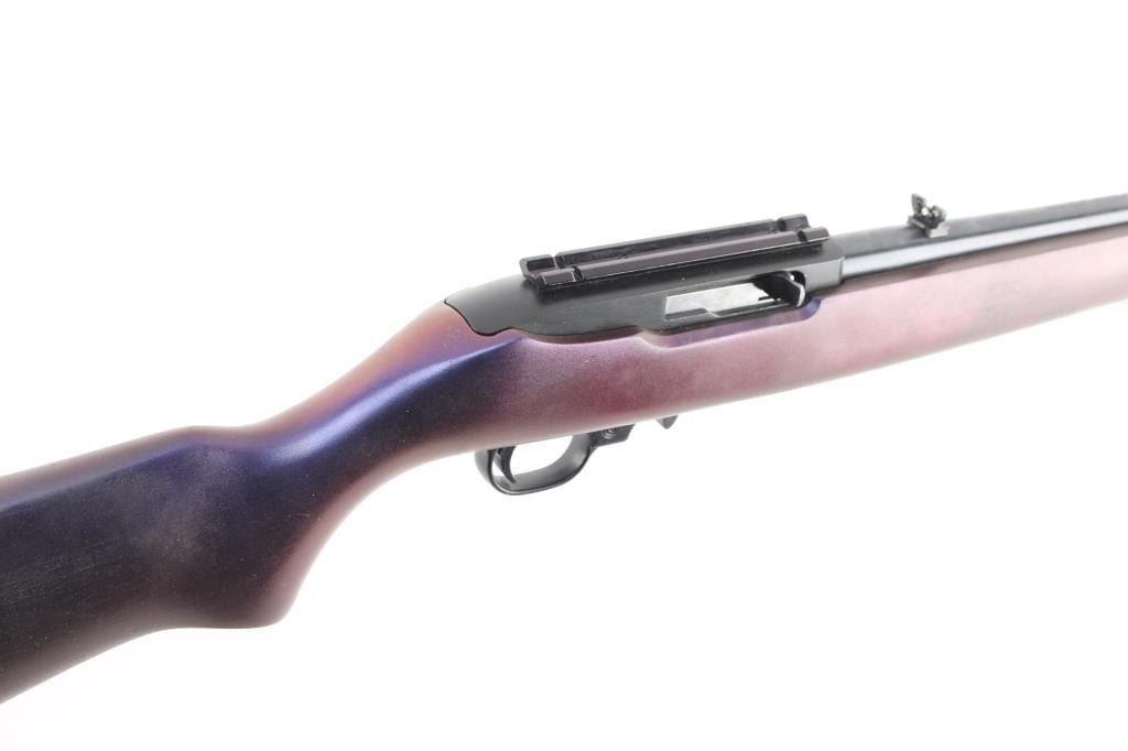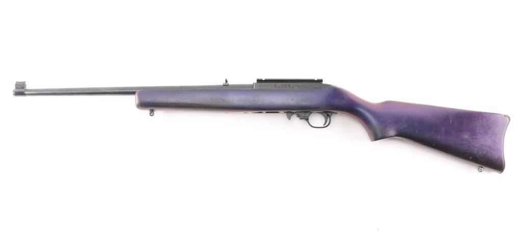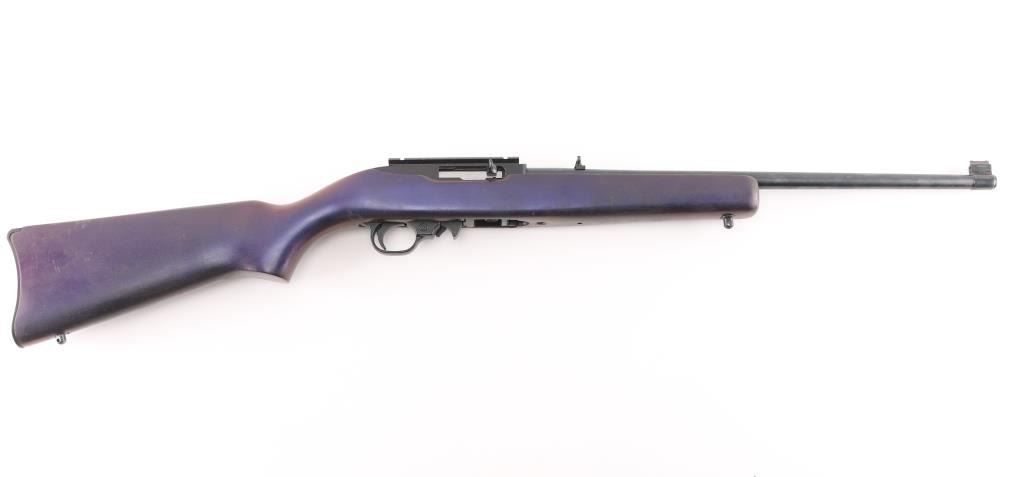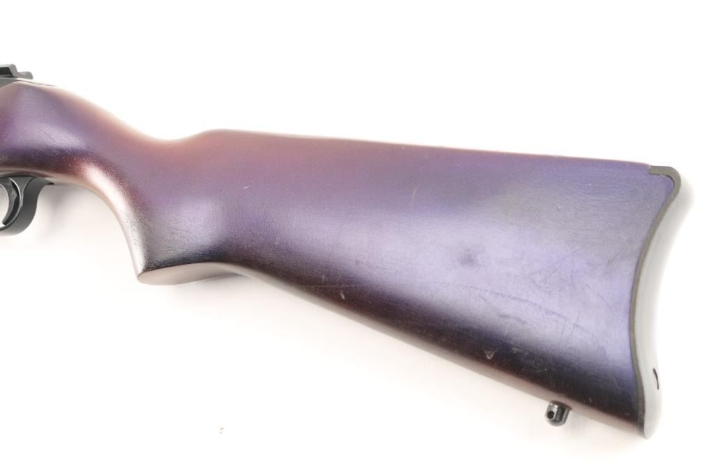 American made semi-automatic carbine, manufactured 2002.. Blued finish, approximately 18 5/8" barrel, dovetailed red fiber optic front sight, flip-up open notch rear sight, scope base installed on receiver, push button safety, smooth trigger, smooth walnut stock with a pistol grip, has been painted a dark purple, Blue/matte black is 98%. Bore is Excellent/Bright. Rotary 10 rd magazine.NRA Condition-Very Good. Modern Firearm.