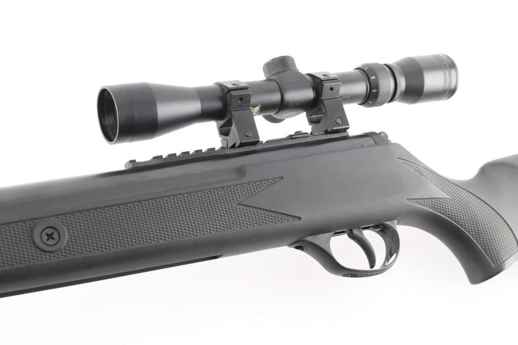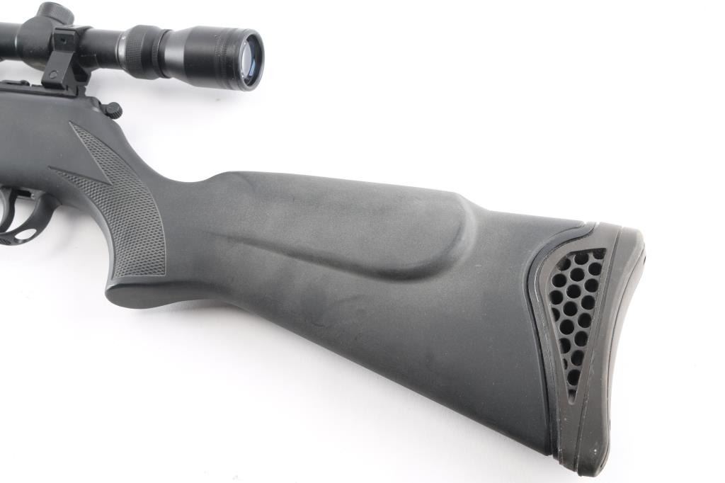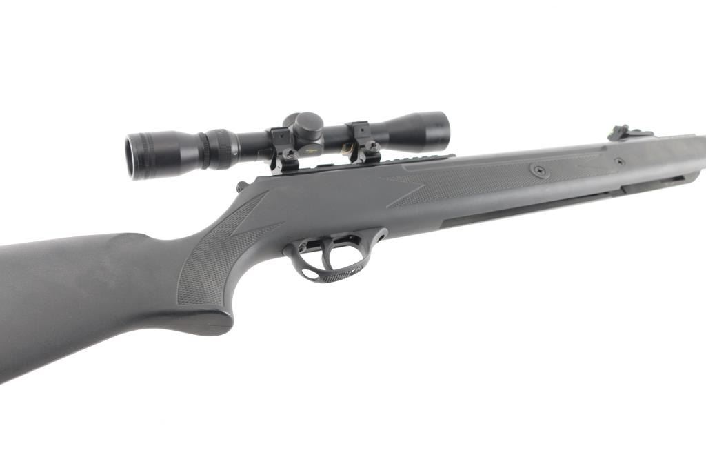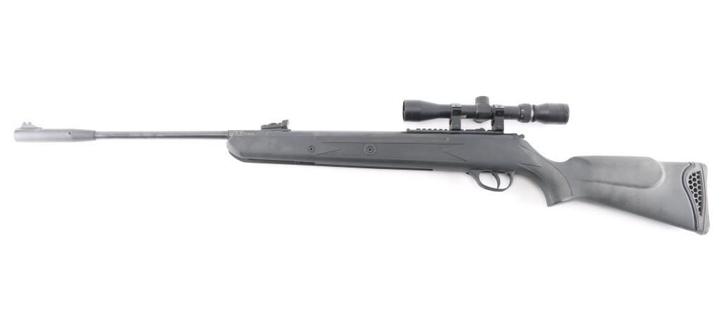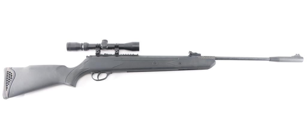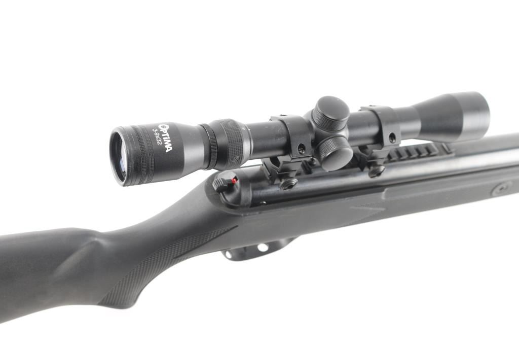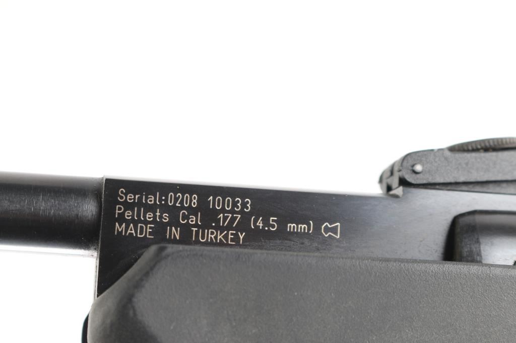Turkish made.177 caliber. Break barrel air rifle action. Single shot. mounted with a Optima 3-9×32 Scope, duplex reticle, red fiber optic front sight with fully adjuster green fiber optic rear sight, manual safety on rear of action, black syntactic checkered stock with factory rubber recoil pad, 19 1/2" barrel with muzzle break. Very good condition, bore is excellent.