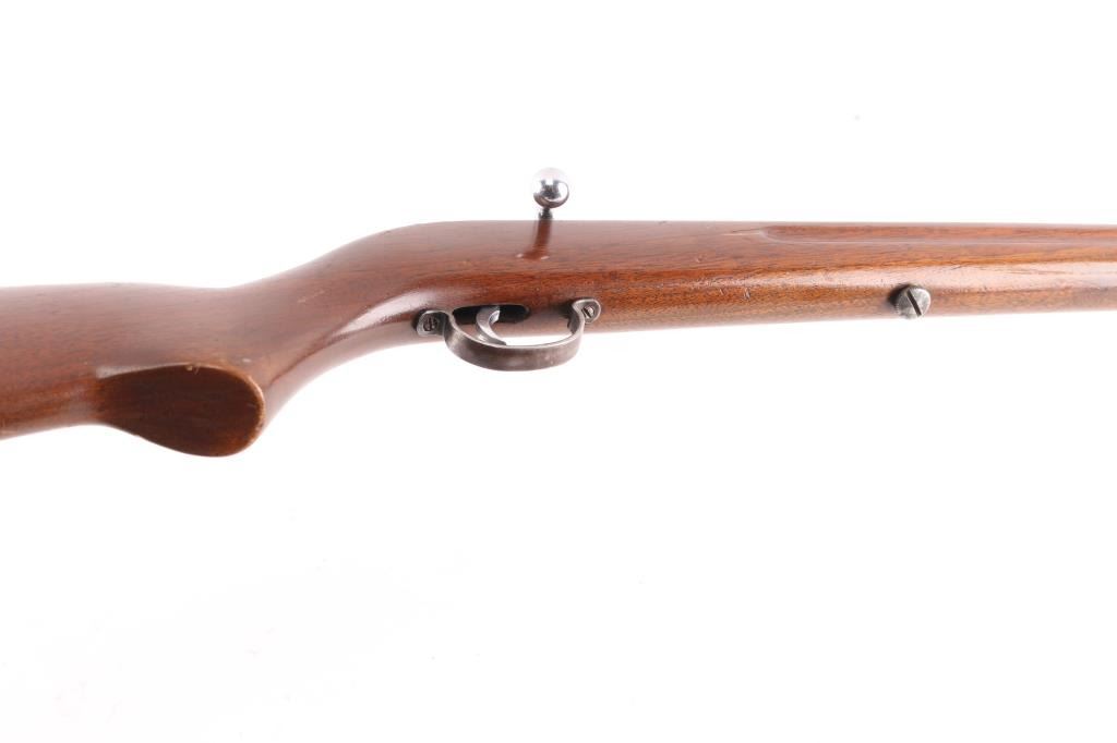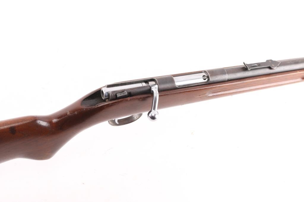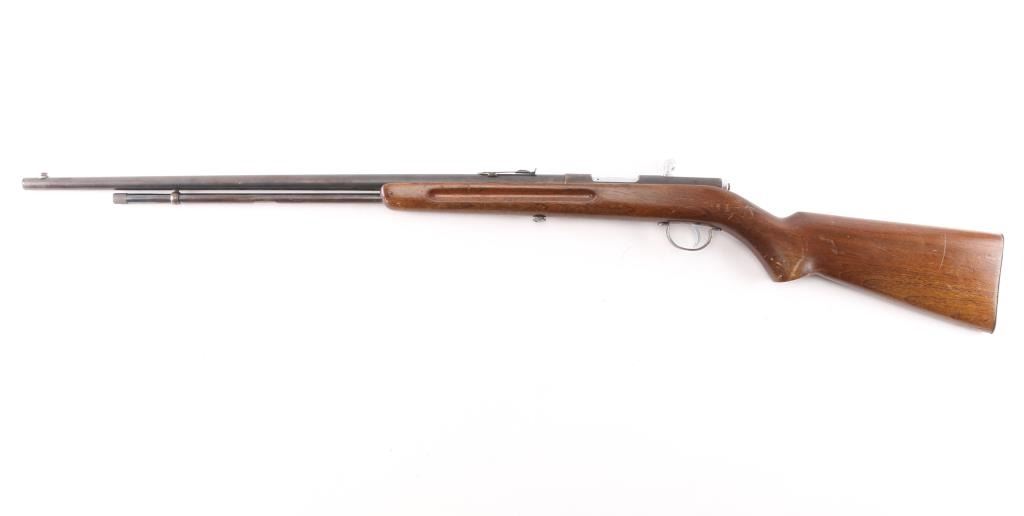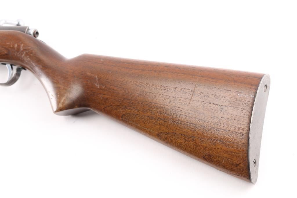 Bolt-Action. Manufactured 1932-1934. 24" round barrel with blade/bead front, and adjustable rear sporting sights. 3/4 length tube magazine under the barrel. Variable capacity. Receiver mounted thumb safety. Chrome bolt. One piece wood stock, with grooved forearm. Steel buttplate. Action is smooth/tight. Bore appears very good/bright. Wood stock is very good with some minor sctraches/scuffs. Blue metal finish has dulled, with some rubs, handling wear on the receiver but is mostly all there.NRA Condition-Fair to Good. C&R Firearm.