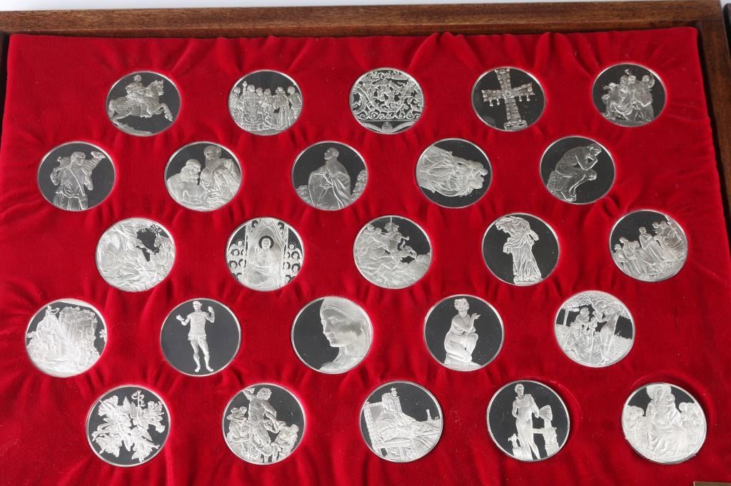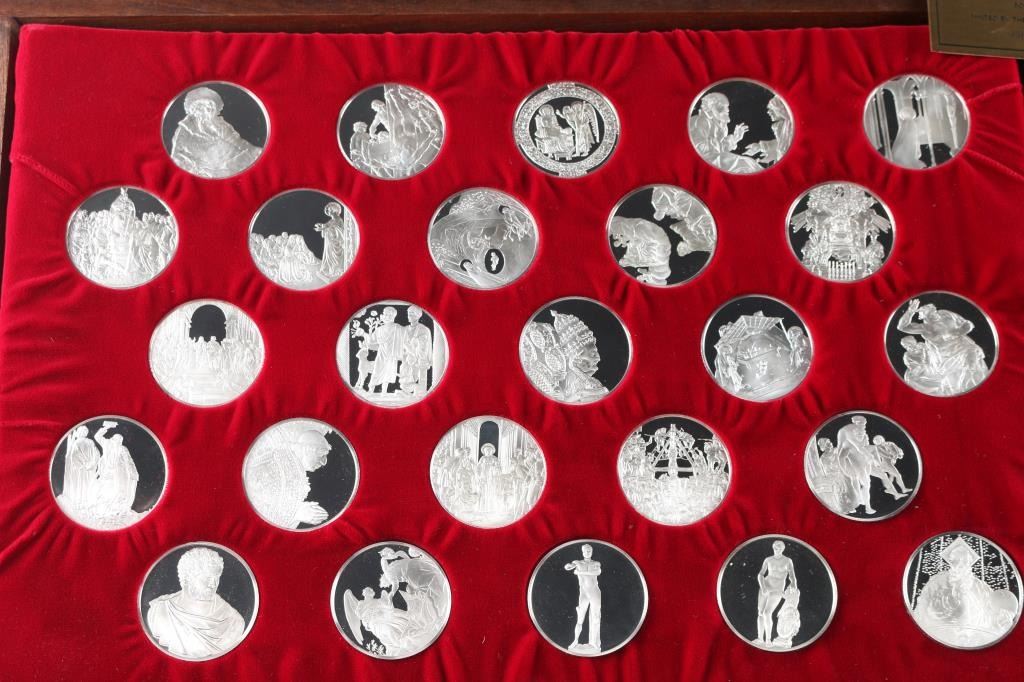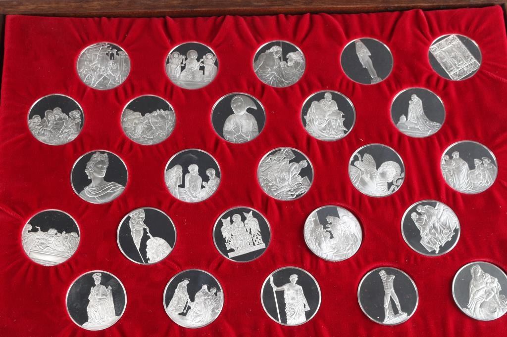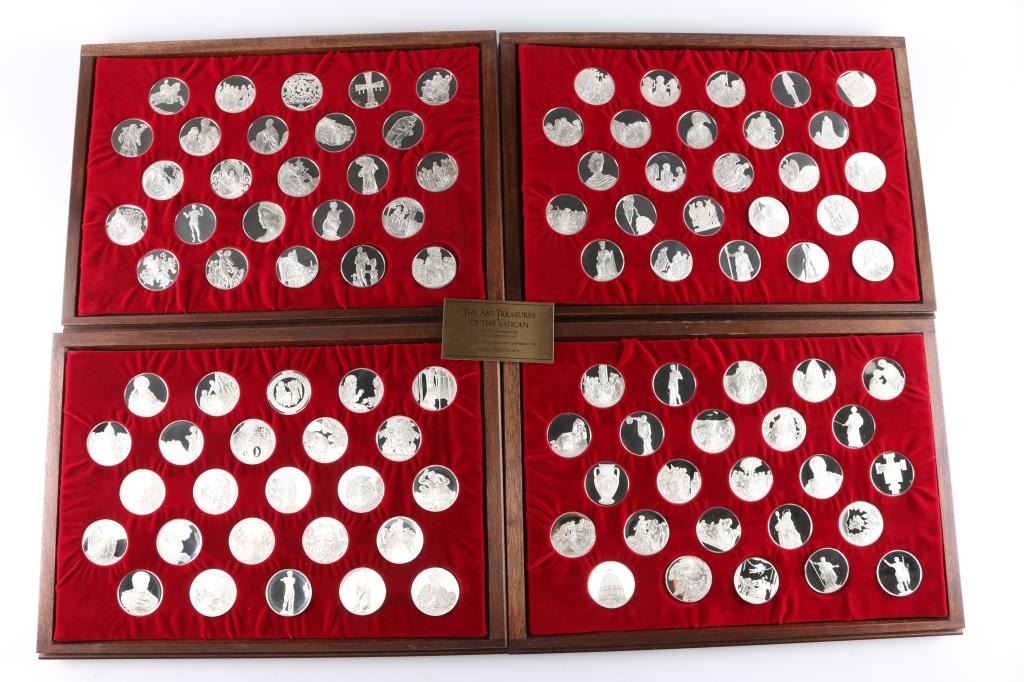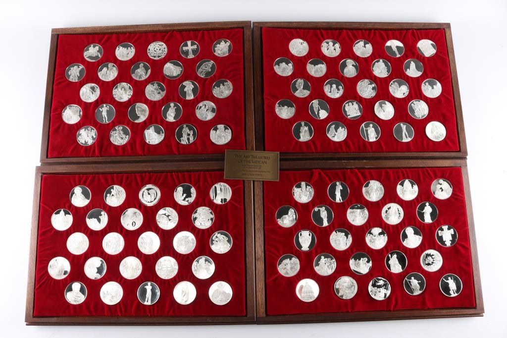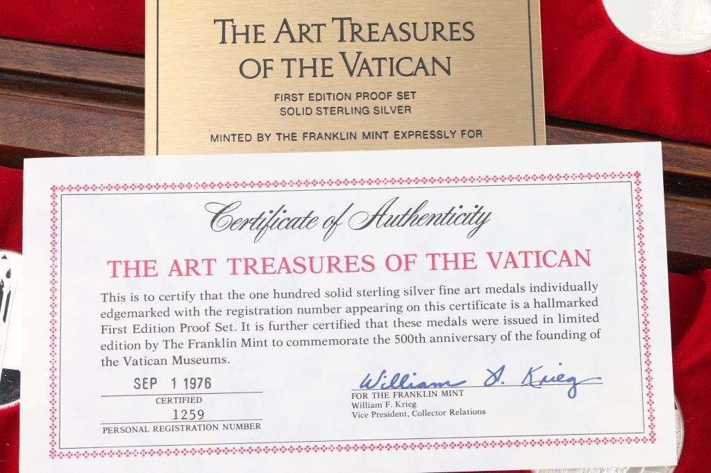 A set of fine art medals showing the 100 greatest art works in the galleries and museums of the Vatican. Solid sterling silver, edgemarked with the registration number appearing on attached COA, issued limited edition by the Franklin Mint, circa 1976. These medals are smaller than similar art medal sets like the 100 Greatest Masterpieces, but come in a large and elaborate floor standing cabinet that is also a really nice piece of furniture. Similar looking set to the Renaissance Art Treasures. Coins and chest are in excellent condition.