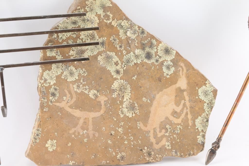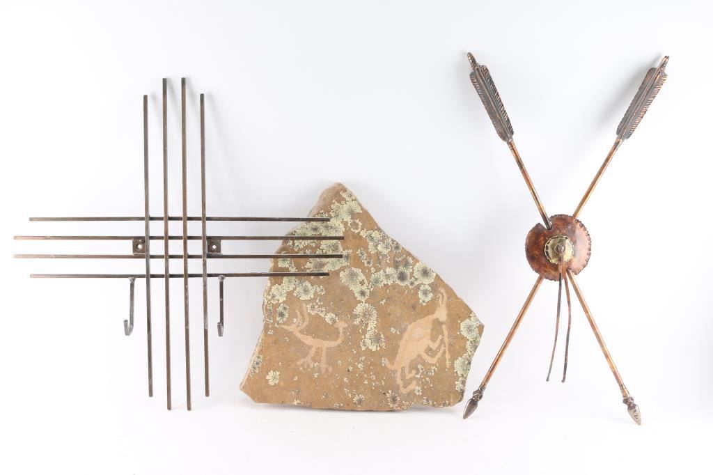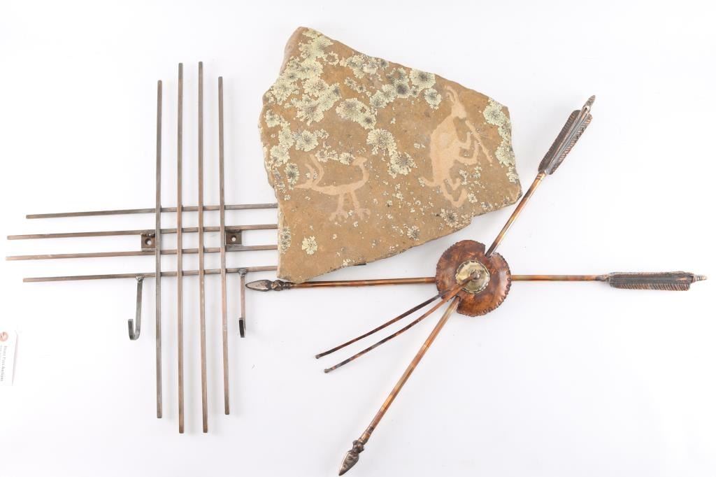Two petroglyphs on sandstone. Created by artist Ken Carter. Measures 22" x 22". Crossed arrows made of copper. Measures 24" x 13".