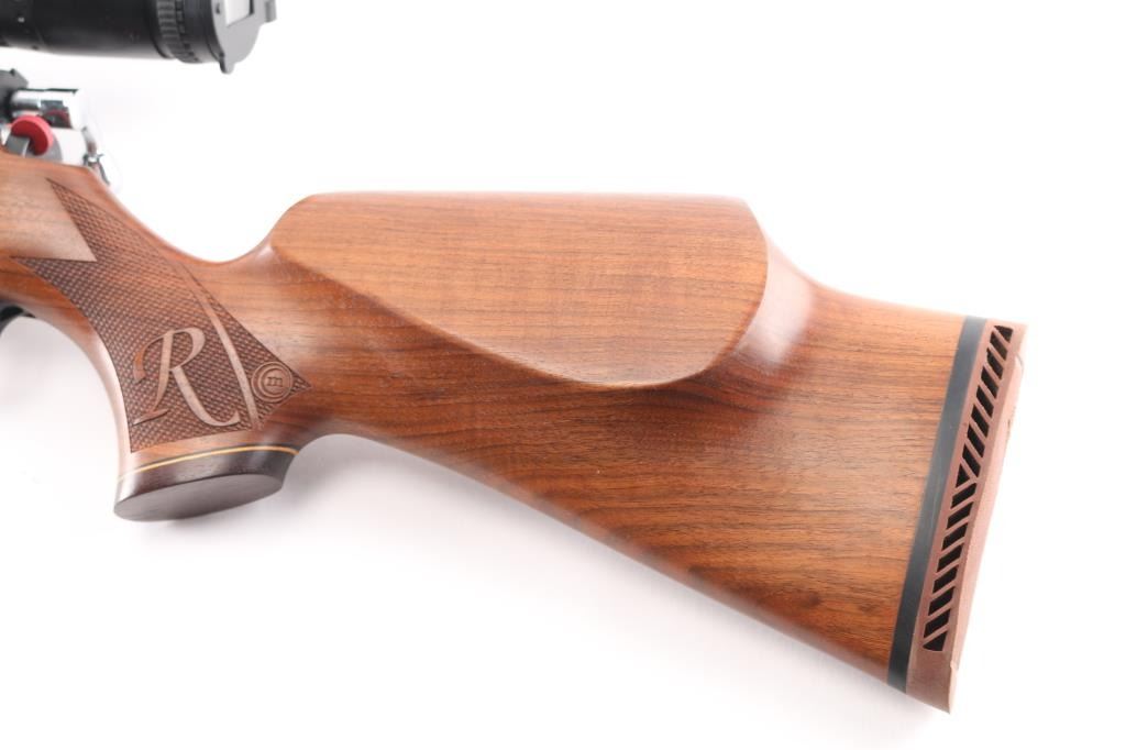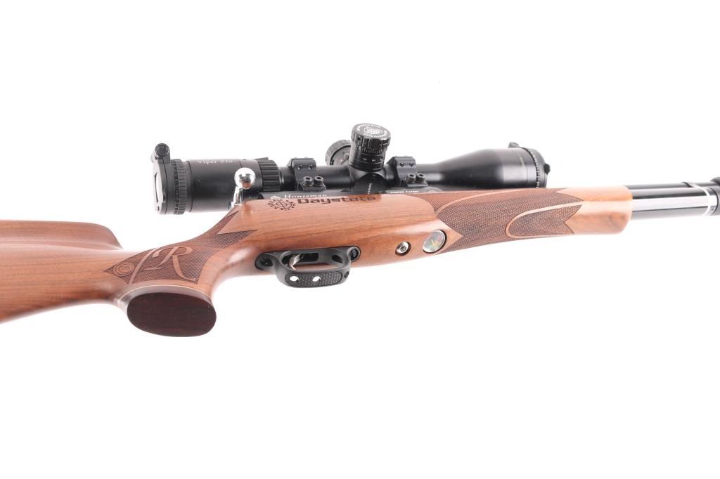 SN: RH9143. High quality right-handed air rifle. Classic English styling complements beautifully-carved, Italian-crafted walnut woodwork with high comb, shadow line cheek piece, factory rubber recoil pad, fine checkered wrist & forearm and contrasting grip cap with white spacer. Harper patent slingshot hammer and titan valve system, HUMA regulator factory installed and tuned. Two stage adjustable trigger, rotary safety at rear of action, 10 rd rotary magazine (Not included) 21" barrel with muzzle break. Mounted with a very good condition high quality MTC optics pro series Viper Pro 3-18X50mm scope, SCB2 Christmas Tree styled reticle, clear optics. Bore is excellent. Like new condition.