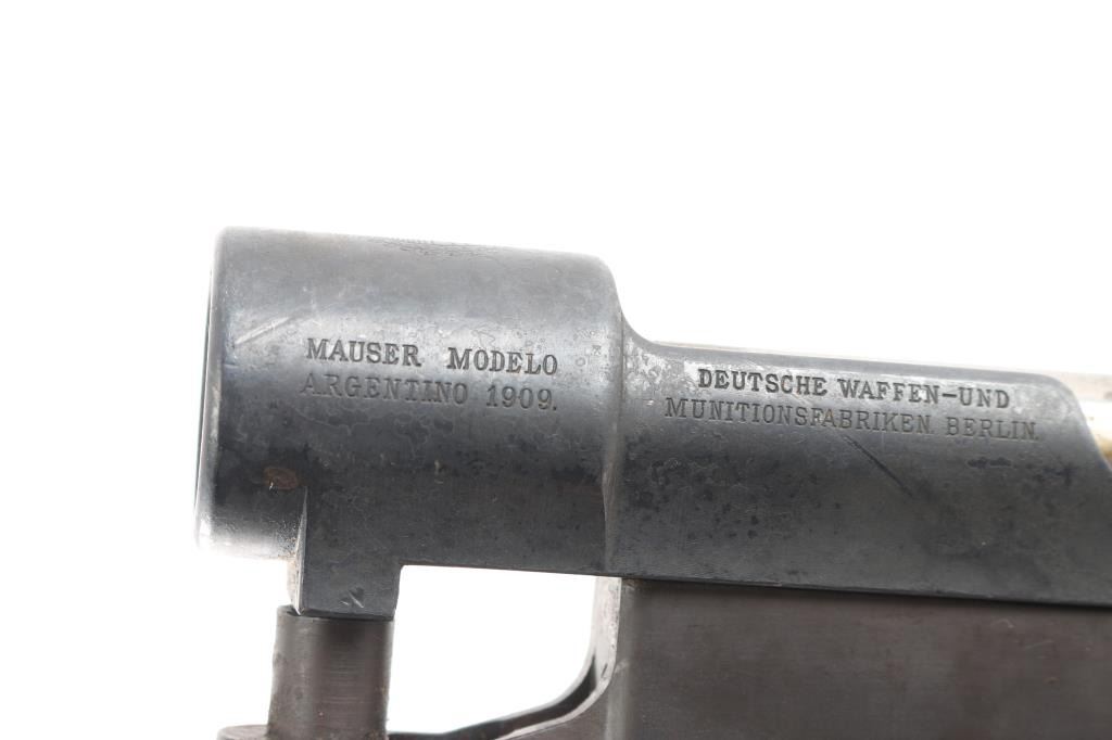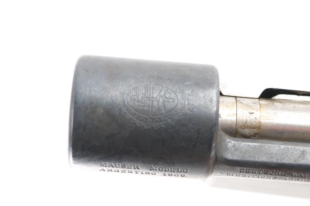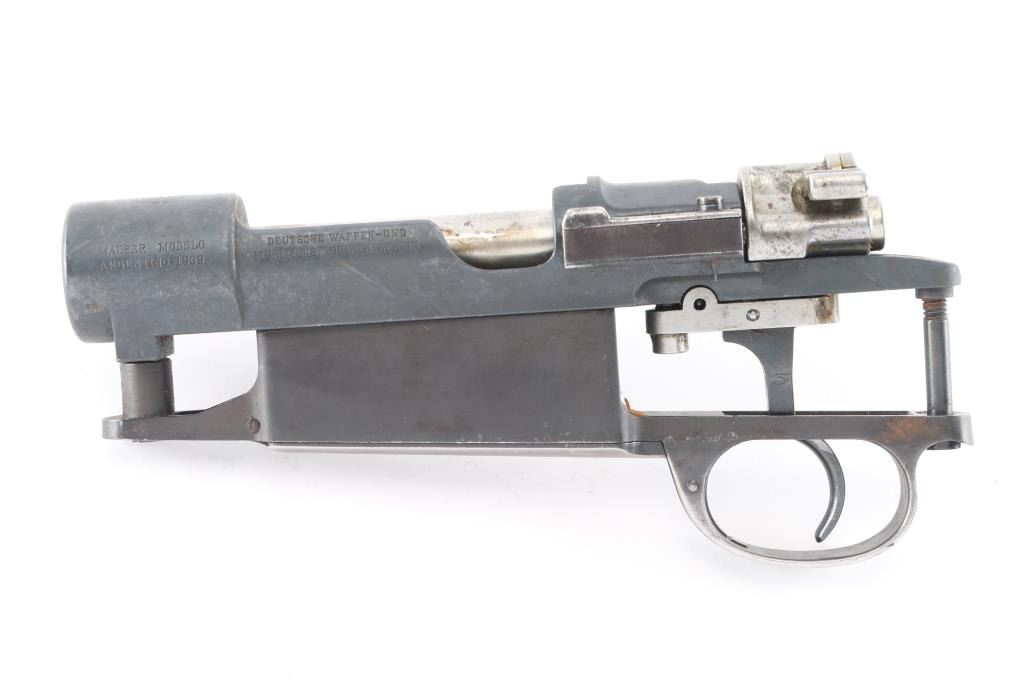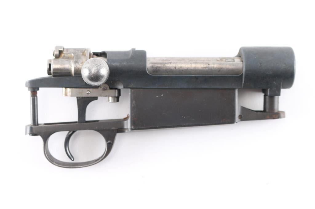 German made action for the Argentine model 1909 Mauser. Complete with bolt, trigger, bottom metal with hinged floor plate. Matching serial numbers on chamber, bolt and triggerguard. Straight bolt handle. Bolt action works well.NRA Condition-Very Good. (Action Only) Modern Firearm.