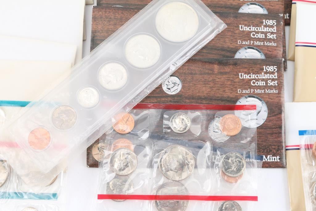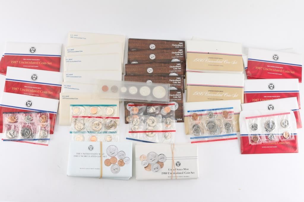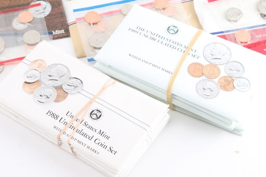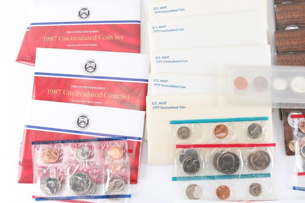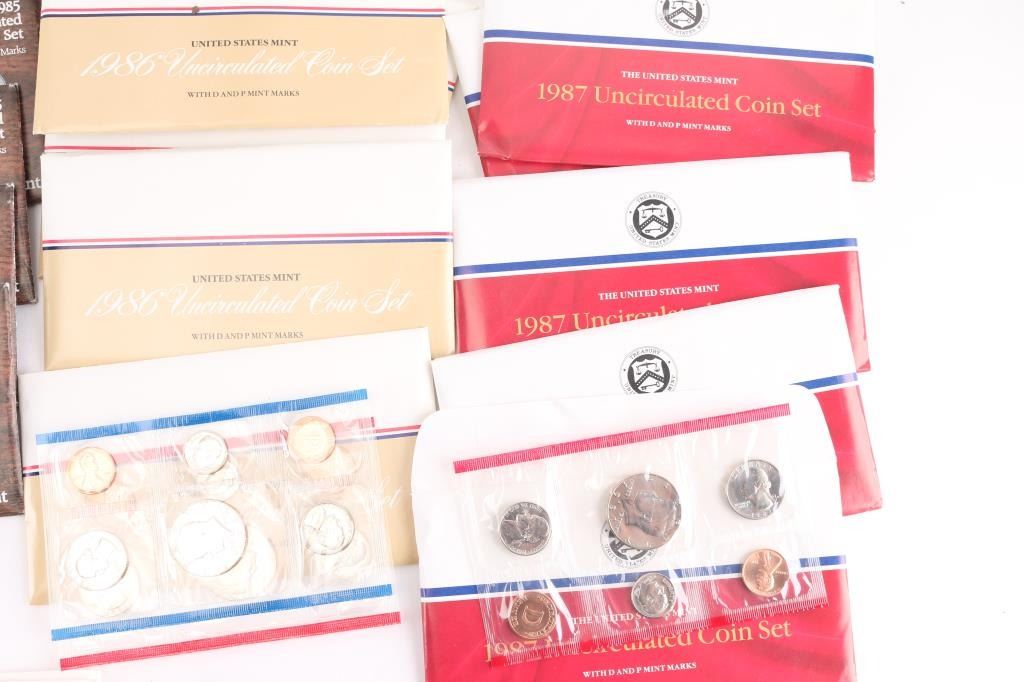 All in OGP. (5)1979 (1)1981 (5)1985 (5)1986 (10)1987 (5)1988 (5)1989 also (1) w/1922 silver dollar, 1963 half dollar, 1963 quarter, 1963 dime, 1963 nickel & 1963 penny.