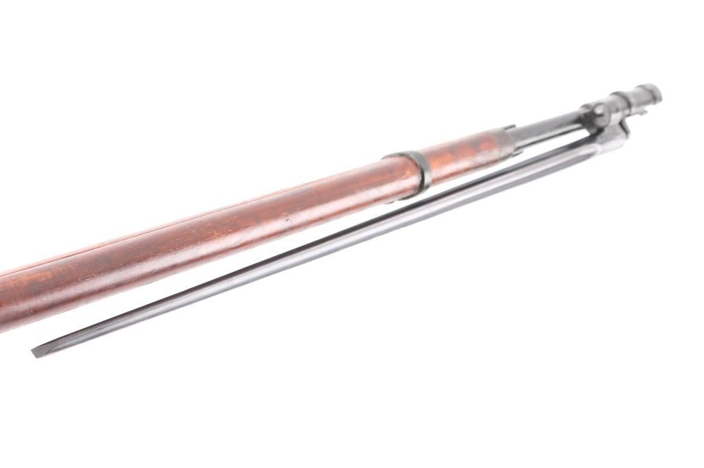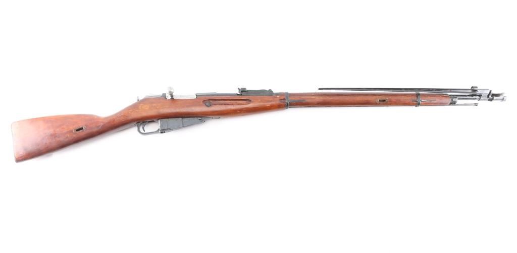 #9130471149. Russian (Soviet Union) WW2 military bolt action rifle dated 1924. Imported by CAI (Left Receiver). Arsenal refinished. Features hex chamber, blued finish, wood stock & handguard, 29" barrel, cleaning rod, hooded post front sight, tangent rear sight, sling slots. Bore is good, strong rifling, light frosting in the grooves. Metal retains 90% dark black color arsenal re-finish, with minor edge wear/scuffs. Bare metal bolt. Wood is very good with minor scratches/scuffs. Original serial number matches on receiver, bolt. floorplate, and steel buttplate. Includes correct issue cruciform bayonet. Has some cosmoline that needs to be cleaned off.Condition is NRA Near Very Good. C&R Firearm.