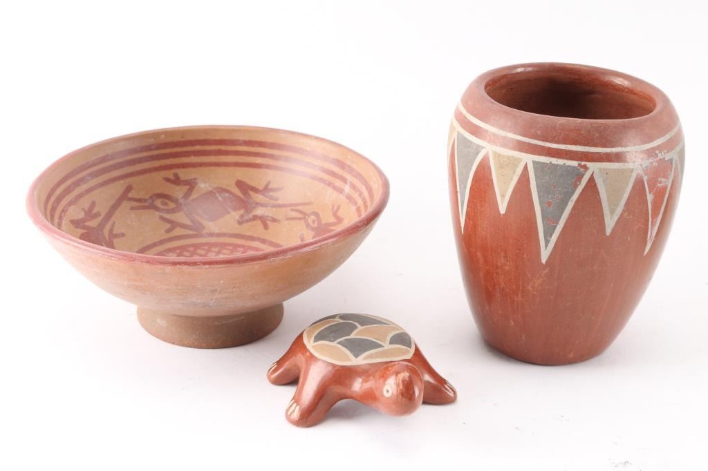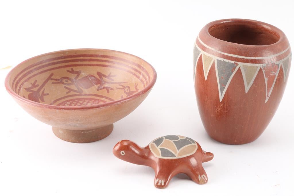 (1) Redware bowl with red painted lizard design inside. Measures 2 1/2" tall by 6" around.(1) Redware vase with grey and tan painted inverted triangle design. Measures 4 3/4" tall by 3" around.(1) Redward turtle with grey and tan painted design on back. Has a couple small chips on head, otherwise nice condition. Measures 4" long by 3" wide and 1" tall.