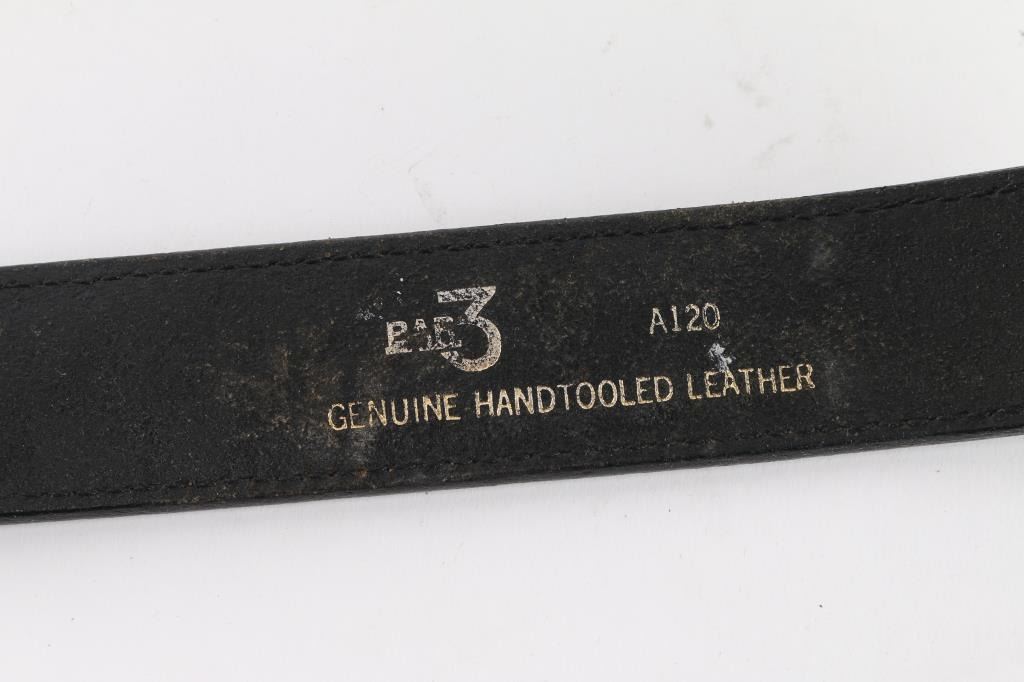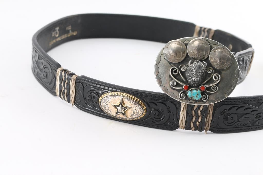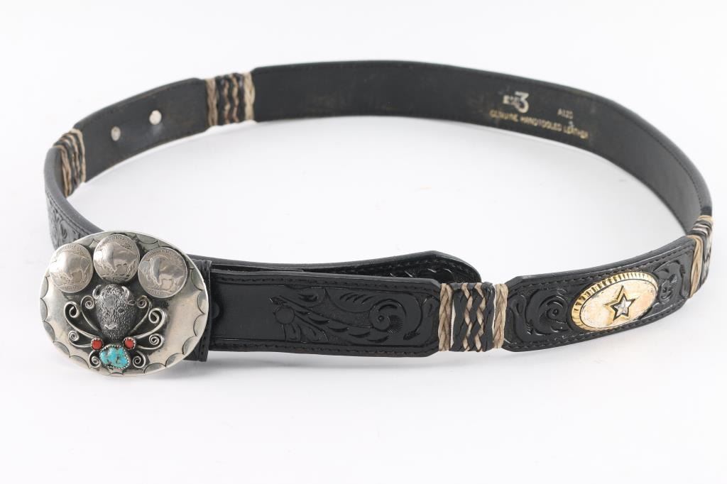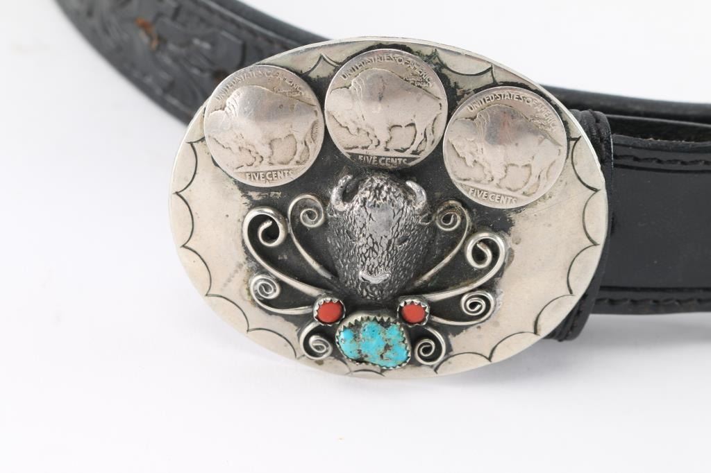 Black hand-tooled leather belt, measures 44 1/2", plus sterling silver buckle with turquoise nugget and two coral small stones. Three dimensional buffalo head and three 5cent buffalo coins decorating buckle, which measures 3 1/4".