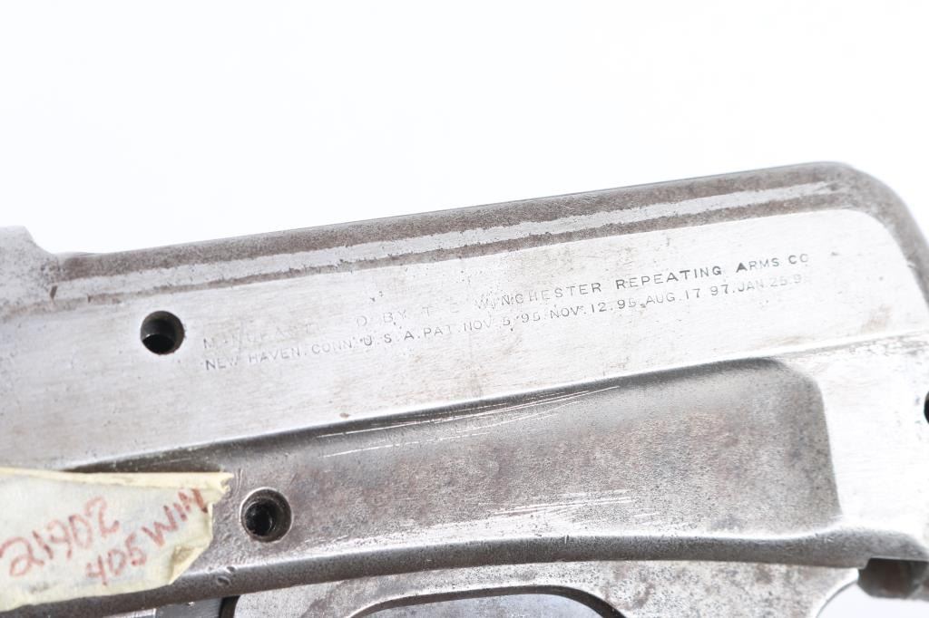 SN: 21902 1899 Vintage Winchester 1895 action with barrel, bolt, magazine and two-piece lever. The receiver flats have been semi-polished with the balance showing aged patina with some pitting. The .405 caliber barrel is unmarked and in the white. It measures approx. 28" and has provisions for sights & fore. Bore is very good/bright. Missing the screws including the internal screws.NRA Condition-Good. Modern Firearm.