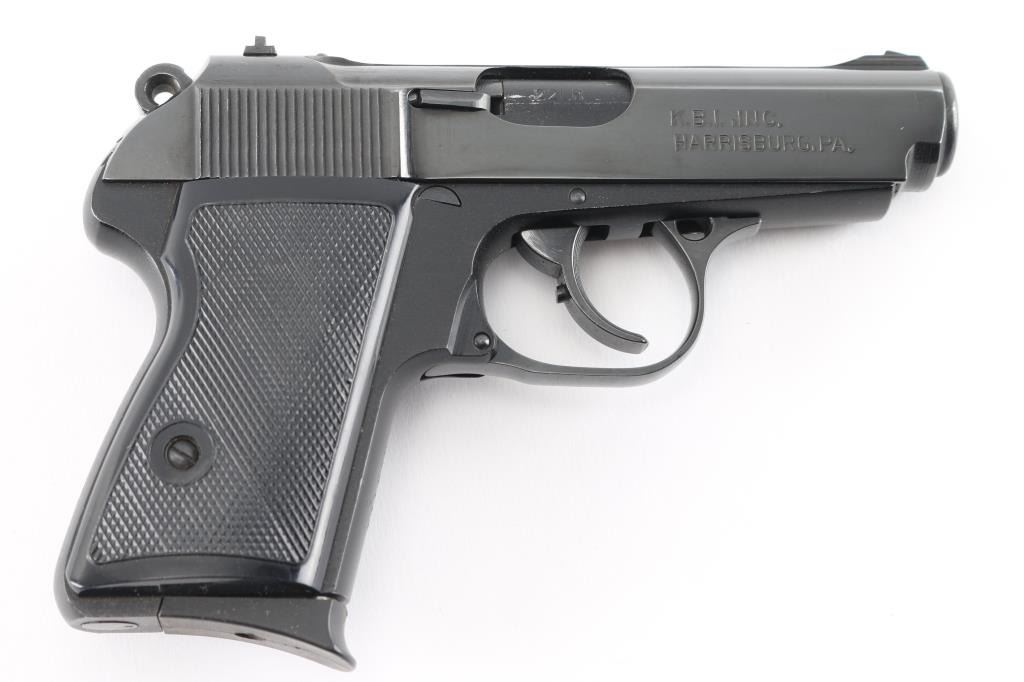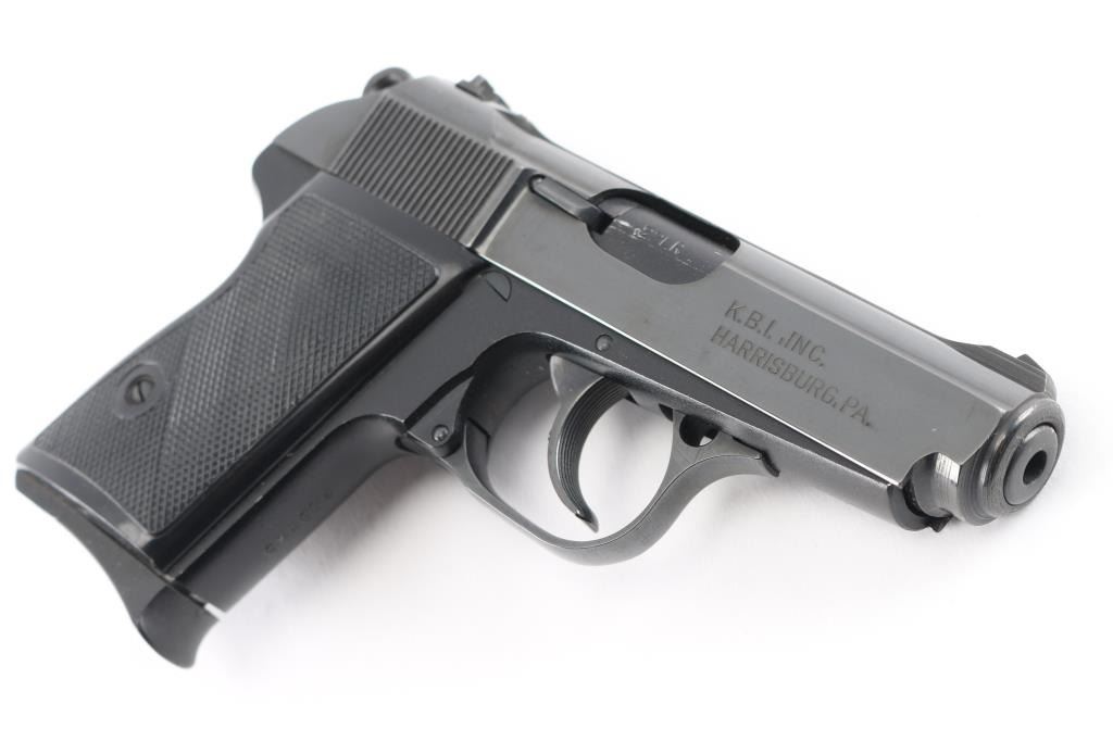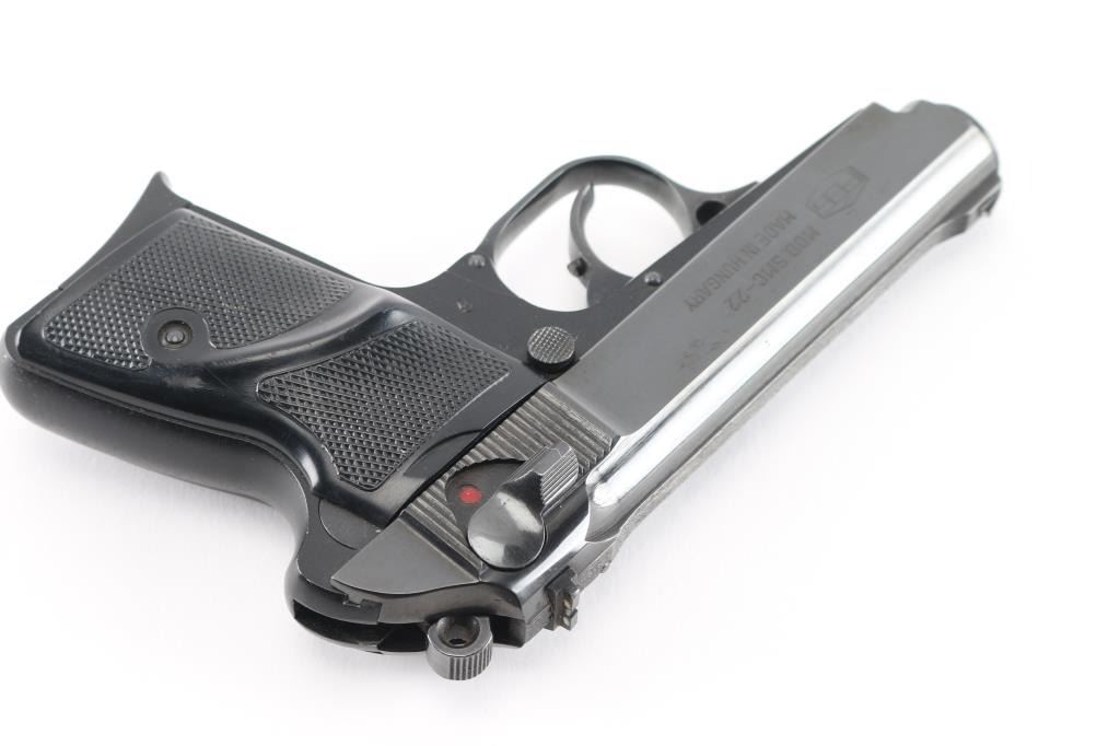 Hungarian made compact pistol, imported by KBI, Inc., Harrisburg PA. chambered in .22LR. Features Walther PPK styling and design influence with a 3 1/4" blued barrel, double action trigger, slide mounted decocking safety, push button mag release, trigger guard hinged for disassembly. Blued finish on slide with three white dot fixed front and rear sights, matching color aluminum alloy frame and a checkered black plastic grips with thumb rest on left side. Bore is very good/bright condition. Retains 90% finish with little handling marks and or edge loss. Grips are in good condition with normal wear. Magazine has a pinky rest base. Includes one 10rd metal magazine and a black nylon holster. Condition is NRA Very Good+*** Modern Firearm ***