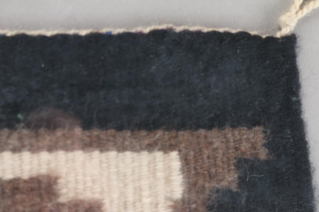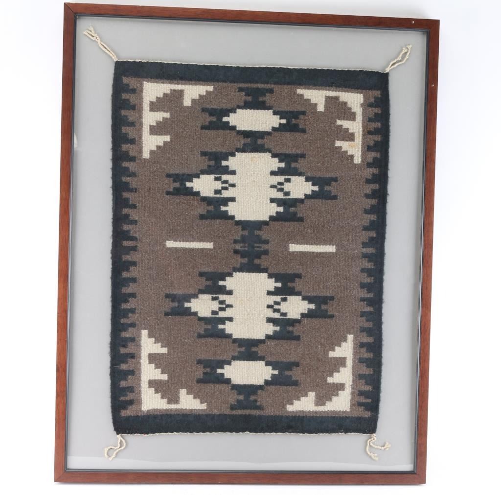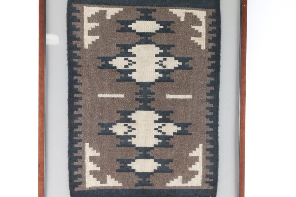 Navajo rug w/ crystal design, brown black and natural white colors. Rug is 21"x29". Frame is 29"x37".***Must be picked up. If shipped, the glass will be removed.***