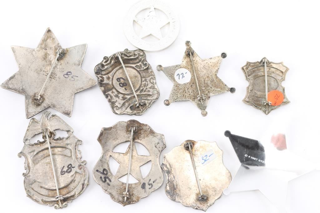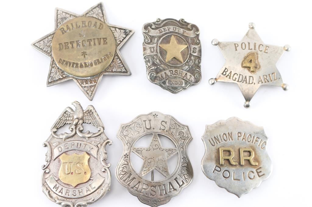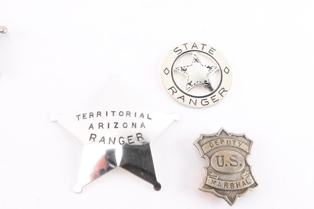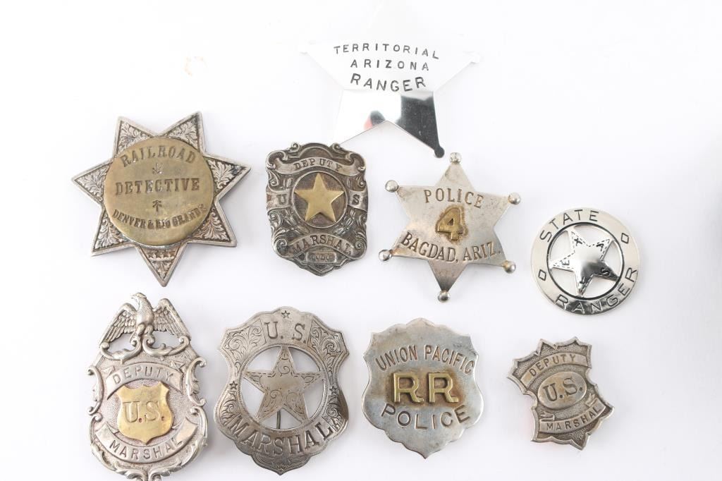 (1)Territorial Arizona Ranger, sterling silver from Franklin Mint in blue cloth pouch w/paper (1)State Ranger, sterling silver in blue cloth pouch w/paper (1)Railroad Detective Denver & Rio Grande, from Sun Badge Co. L.A. County ( 1)U.S. Deputy Marshall from AS&S Co. in small gray box (2)U.S. Deputy Marshall, no markings (1)U.S. Marshall, no markings (1)Union Pacific R.R. Police, no markings (1)Police Bagdad, Ariz., no markings.