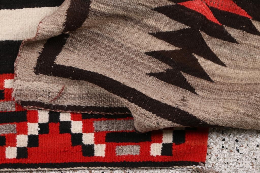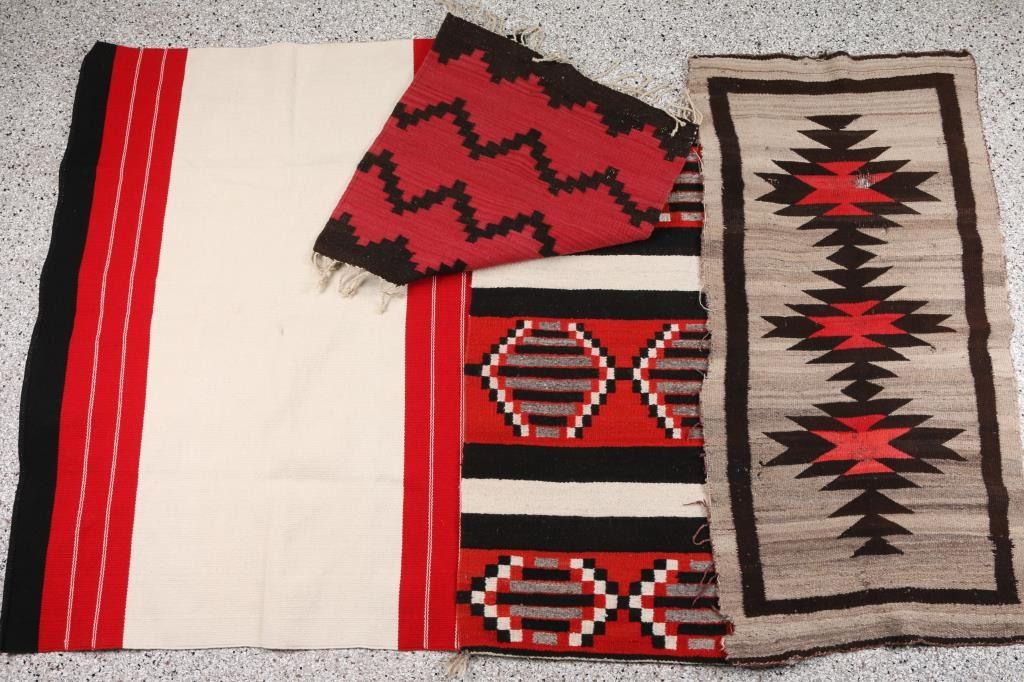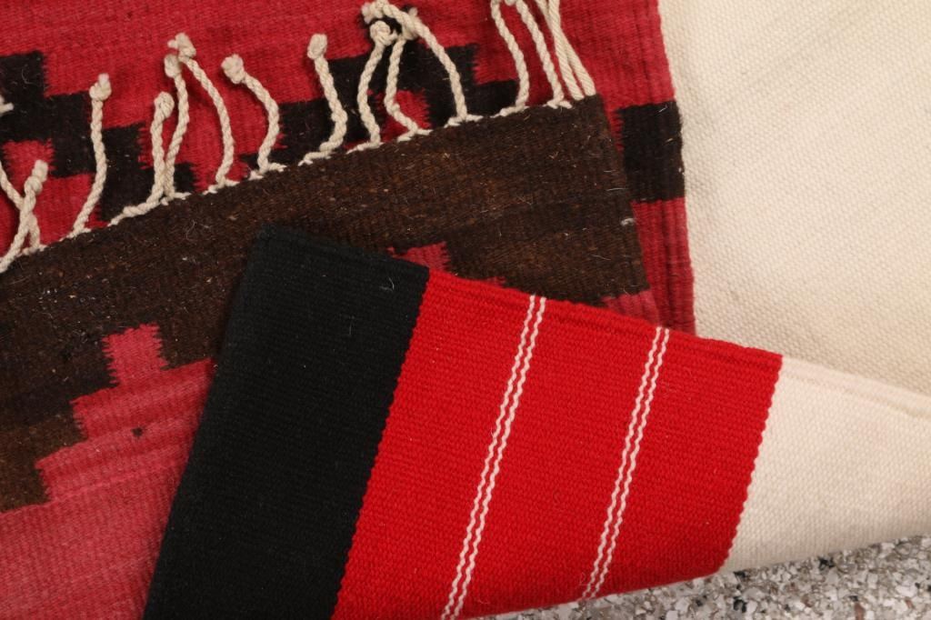 (1) White, Red, and black striped rug 23"X32"; (1) Mexican Rug red black and red with geometric pattern 23"x23"; (1) Saddle Blanket striped with red, black, and white 23"x38"; (1) Older Navajo Rug 48"x25" heavy damage holes losses etc.