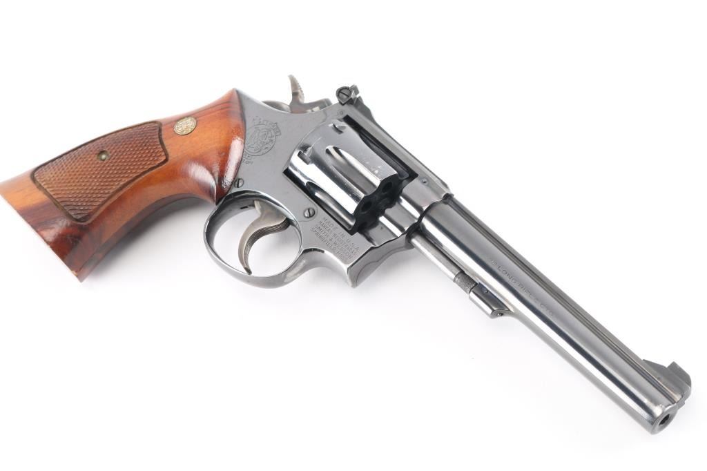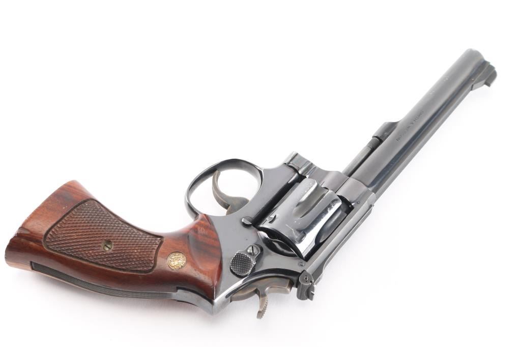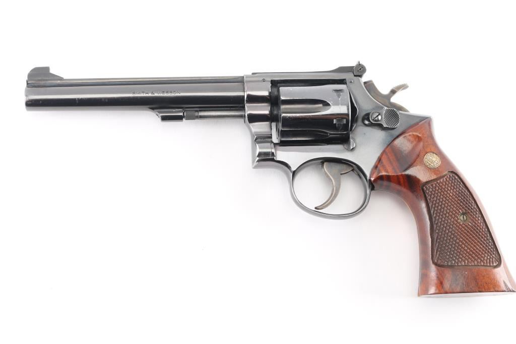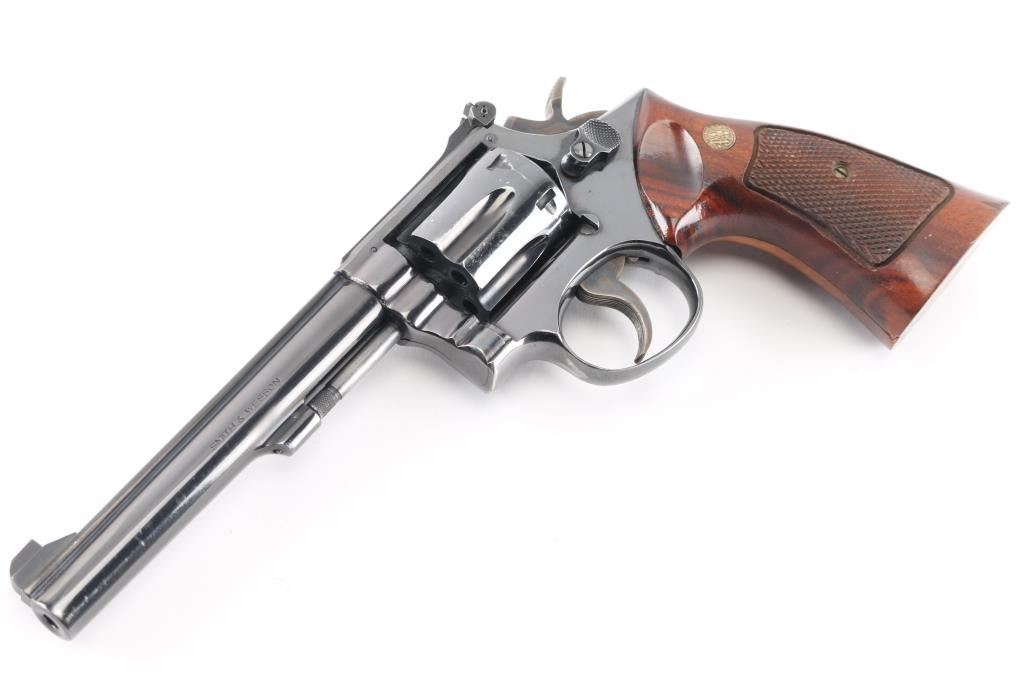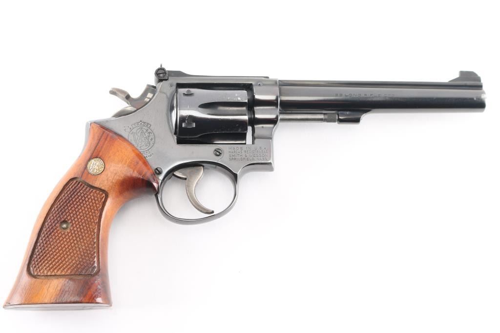D/S Action revolver. 6-rd Capacity. The "K-22 masterpiece". Manufactured 1972. Model 17-3 built on a square butt K target frame . 6" serrated ribbed pinned barrel with patridge front, and micro-click adjustable rear sights. Serrated trigger, 10-groove serrated fore, and backstrap. Bore is excellent/bright. Case-hardened hammer/trigger are excellent. Checkered walnut target grips with S&W Medallions are overall very good with a couple of minor chips. Action is smooth/tight. Blued finish is about 90% with edge/handling wear, some scuffs, rubs.NRA Condition-Very Good. C&R Firearm.