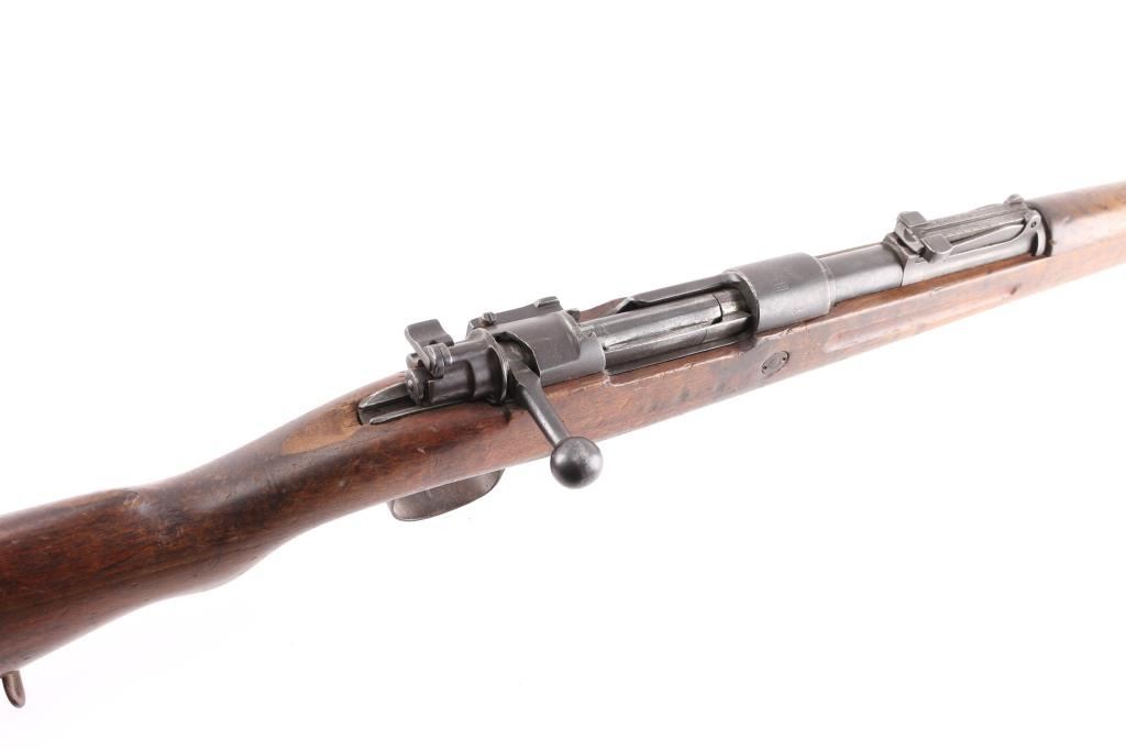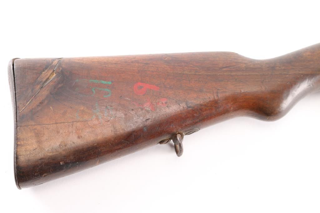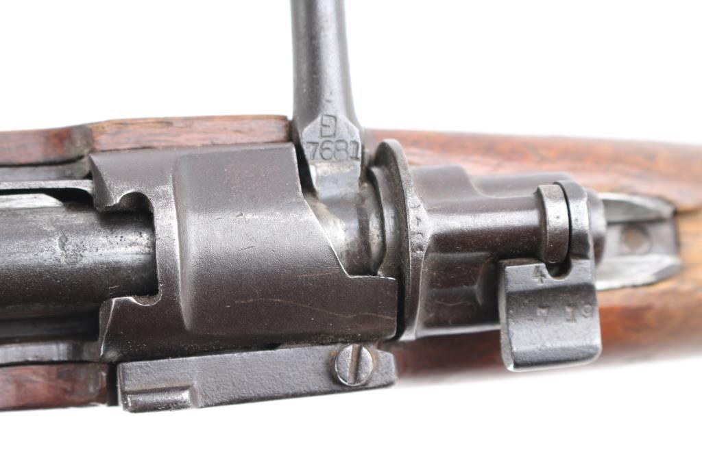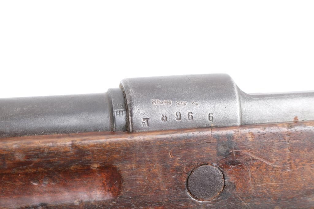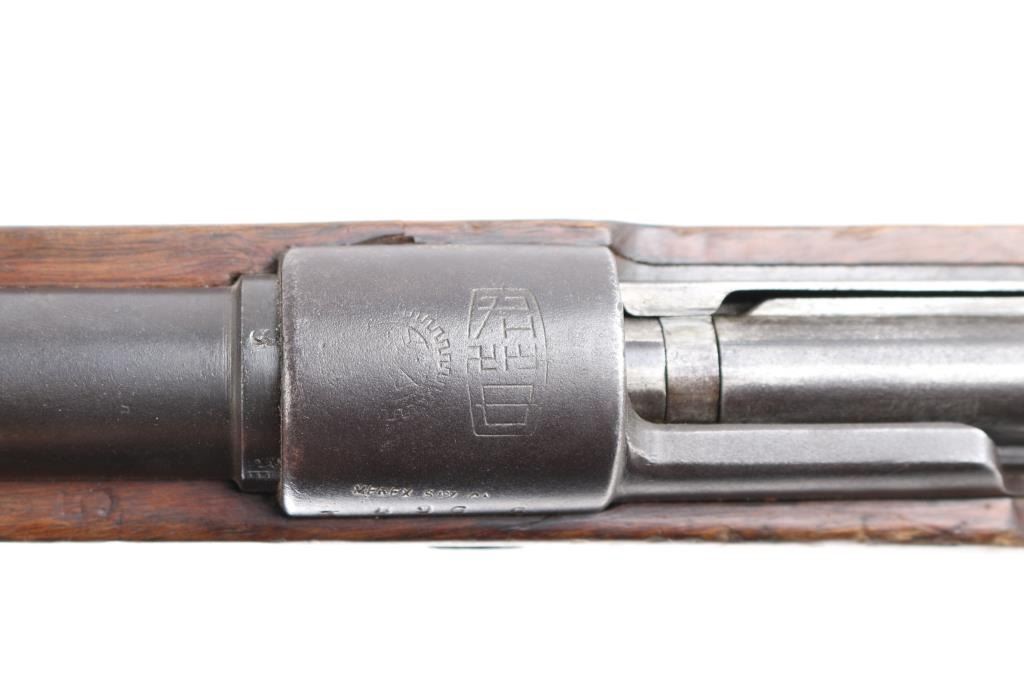 Chinese military bolt action service rifle chambered in 7.92x57mm Mauser, manufactured circa 1936-1949. Imported by Merex with import marks on the left side of the chamber. Features a blued finish, 23.6" barrel, dovetailed inverted v front sight, tangent rear sight graduated sight to 2,000 meters, bayonet lug, two barrel bands, straight bolt handle, three position flag safety on the rear of the bolt, smooth trigger, internal 5 round box magazine with removable floorplate, thumb & stripper clip guide cuts in the receiver, smooth hardwood handguard and semi-pistol grip shoulder stock with grasping grooves in the forend & smooth metal buttplate. Mismatched serial numbers. The chamber is marked with the Hanyang Arsenal mark and the banner has the word type and Chang Kai Shek in it along with a reverse swastika, a good luck symbol and symbol for eternity. The majority of the metal surfaces exhibit an even dark grey/blue patina. Action is smooth, the bore is dark/frosted with rifling and the wood stocks are good with blemishes throughout. No cleaning rod.NRA Condition-Good. C&R Firearm.