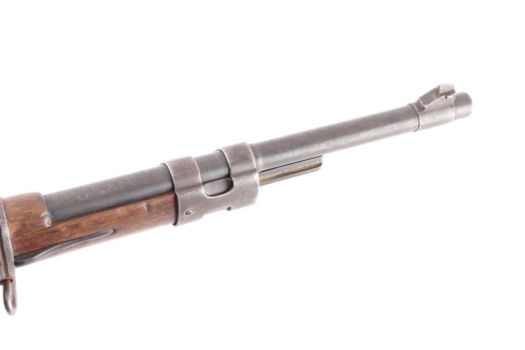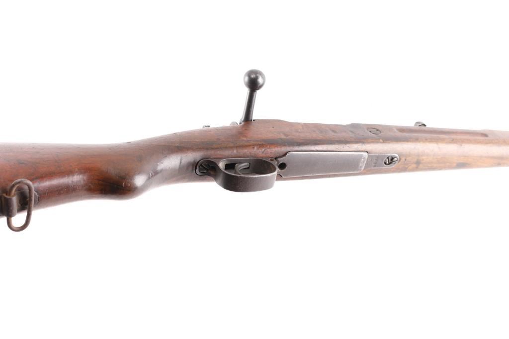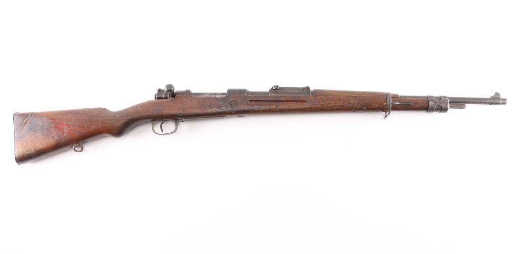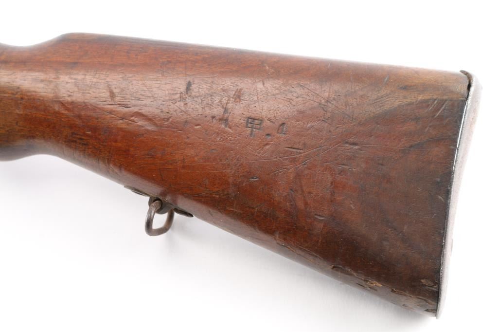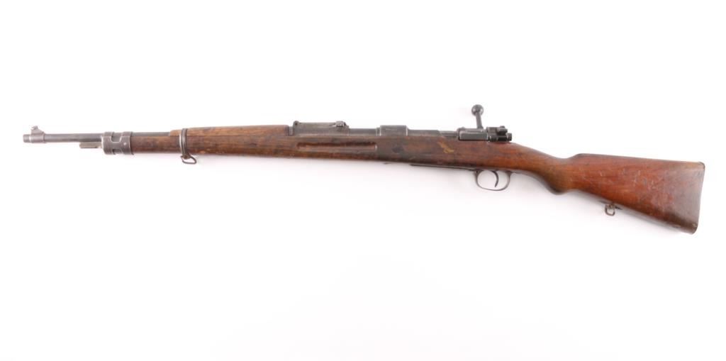 Chinese military bolt action service rifle chambered in 7.92x57mm Mauser, manufactured circa 1936-1949. Imported by Merex with import marks on the left side of the chamber. Features a blued finish, 23.6" barrel, dovetailed inverted v front sight, tangent rear sight graduated sight to 2,000 meters, bayonet lug, two barrel bands, straight bolt handle, three position flag safety on the rear of the bolt, smooth trigger, internal 5 round box magazine with removable floorplate, thumb & stripper clip guide cuts in the receiver, smooth hardwood handguard and semi-pistol grip shoulder stock with grasping grooves in the forend & smooth metal buttplate. Mismatched serial numbers. The chamber is marked with the Hanyang Arsenal mark and the banner has the word type and Chang Kai Shek in it along with a reverse swastika, a good luck symbol and symbol for eternity. The majority of the metal surfaces exhibit an even dark grey/blue patina. Action is smooth, the bore is dark/frosted with rifling and the wood stocks are good with blemishes throughout. No cleaning rod.NRA Condition-Good. C&R Firearm.