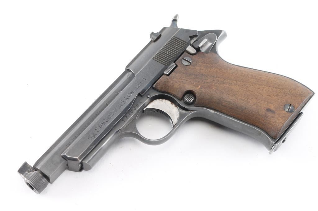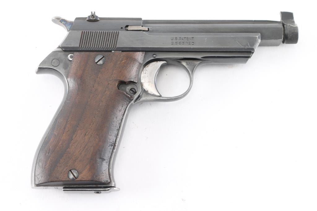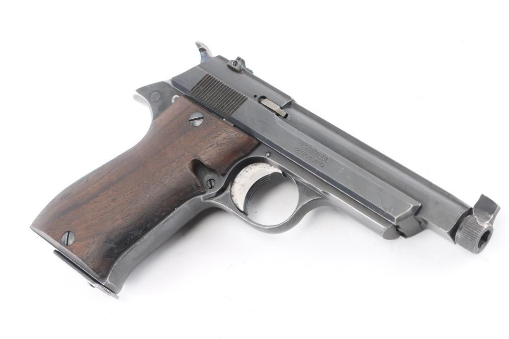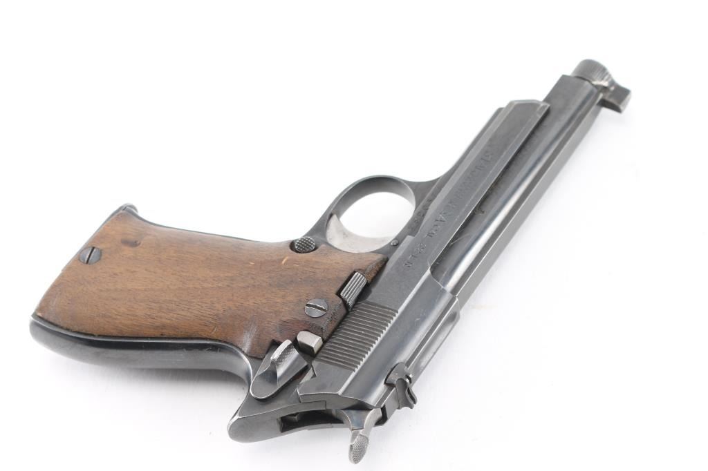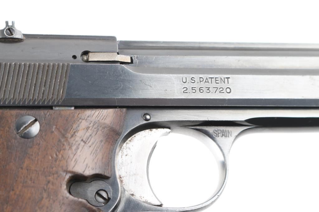 Note* This pistol has been modified by shortening the barrel, threading the barrel, a thick front sight blade has been attached to the screw-in, serrated barrel protector. Spanish semiautomatic rimfire pistol imported by Garcia, with import markings on the left barrel. Features blued finish, 3 3/4" squared-off slab sided heavy barrel, smooth wood grips, wide trigger shoe, push button mag release, rear sight is missing the leaf, single action, knurled hammer spur, thumb safety. Bore is very good bright condition. Retains 90% finish with signs of normal wear and use. Grips are very good. Includes one magazine. Date code S1-1974.Condition is NRA Very Good as Modified. C&R Firearm.