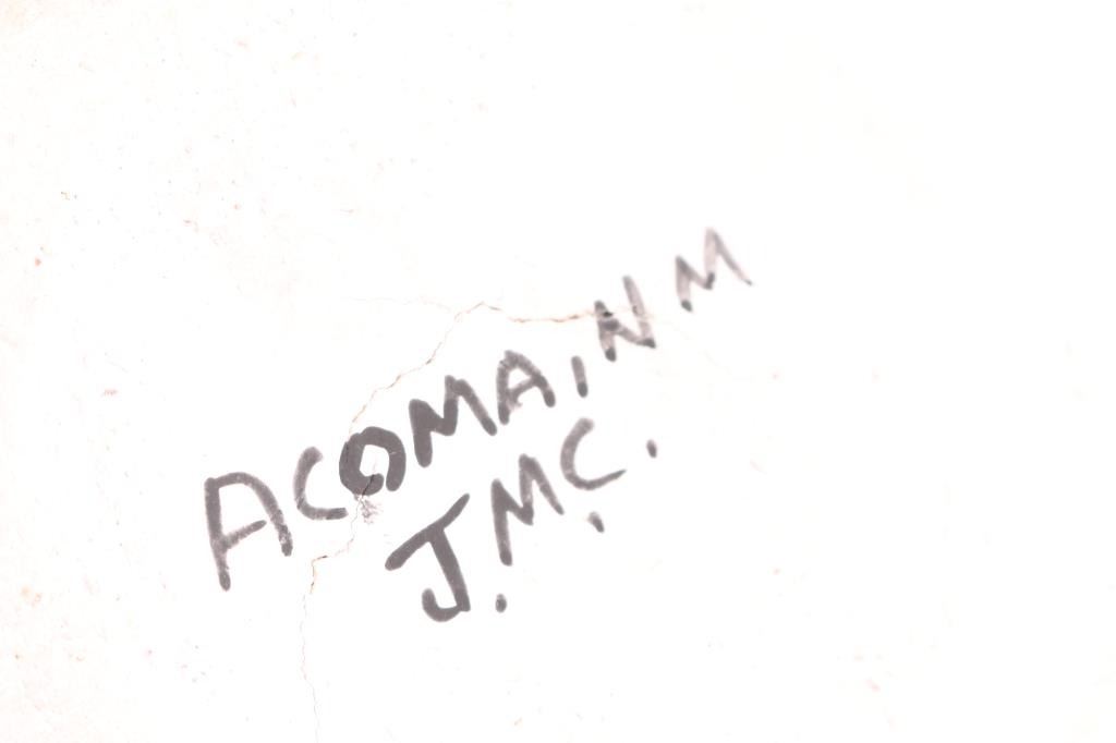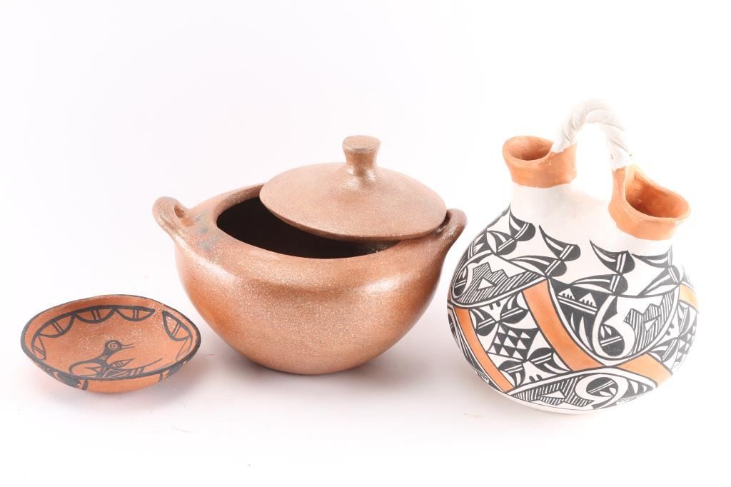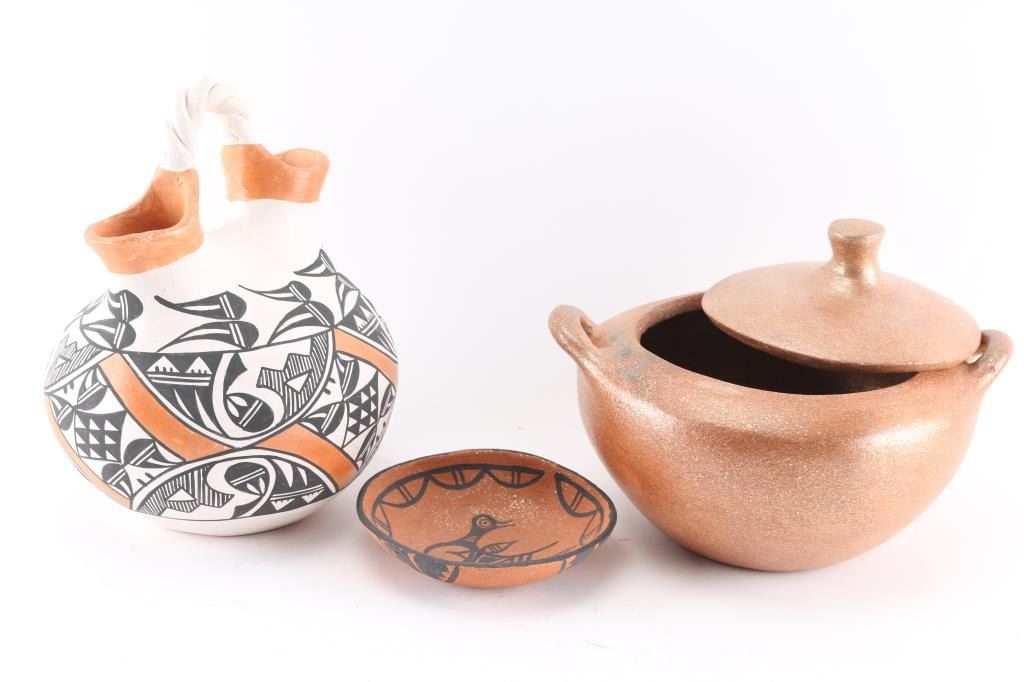 (1) Acoma wedding vase with rope handle, signed on bottom, good condition, measures 10" tall and 7" wide. (1) Glazed lidded pot with two handles, good condition, measures 8" tall and 9 1/2" around. (1) Small dish, glazed, signed Rose Pacheco on bottom, good condition, measures 1 1/4" tall and 5" around.