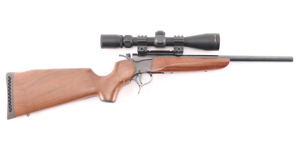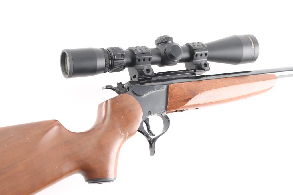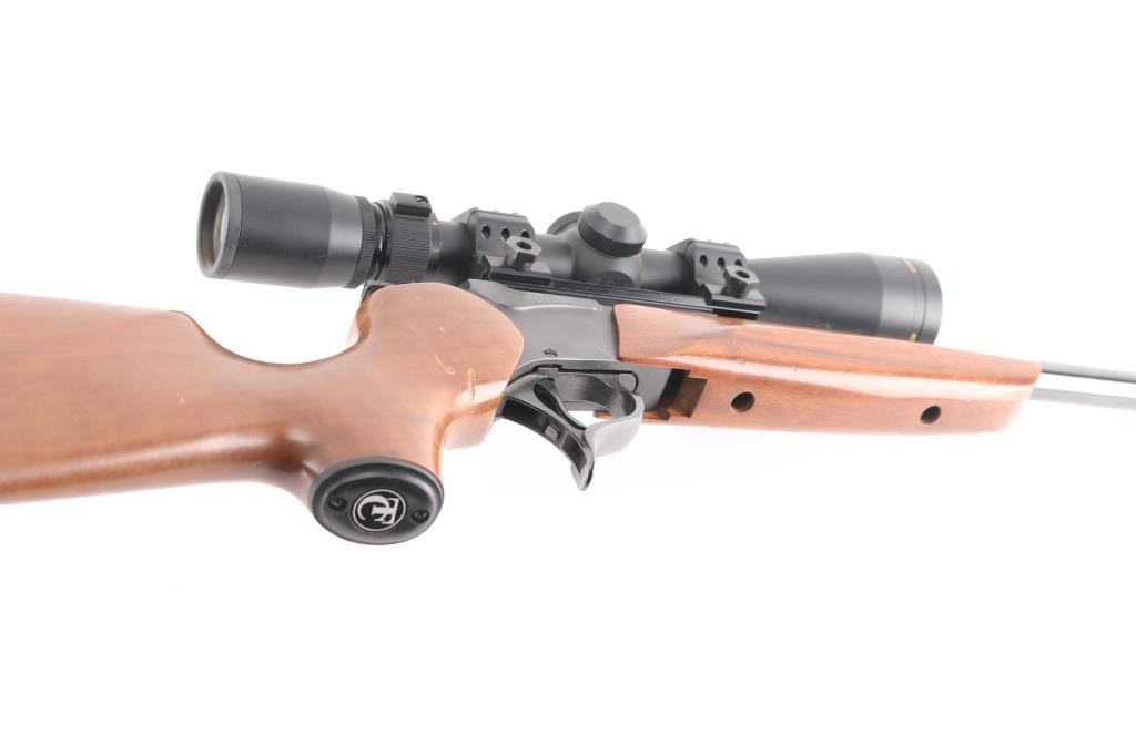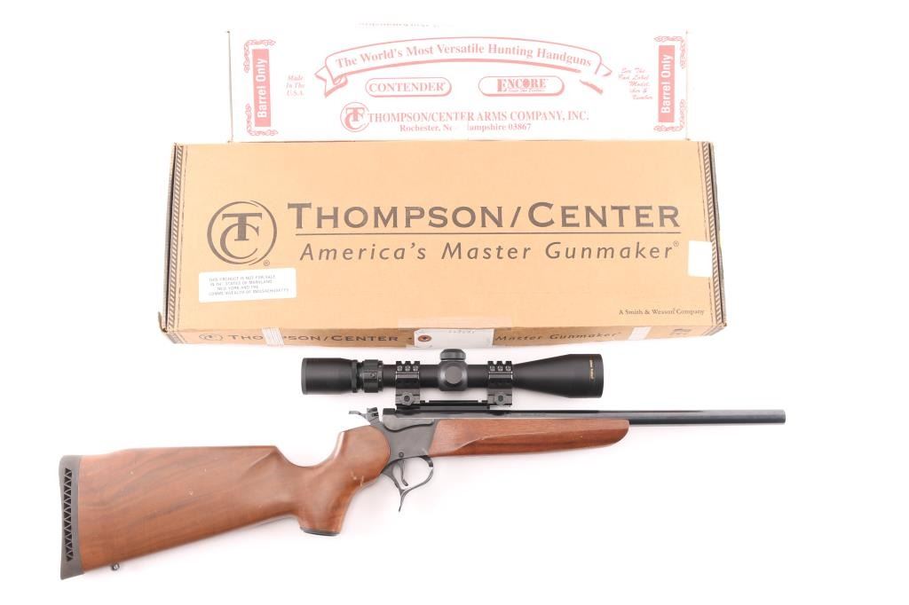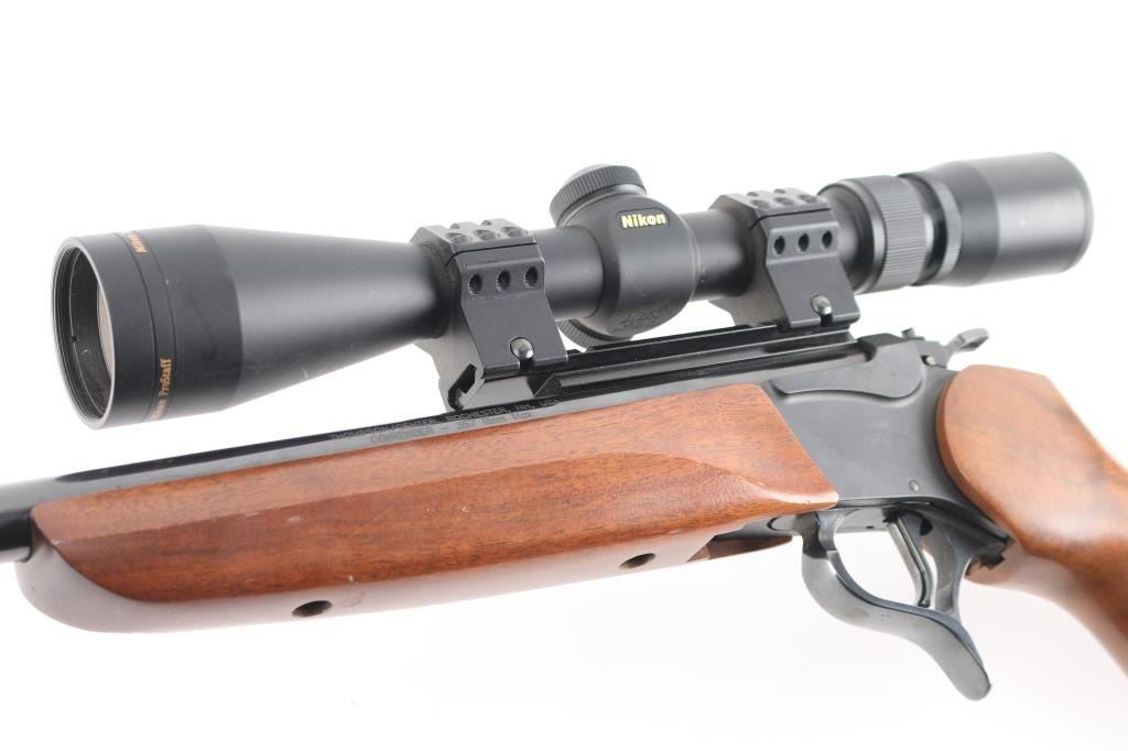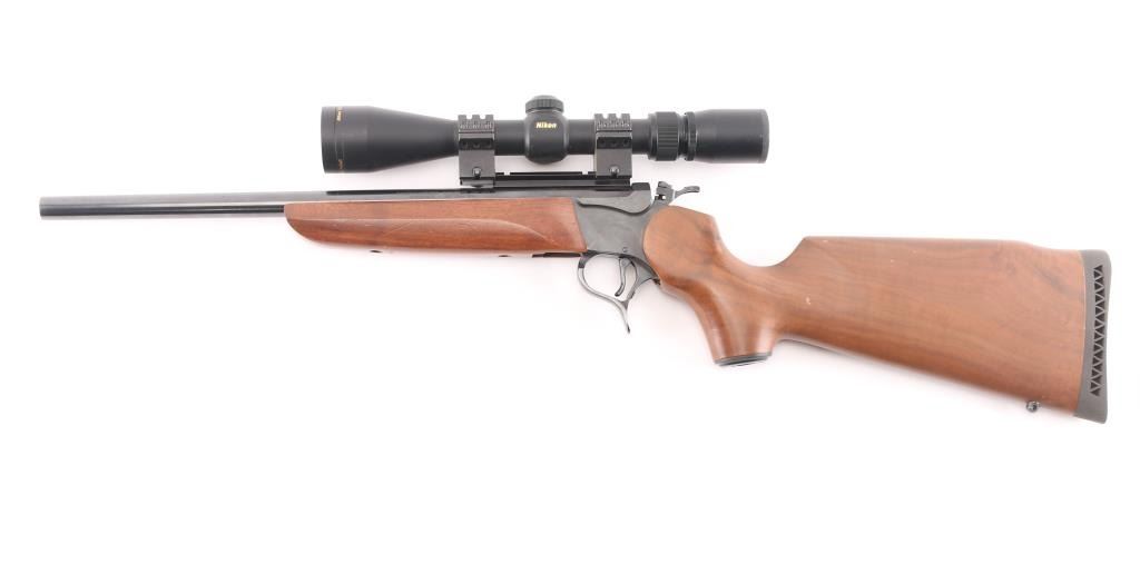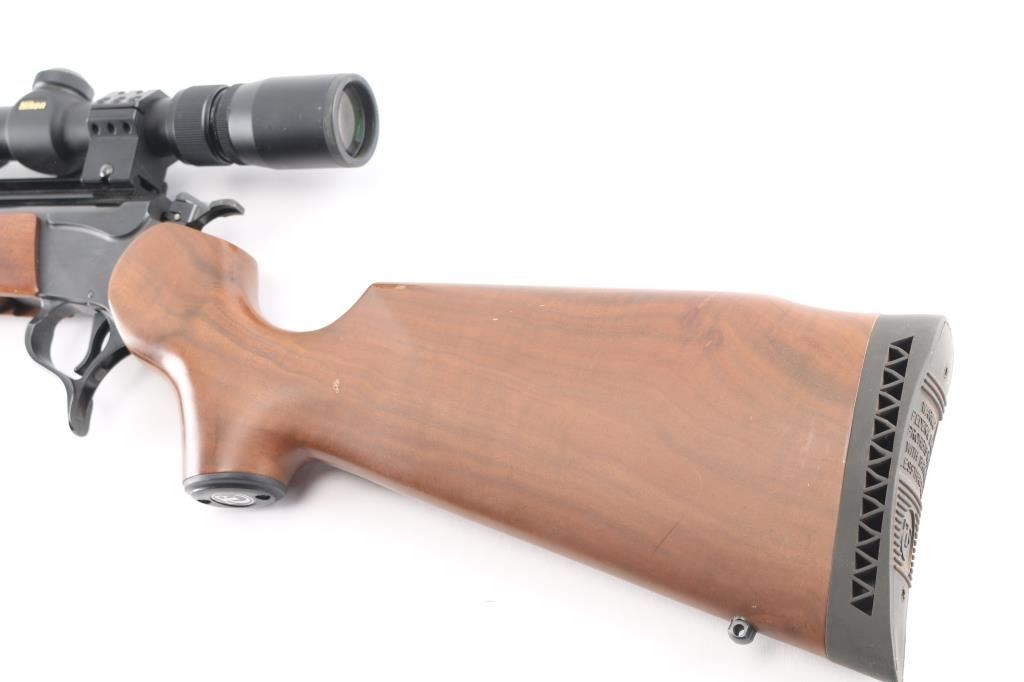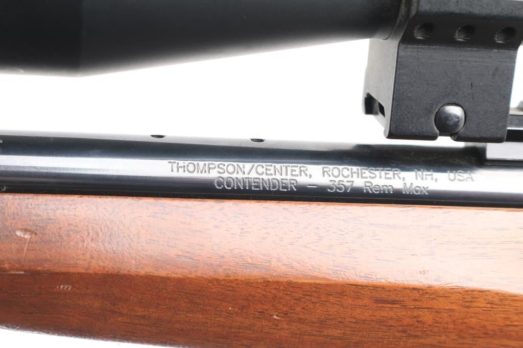 Break-action single shot rifle chambered in .357 Remington Maximum. Features blued finish, 16.25" barrel, sights removed, mounted Nikon Prostaff scope, smooth walnut pistol grip shoulder stock with plastic grip cap and forearm, vented black rubber butt pad, smooth trigger, three-position firing pin selector switch on the hammer and one sling swivel stud. Exhibits 98% finish with little to no handling marks, wood is good with scattered dents and scratches on stock. Action is crisp, bore is pristine with strong rifling. Scope is clear. Includes factory box, manual and locks. Condition is very good++. ***Modern Firearm***