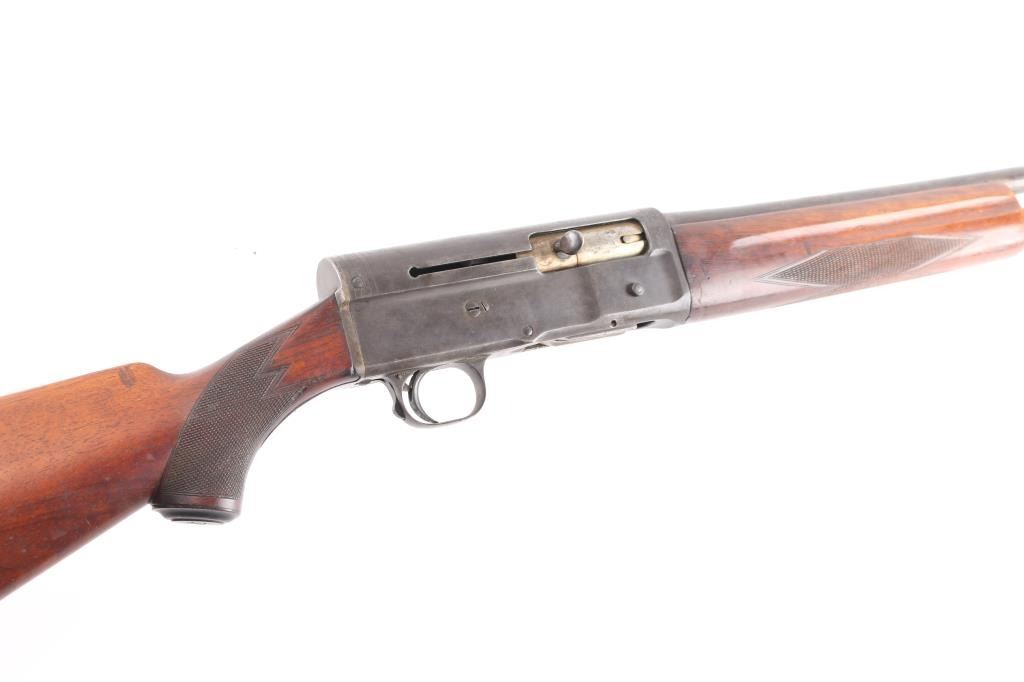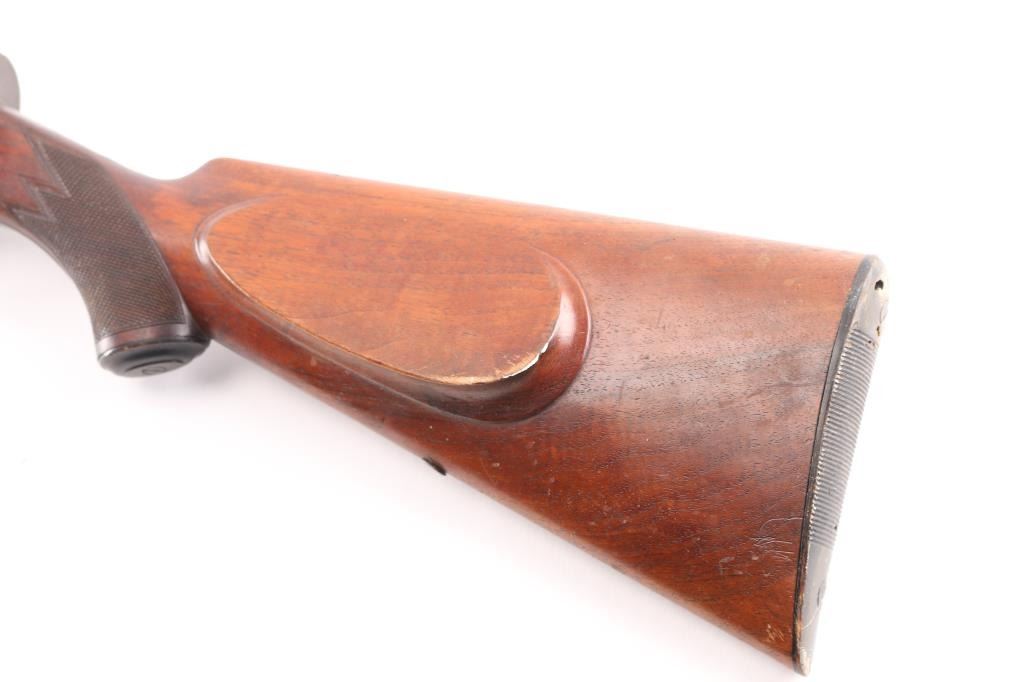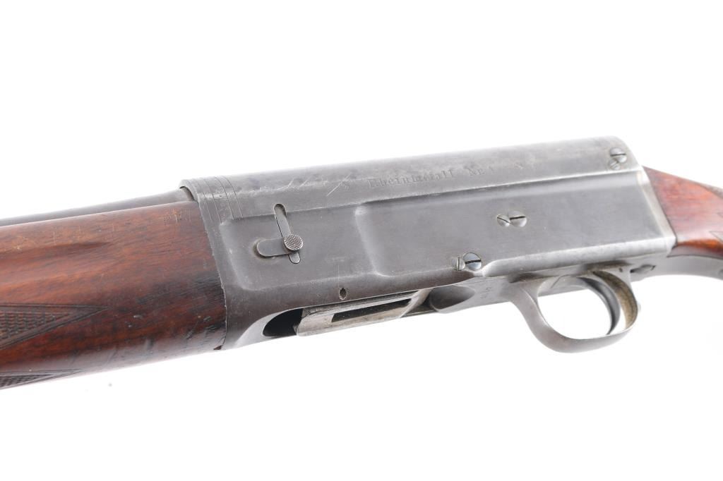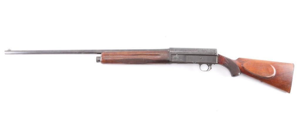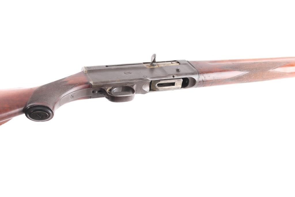 Manufactured 1920’s Dusseldorf, Germany, bottom load semi-automatic shotgun chambered in 16 ga., Cly choke, raised sighting bead. Short 2 9/16" chamber. Design resembles the Browning/FN Auto-5. checkered forearm with grasping grooves, buttstock has checkered grip with bone cap, shadow line cheek rest for right-handed shooting. Bore is excellent/bright, action is crisp, wood is good/sound, minor scratches/dings, composite buttplate has some corrosion and the metal finish has turned a grey patina with some scattered very light pin-prick pitting. LOP is 14 1/4".NRA Condition-Good. C&R Firearm.