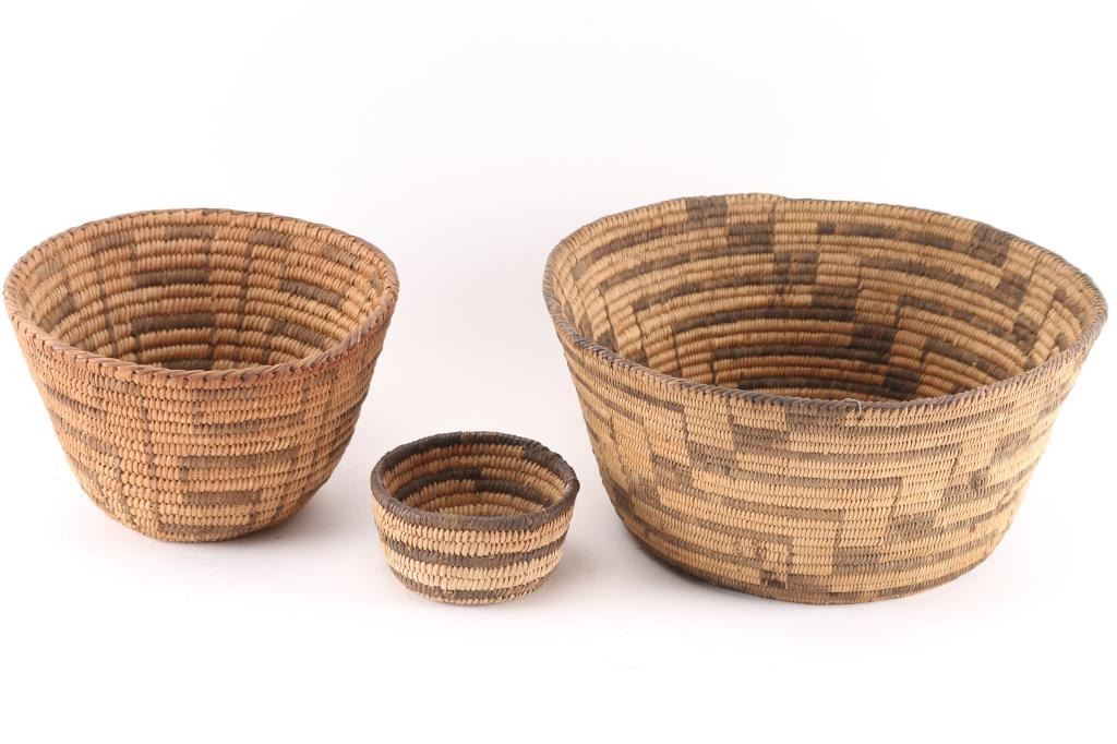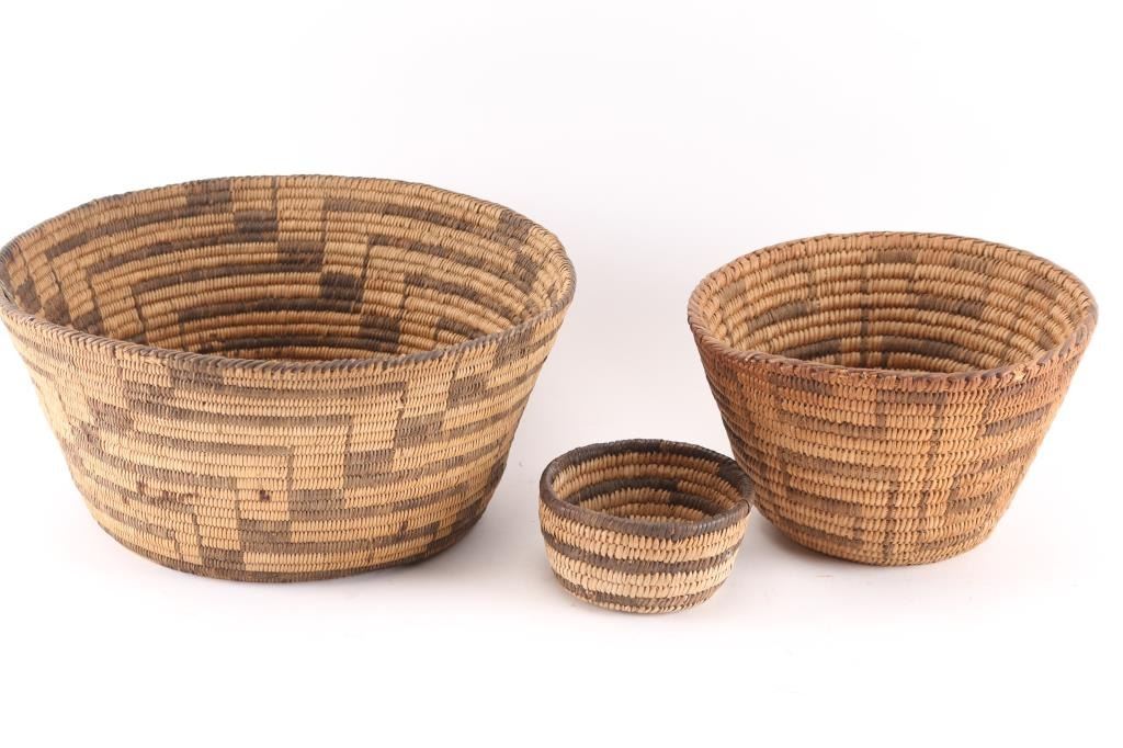 (1) Measures 9 1/2" around and 4 1/2" tall. Some wear at rim and staining at bottom of basket, inside. Nice design. (1) Measures 6 1/2" around and 4" tall. Good condition. (1) Measures 3 1/4" around and 2" tall. Good condition. Small touch of white paint on inside rim.