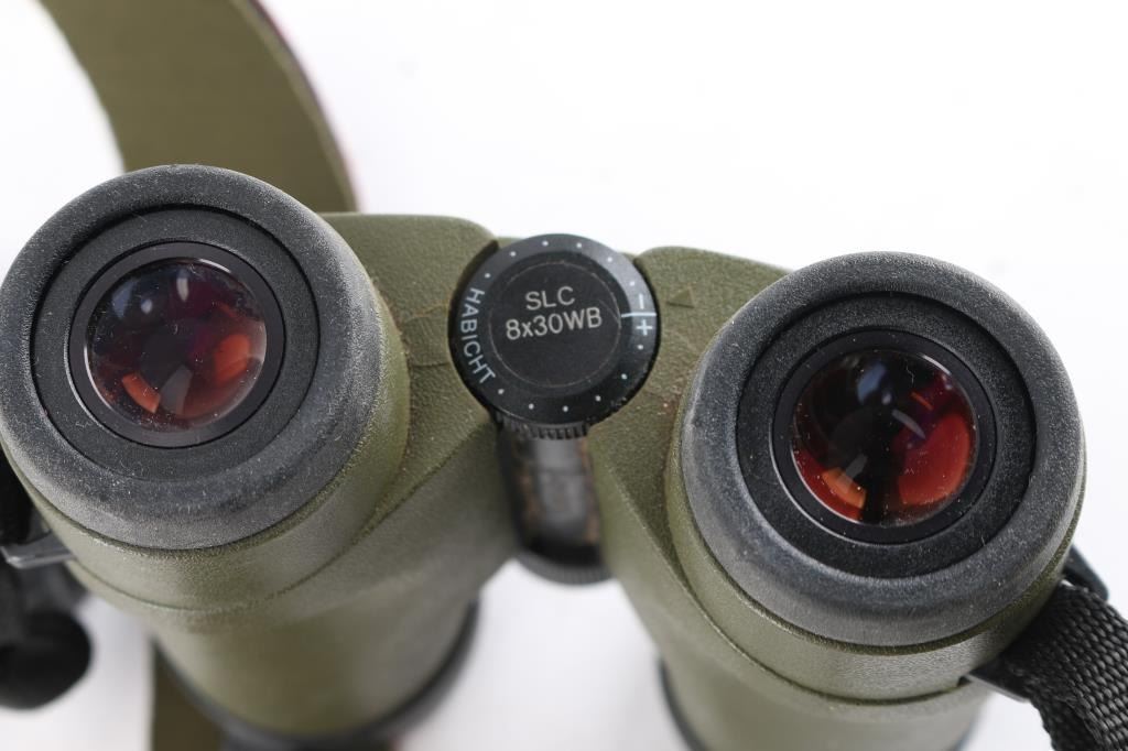 Swarovski Habicht SLC 8x30 WB, olive drab colored armored binocular with black lens covers and black nylon, green/black neoprene straps. S/N: D642542801. Made in Austria. Clear lenses, bright, sharp, true color fidelity, edge clarity, and wide field of view. Body is in very good condition with little to no wear on rubber body armor and paint wear on Swarovski label. Smooth focus knob. Rotating rubber up/down eyecups. Very good to excellent condition.